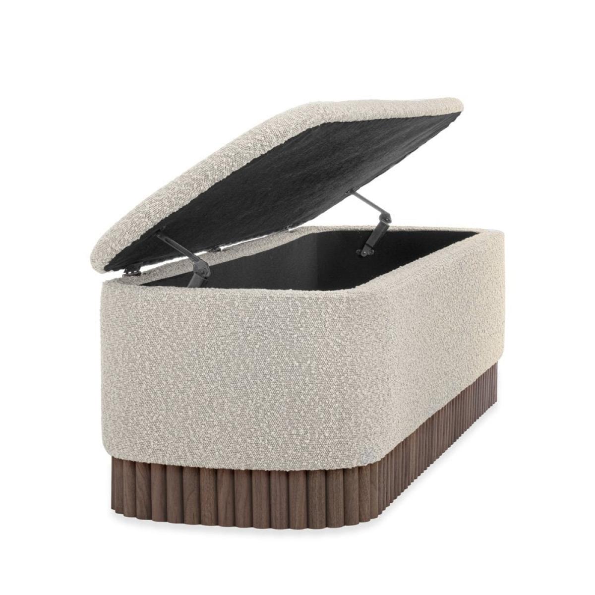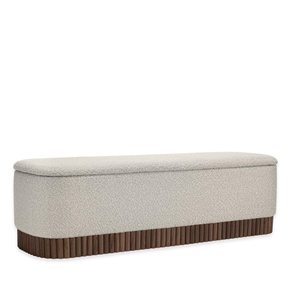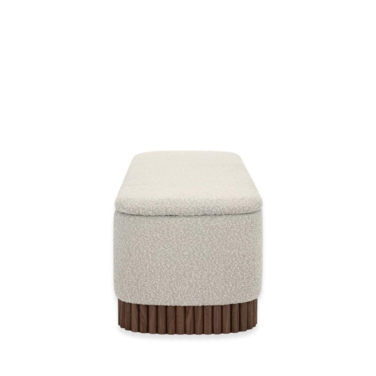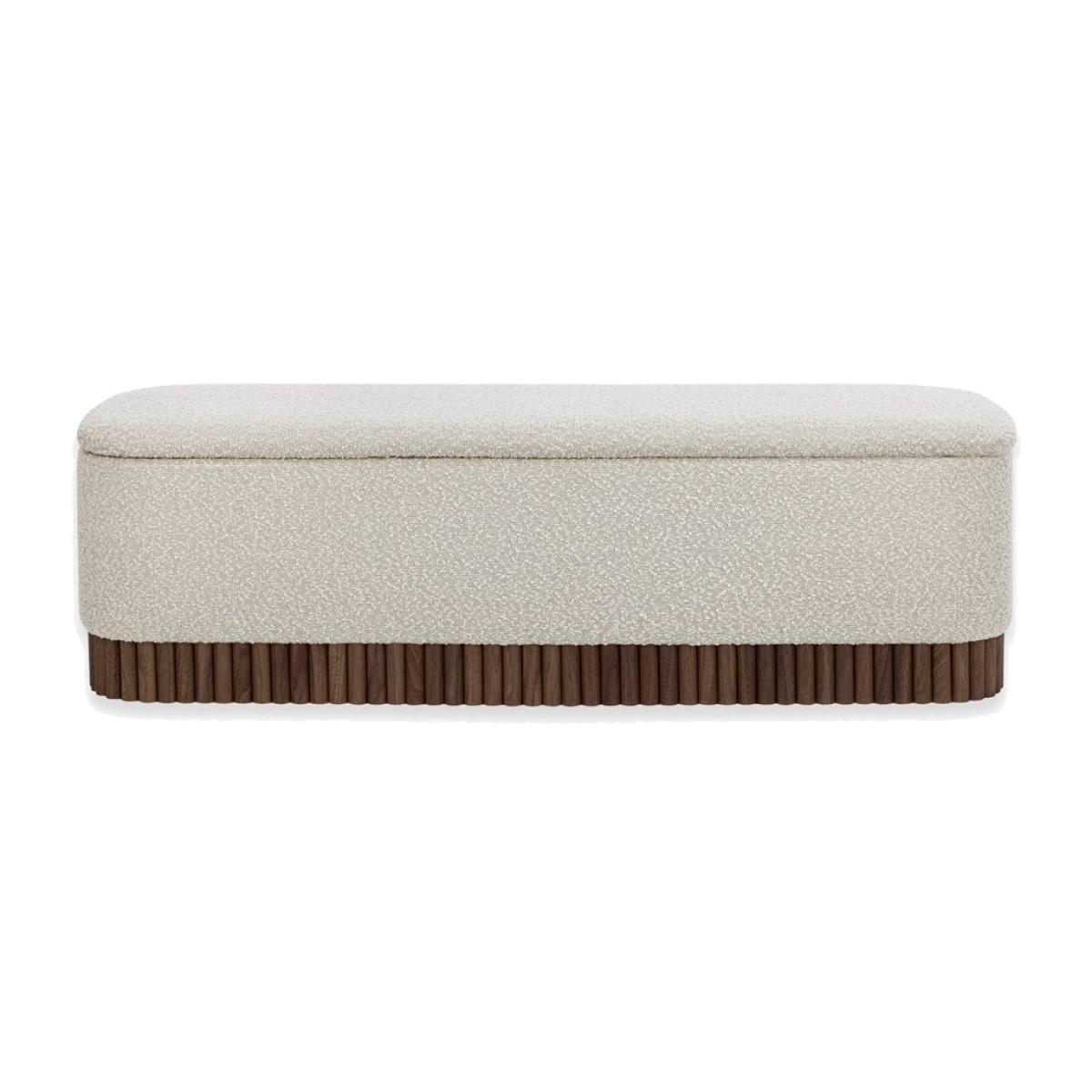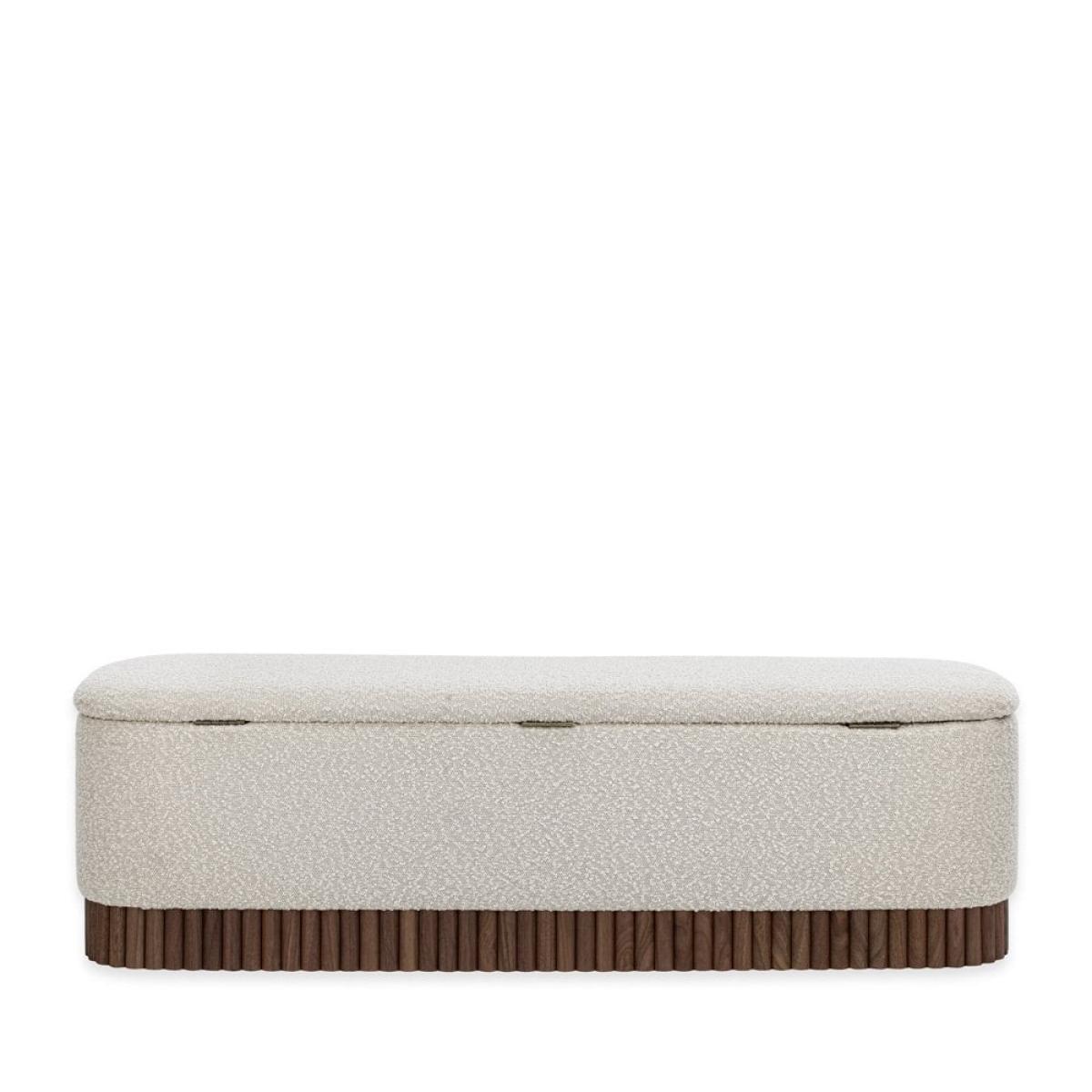 The Oberon Boucle Ottoman uses contrasting textures and a neutral palette that evokes the charm and functionality so interwinned with Scandinavian design. Wrapped in a soft sustainable boucle, this long ottoman has a hinged lid revealing a spacious storage compartment. The contrasting textures just gives Minimalist Modern, from the speckled stone greys and creams to ribbed base detailing.