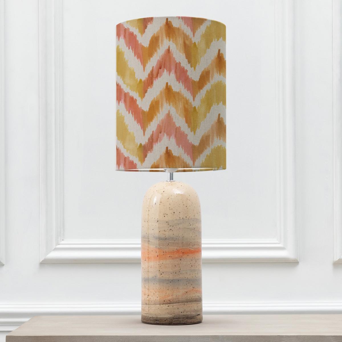 Illuminate your space with the Ocefina Table Lamp, boasting ceramic durability and a sandstone beige finished base that adds warmth to your decor. This table lamp has been paired with the Carrara shade which offers a chic solution with its digitally printed patterned design on woven material. Its hand-rolled edges add a touch of sophistication while providing optimal illumination.