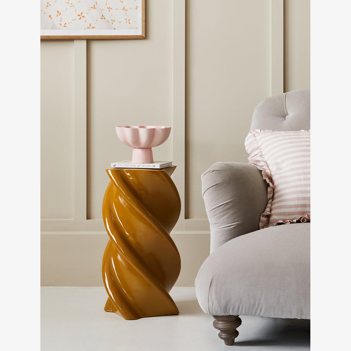 I’m a fan of this ochre twist side table for its sculptural silhouette and rich, glazed finish - it instantly adds character without overwhelming the room. It sits comfortably in contemporary, mid-century or eclectic schemes, especially against muted walls or alongside neutral upholstered pieces. For styling, keep the top clear except for one or two simple accessories - a small plant, a ceramic bowl or a slender lamp. Its compact form makes it ideal as a bedside perch, an occasional table in a hallway or a colourful accent in a reading nook.