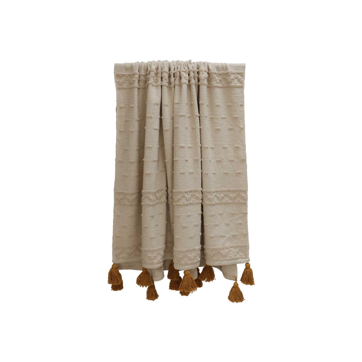 Design. In a cosy cream cotton fabric with eye-catching ochre tassels, this stylish throw is the perfect pop of colour for any modern interior. Draped across a colourful bedspread or paired with yellow cushions on a neutral sofa, this charming throw blanket can be easily re-styled to suit the seasons.