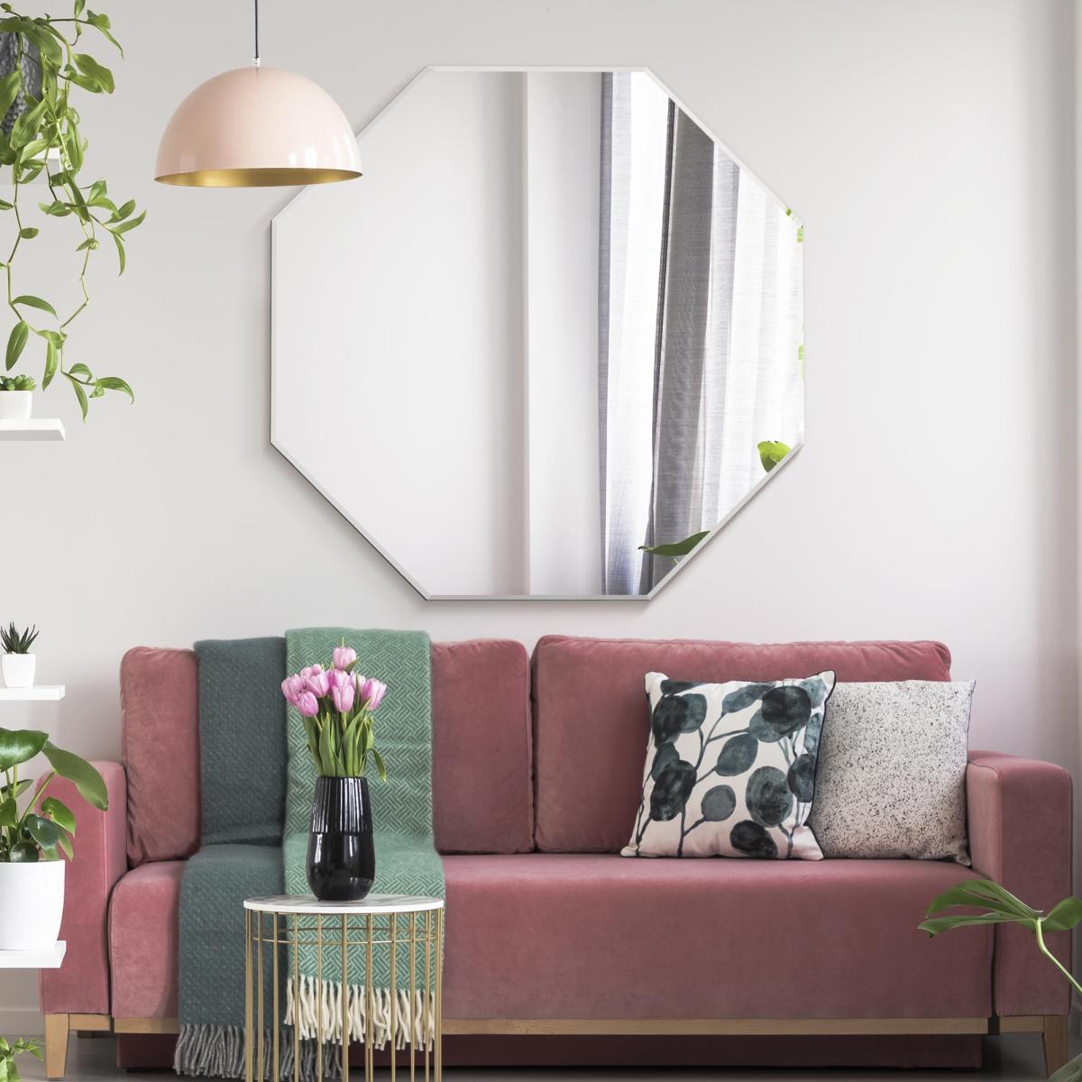 I love this octagonal mirror, often referred to as the Octa all glass modern octagonal wall mirror, for its sleek and contemporary silhouette. Its clear, reflective surface makes it a versatile piece that enhances natural light and creates a sense of space, especially in smaller or darker rooms. It works well in modern or minimalist interiors, but can also add a clean, architectural detail to more eclectic or transitional schemes. Practical styling tips include hanging it above a sofa or console for a focal point, or using multiple in a grouping for visual interest. Its geometric shape lends itself well to balancing softer furnishings, so consider pairing it with textured fabrics or plants to create a polished yet inviting look.