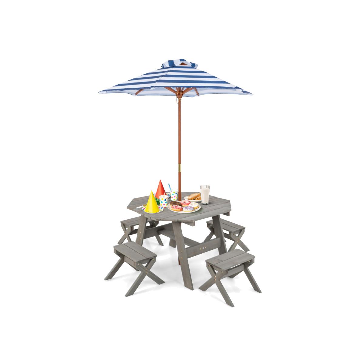 Bring joy to your backyard with our kid's wooden picnic table set! The 6-piece kids octagon table set comes with 1 table, 1 umbrella, and 4 chairs, providing a flexible seating arrangement for 4 children. The removable and foldable umbrella can be adjusted in diameter (127/130 cm) to cater to different needs. Crafted from safe fir wood treated with water-based paint, the outdoor table and chairs feature resistance to wear, cracking, and fading. Both the table and each chair support up to 100 kg.