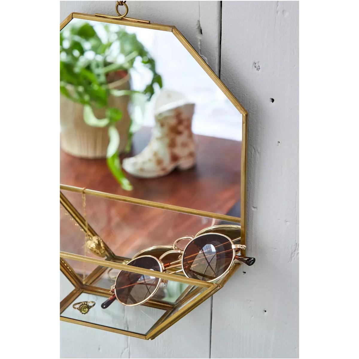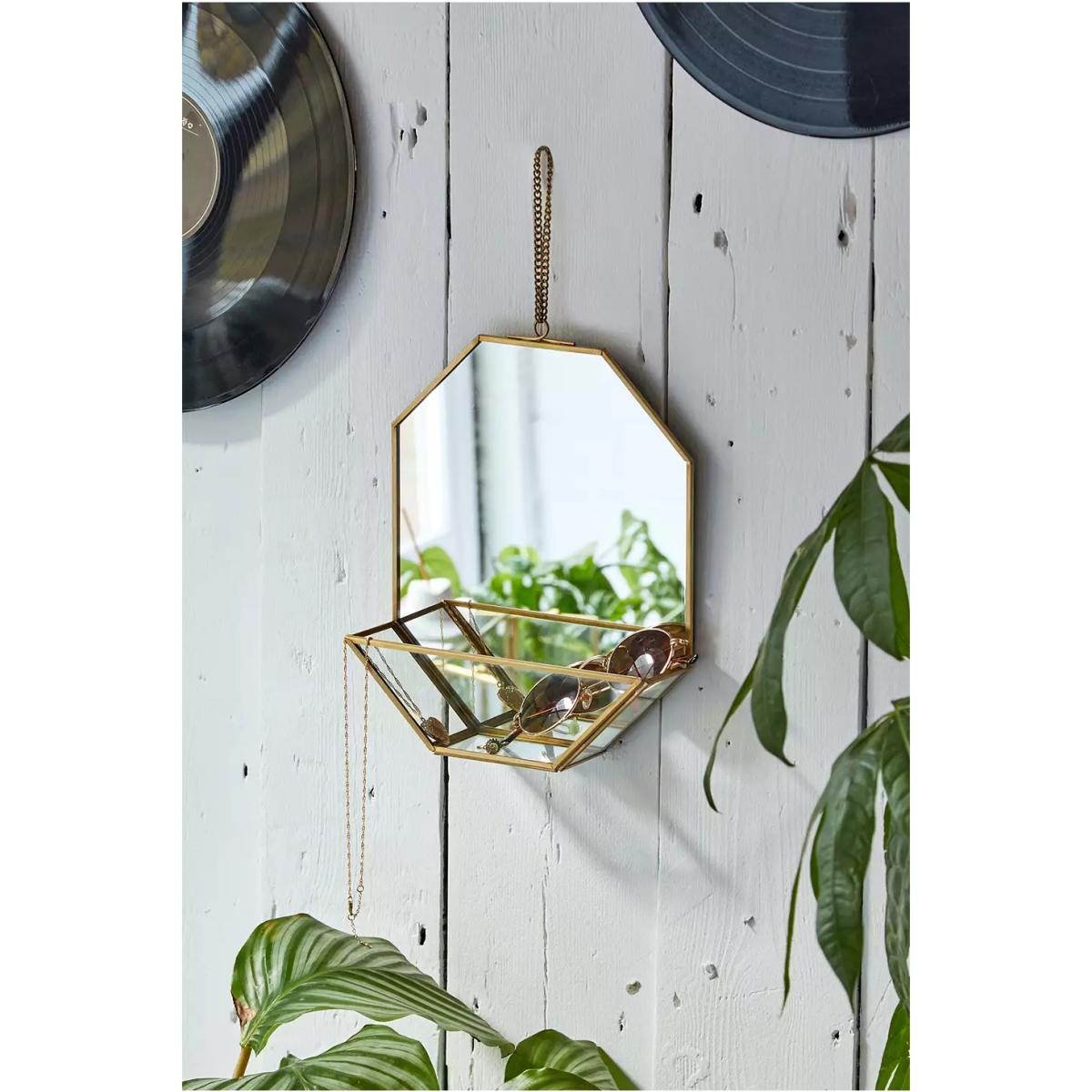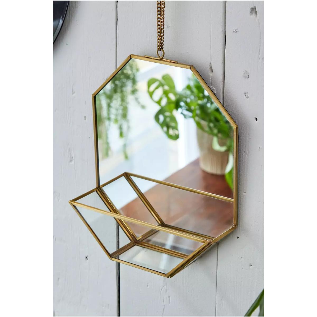 Add hanging shapes to your wall space. Brass frame construction with an octagonal silhouette and mirrored centre. Topped with a glass-cased shelf to hold your essential trinkets. **Content + Care** \- Brass, Glass \- Wipe clean