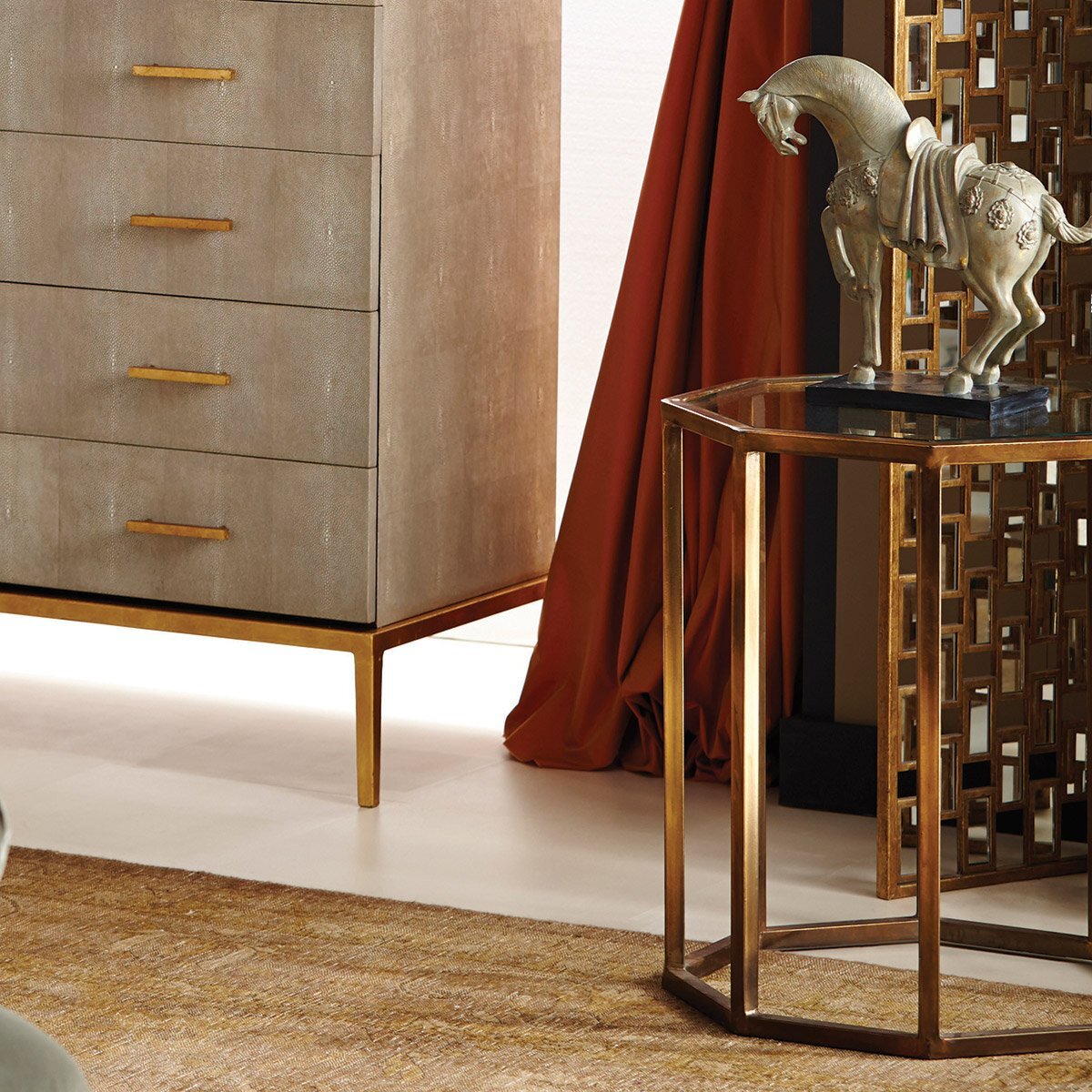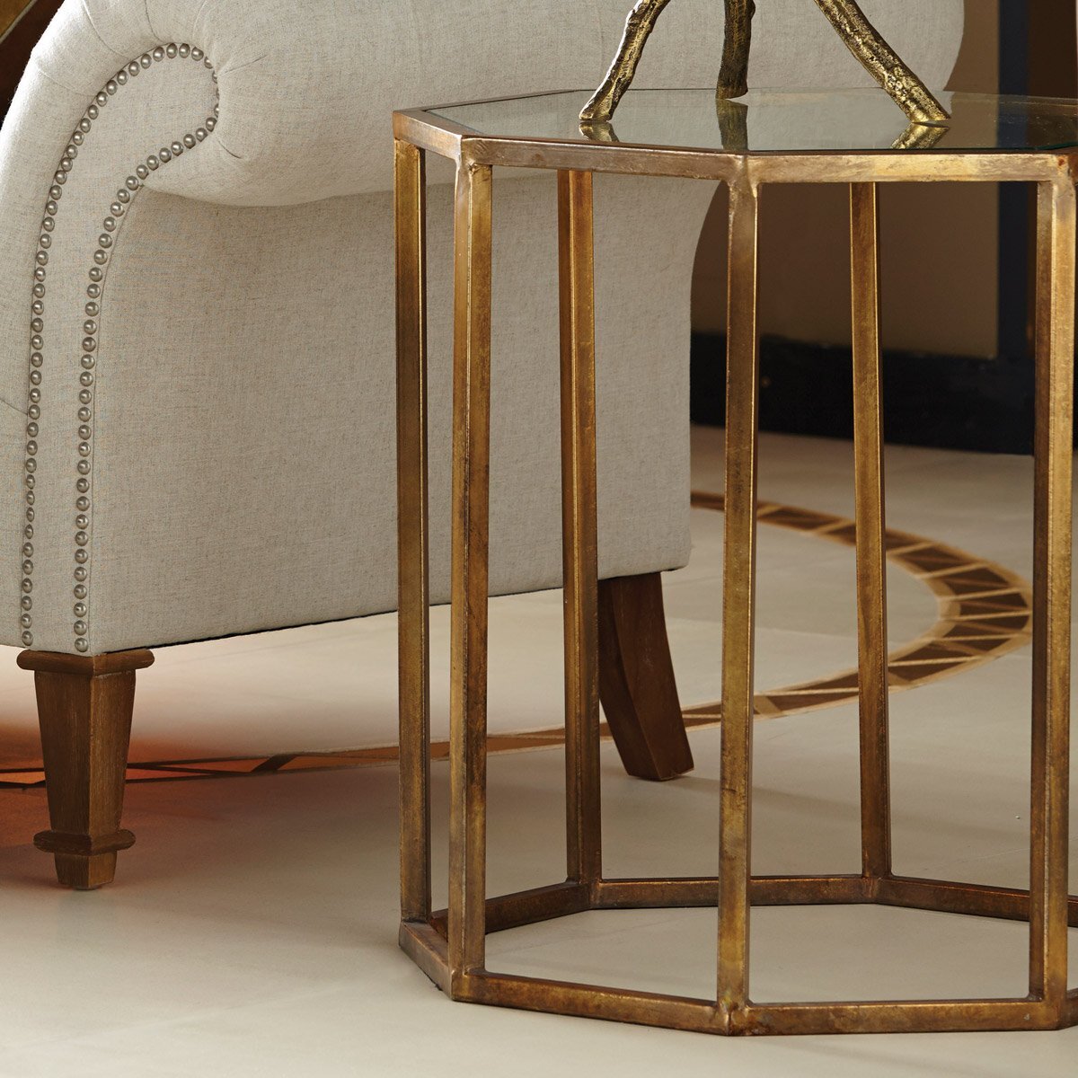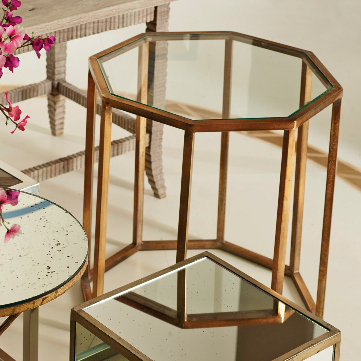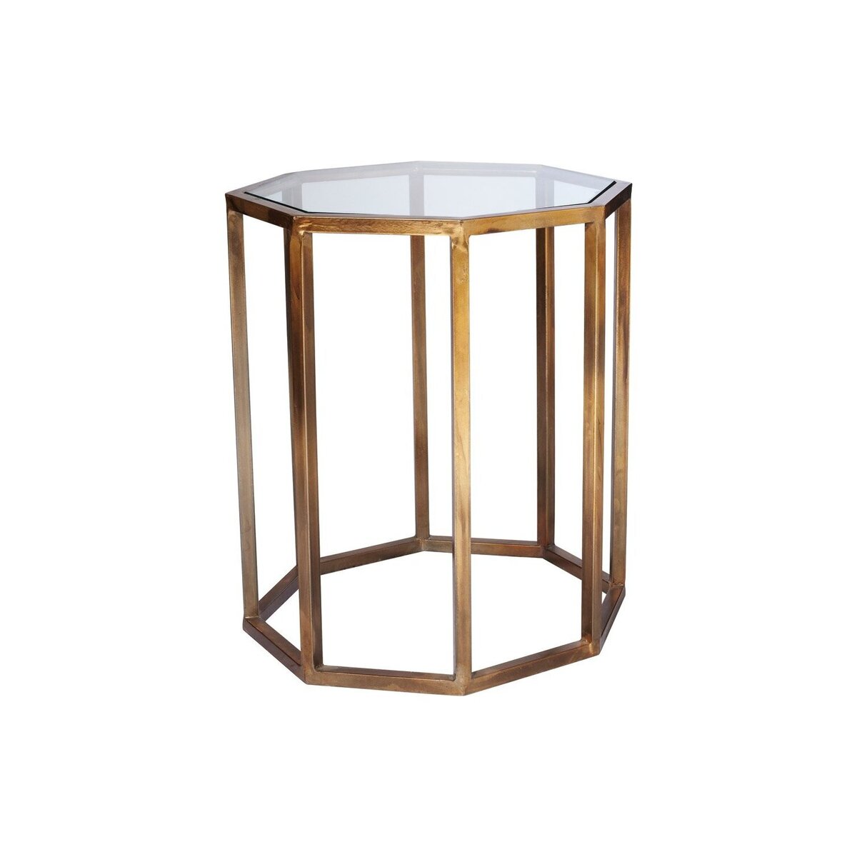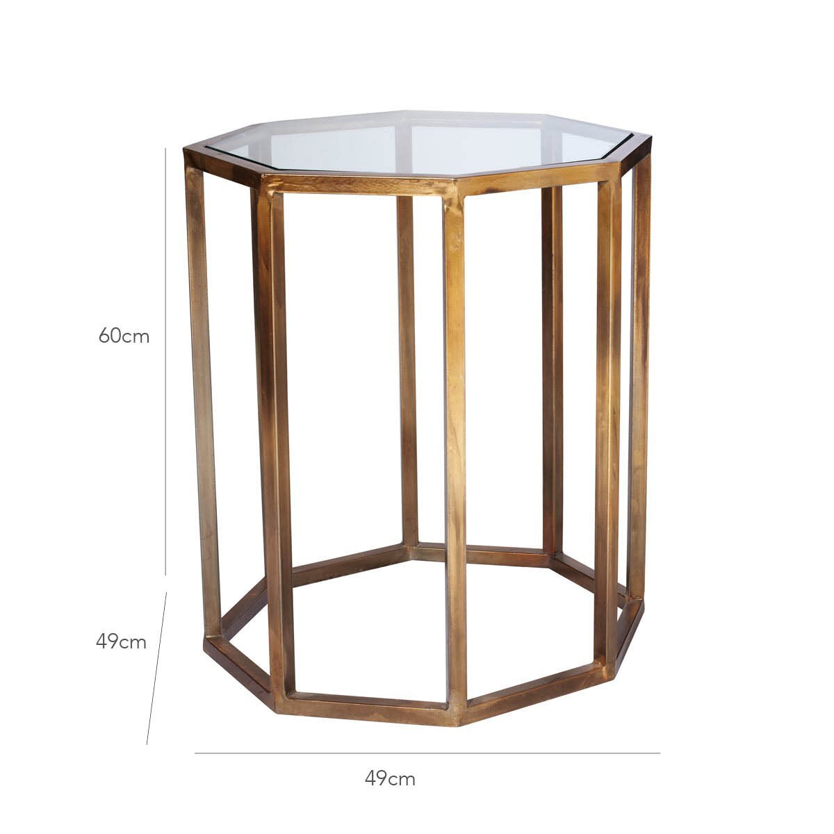 An octagon shaped side table with an antiqued brass metal frame and an inset glass top. Consider it as an alternative to the traditional square side table, as the unusual shape means it can fit into more awkward spaces.