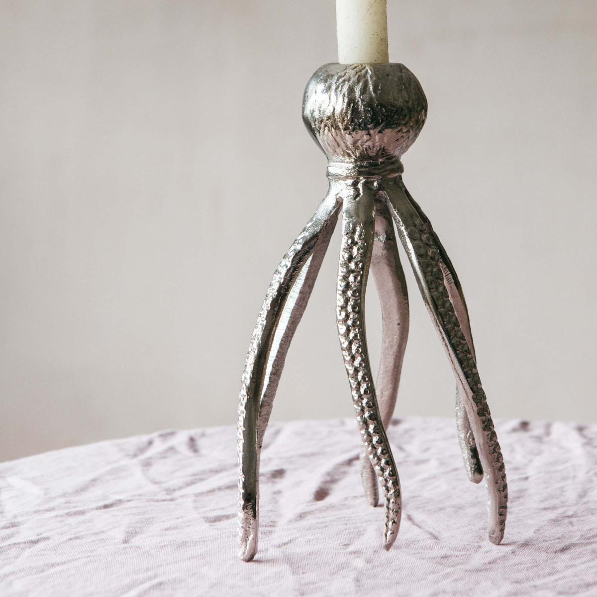 A quirky candle holder inspired by cephalopods, made of recycled aluminium with a textured nickel finish. Style your dining table with a squid or an octopus or two and top with vibrant coral-coloured candles for an eye-catching look.