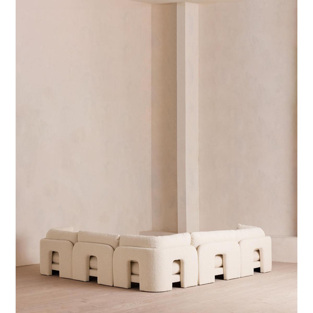 Designed to be configured to your living space with individual modules, now built with a deeper sit than the original. A new introduction to our original Odell sofa range, this modular design has a deeper sit for enhanced lounging. Fully upholstered in natural boucle and finished with feather-wrapped cushions, its low profile is characterised by a unique arched back with cut-out detailing to create a focal point from every angle.