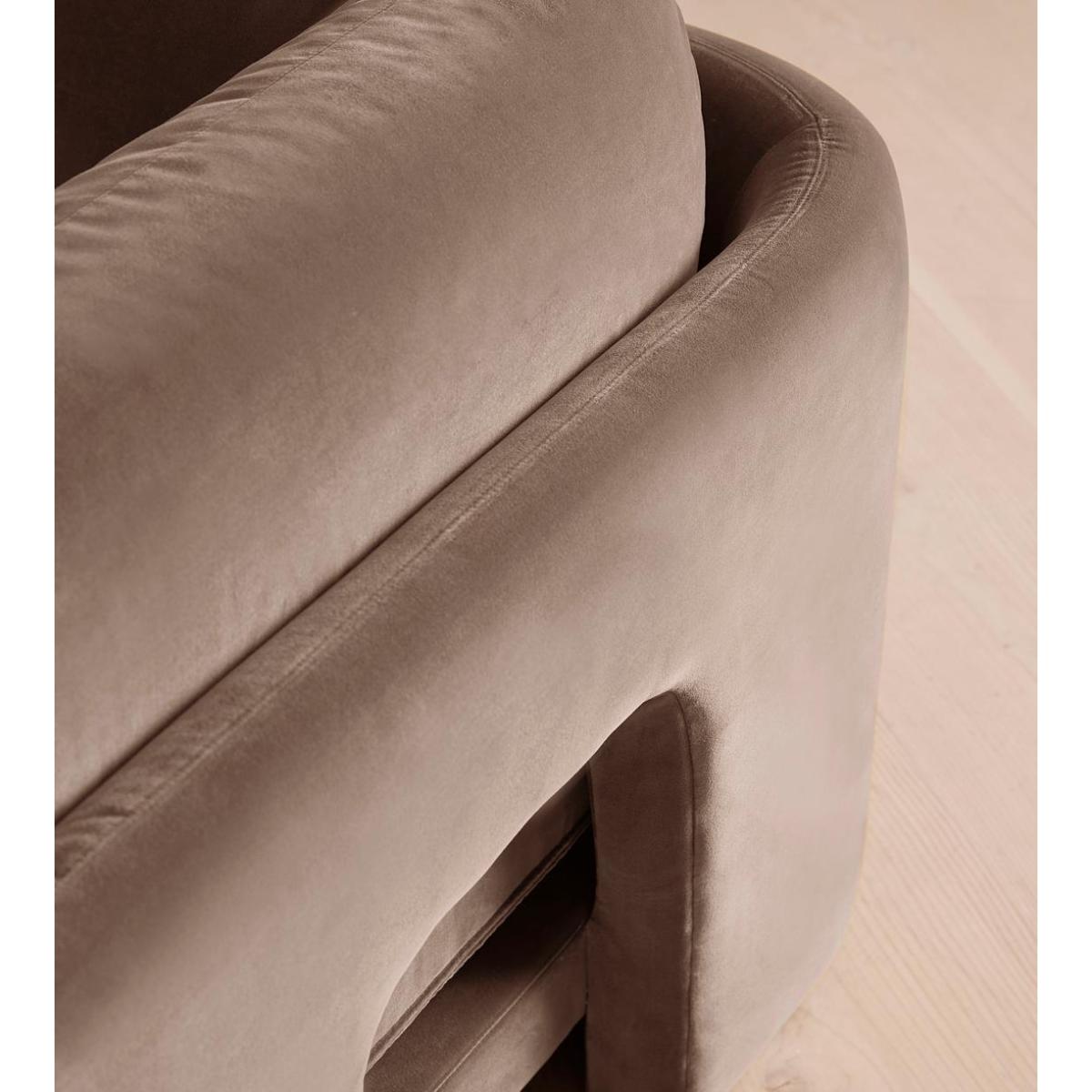Designed to be configured to your living space with individual modules, now built with a deeper sit than the original. A new introduction to our original Odell sofa range, this modular design has a deeper sit for enhanced lounging. Fully upholstered in velvet and finished with feather-wrapped cushions, its low profile is characterised by a unique arched back with cut-out detailing to create a focal point from every angle.