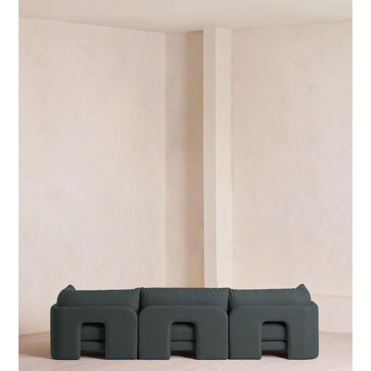 Designed to be configured to your living space with individual modules, now built with a deeper sit than the original. A new introduction to our original Odell sofa range, this modular design has a deeper sit for enhanced lounging. Fully upholstered in linen and finished with feather-wrapped cushions, its low profile is characterised by a unique arched back with cut-out detailing to create a focal point from every angle.