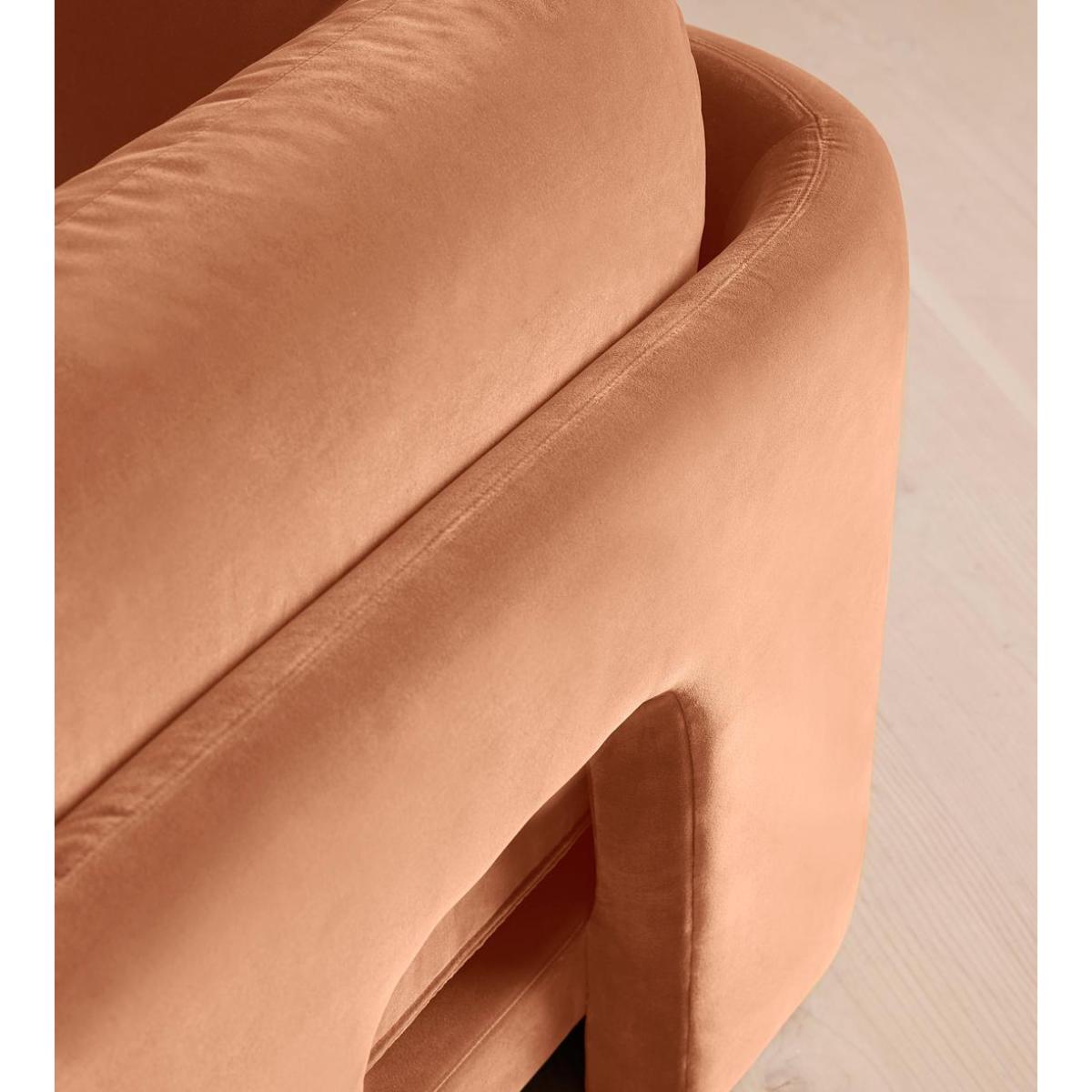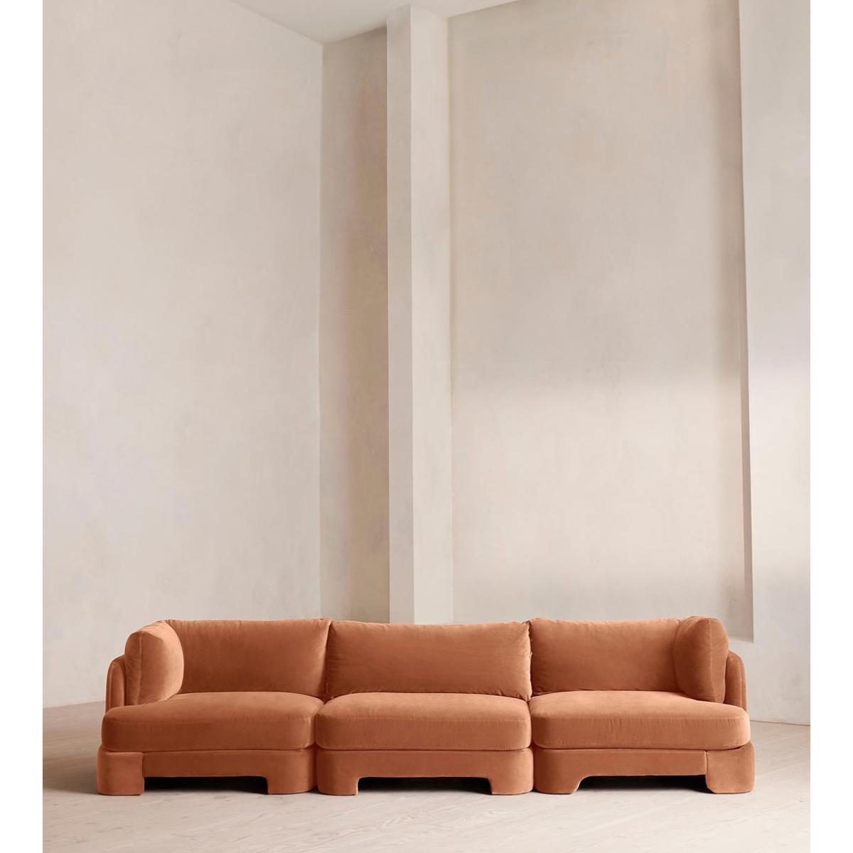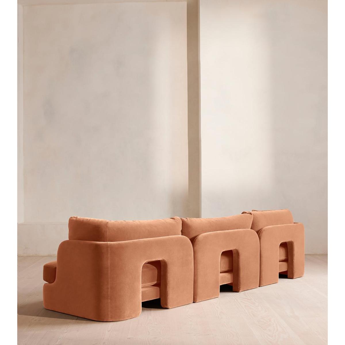Designed to be configured to your living space with individual modules, now built with a deeper sit than the original. A new introduction to our original Odell sofa range, this modular design has a deeper sit for enhanced lounging. Fully upholstered in velvet and finished with feather-wrapped cushions, its low profile is characterised by a unique arched back with cut-out detailing to create a focal point from every angle.