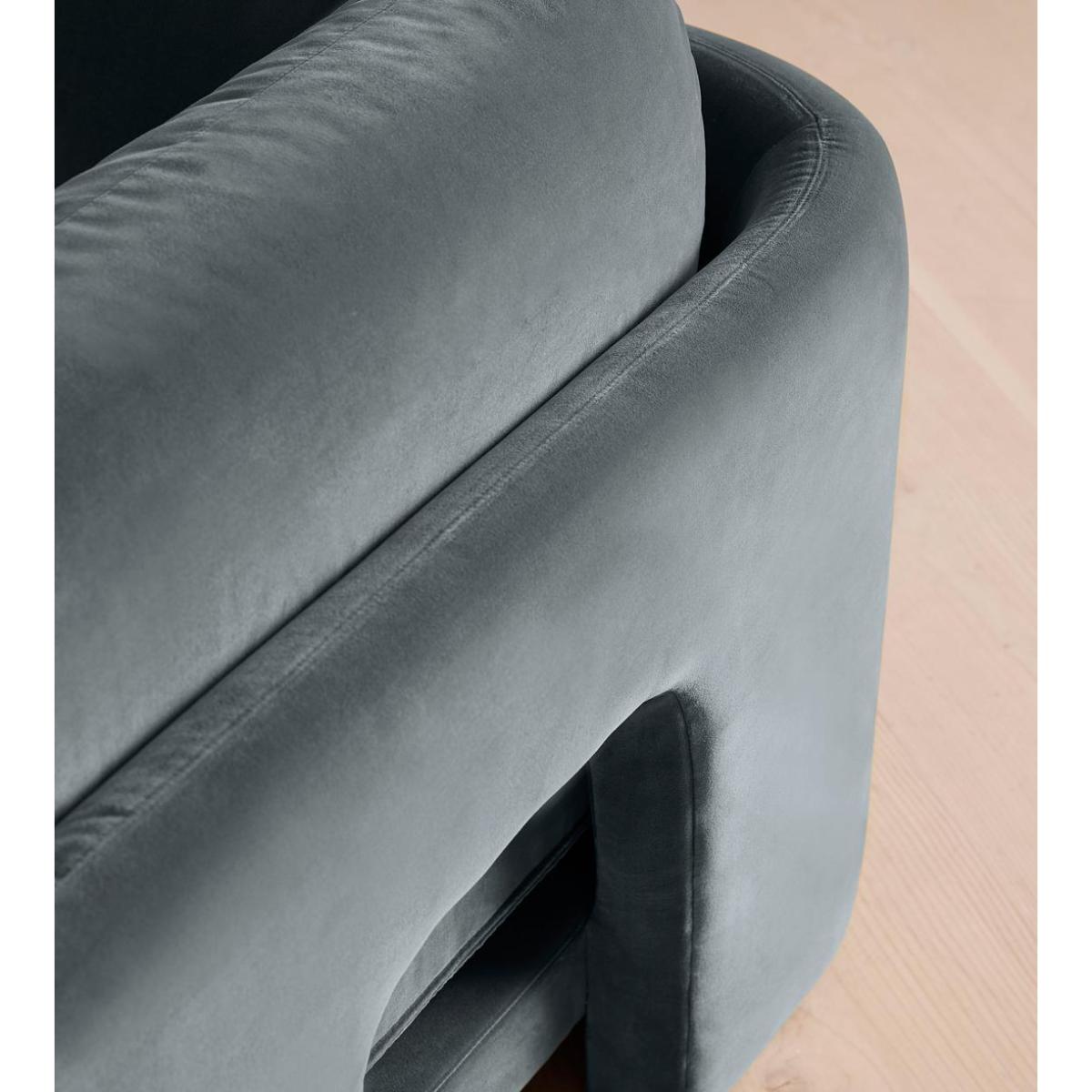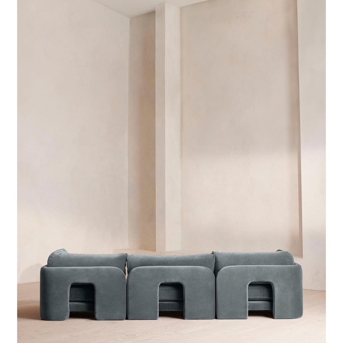 Designed to be configured to your living space with individual modules, now built with a deeper sit than the original. A new introduction to our original Odell sofa range, this modular design has a deeper sit for enhanced lounging. Fully upholstered in velvet and finished with feather-wrapped cushions, its low profile is characterised by a unique arched back with cut-out detailing to create a focal point from every angle.