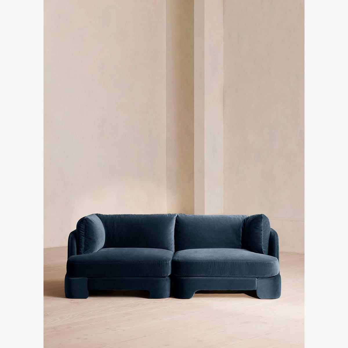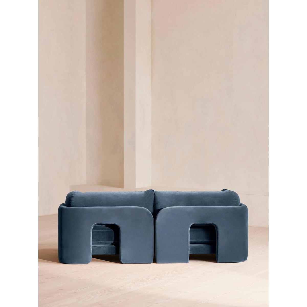 The unique Cut-out arch back and low profile of our Odell modular sofa mirror the retro-inspired interiors of 180 House. Fully upholstered in rich velvet, this style allows you to configure the size and orientation to your individual living space with three modules. Feather-wrapped foam cushions provide all-day comfort when a weekend of lounging calls.