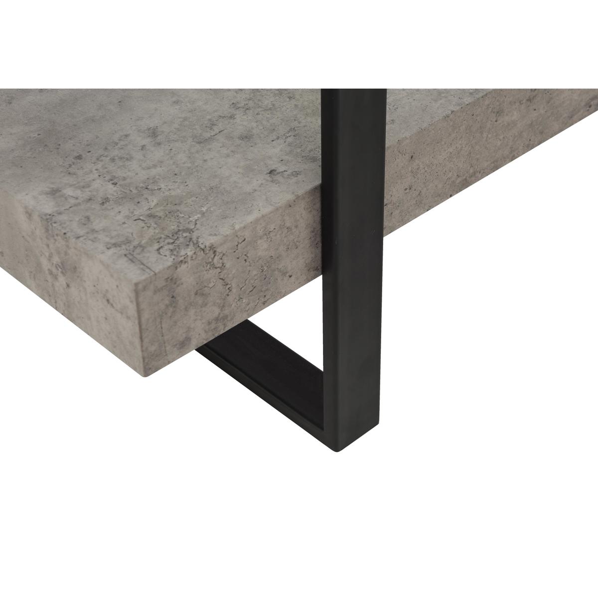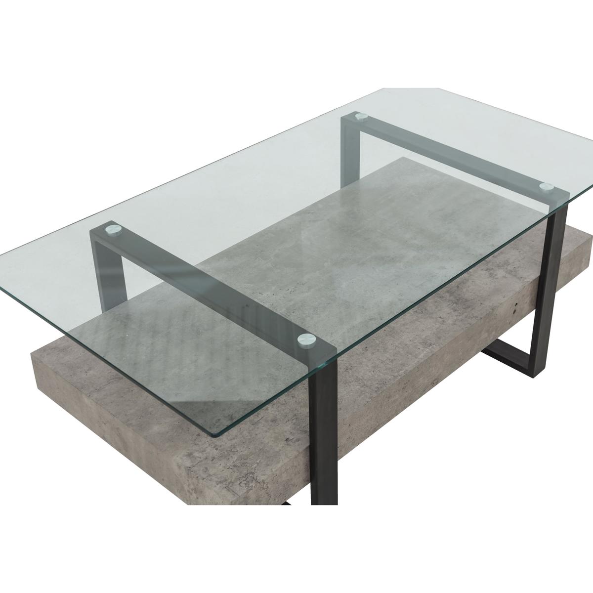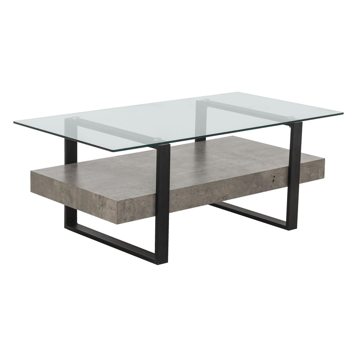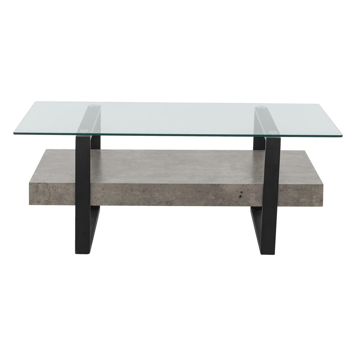 Bold industrial- style occasional table Mixes metal, glass and concrete- effect finish Contemporary style at a great- value price Bold, distinctive and stylish the industrial look is so on trend right now. Combining natural materials like glass and metal, its an easy look to love as it adds warmth and creative style to living spaces. The Odense coffee table is a great example. The rectangular easy- care glass table top is supported by two frames made of sturdy powder- coated steel finished in black. A robust lower shelf with an attractive concrete- effect finish doubles this tables functional space. Use the top for display or for items that you want handily within reach, while the lower shelf is a great place to stack magazines and books. The mix of materials, textures and finishes quickly places this stylish coffee table at the very centre of the industrial trend. Its a look that works very well with relaxed leather furniture. The Odense coffee table is part of the Odense collection of occasional tables. The range also includes a lamp table and a console table so you can enjoy cool industrial style throughout your home and at a great- value price. Top tip: To clean the concrete- effect shelf, use a non- abrasive dry cloth.