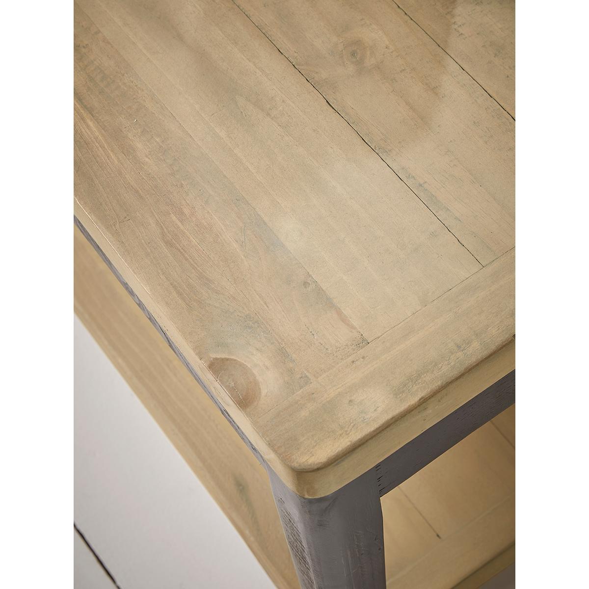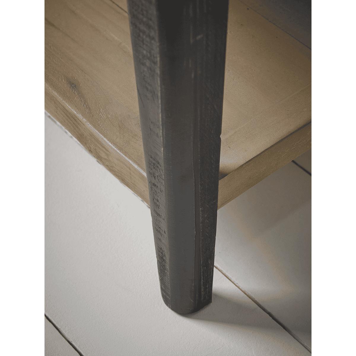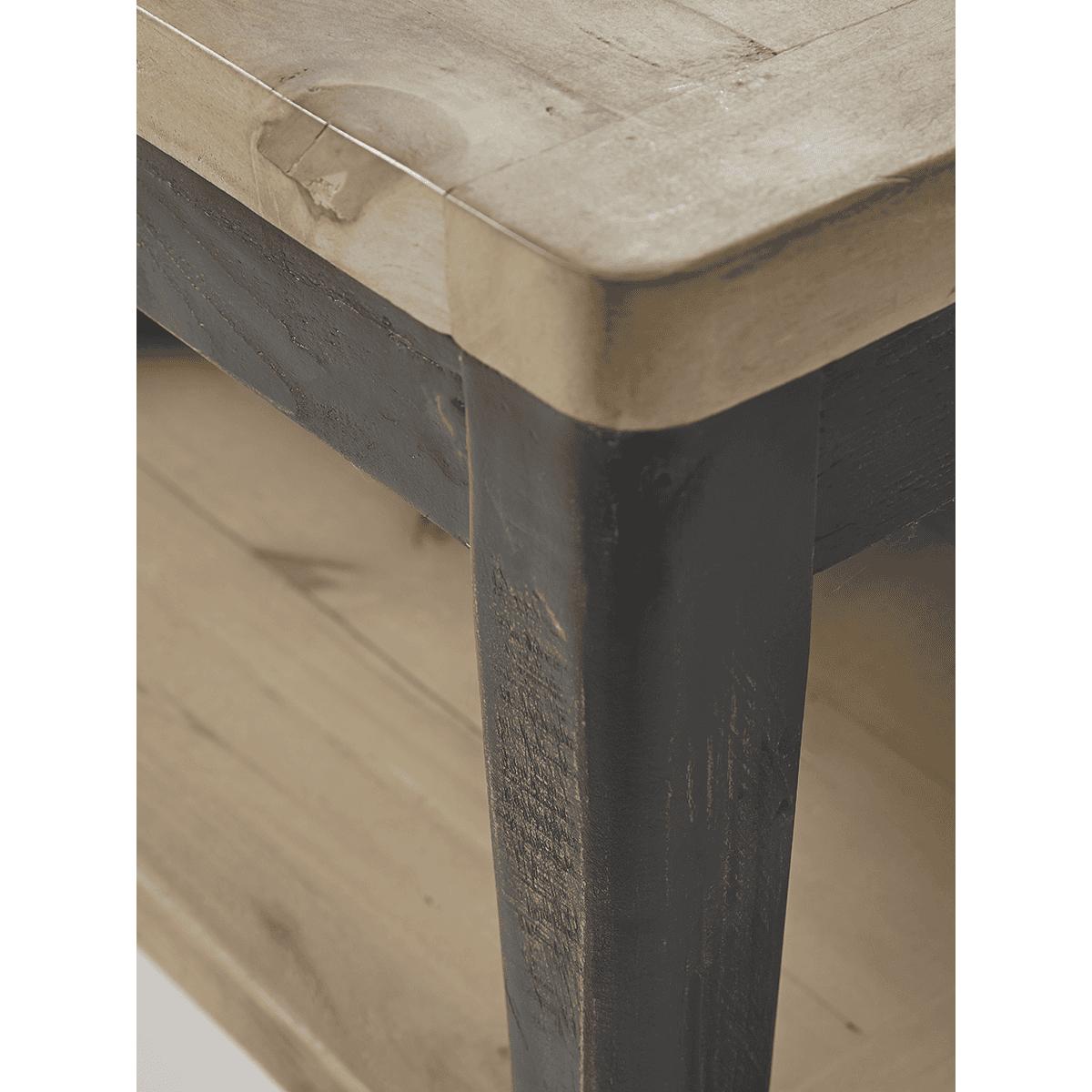 A striking mixture of reclaimed and dark stained wood, reeded glass and iron hardware combine to give the Odense furniture range a contemporary rustic charm. The coffee table is a rugged strong-lined piece, with a character filled reclaimed wood top and lower shelf set upon sturdy contrasting dark legs.