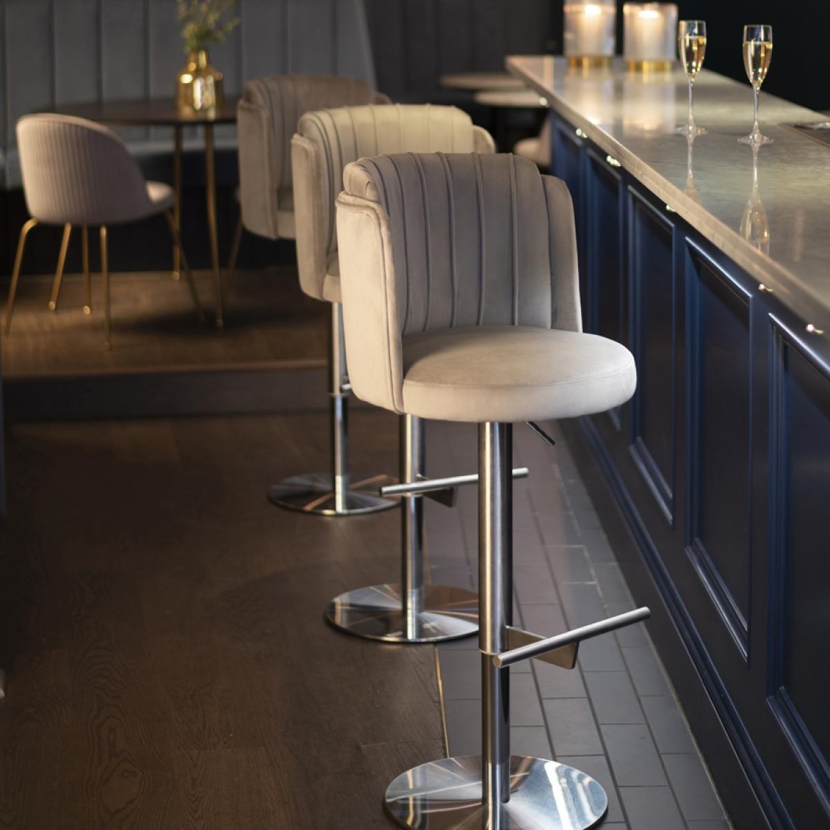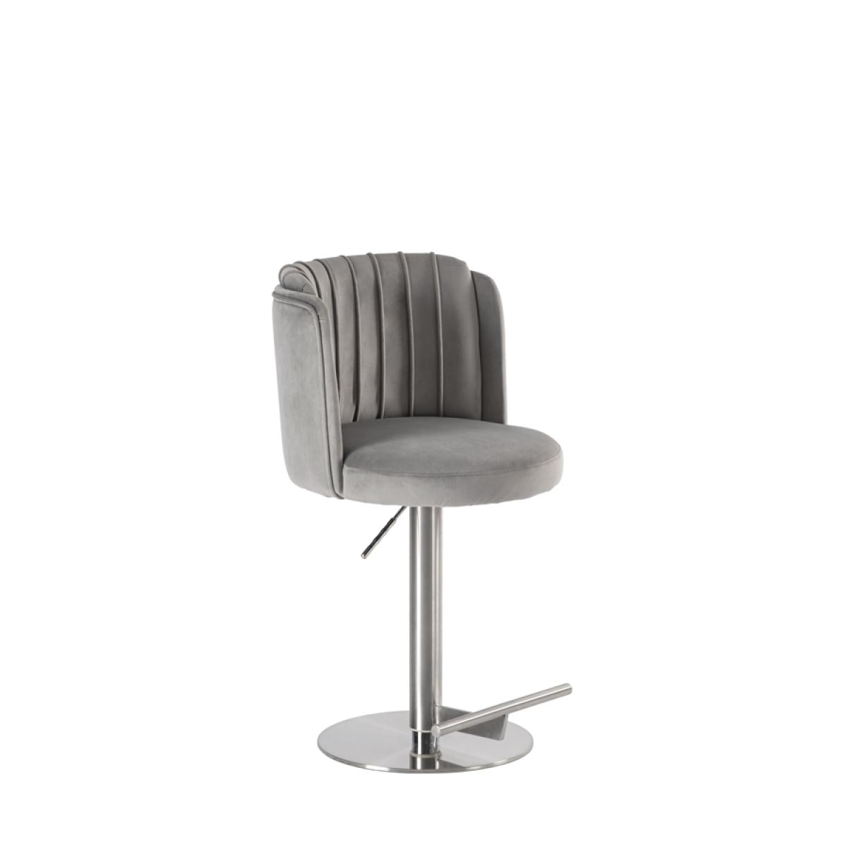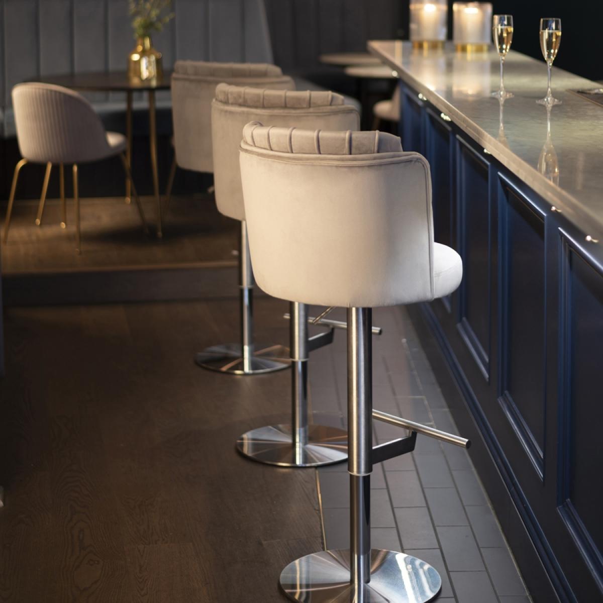 Inspired by glamourous 1930’s Hollywood interiors. Brushed stainless steel base with height adjust and swivel functions. Suitable for use as a bar or counter stool. Distinctive multi-layer upholstery design with elegant piping details. Velvet upholstery fabric.