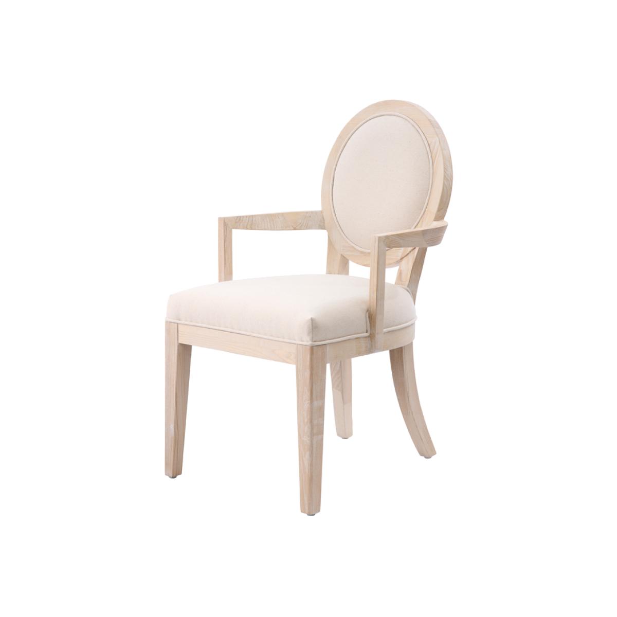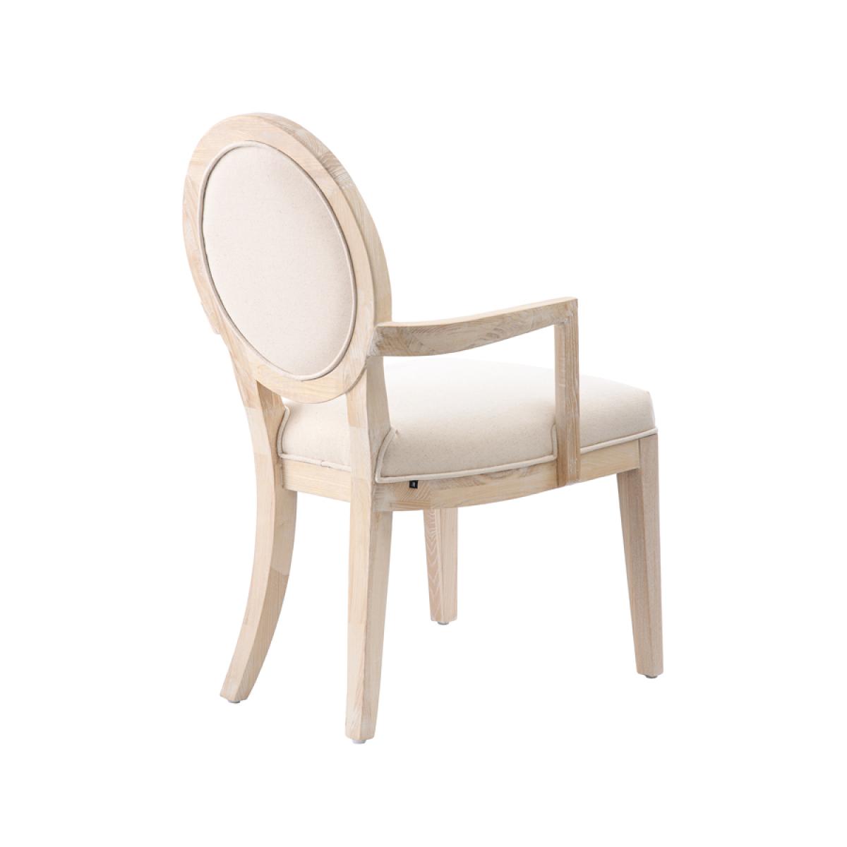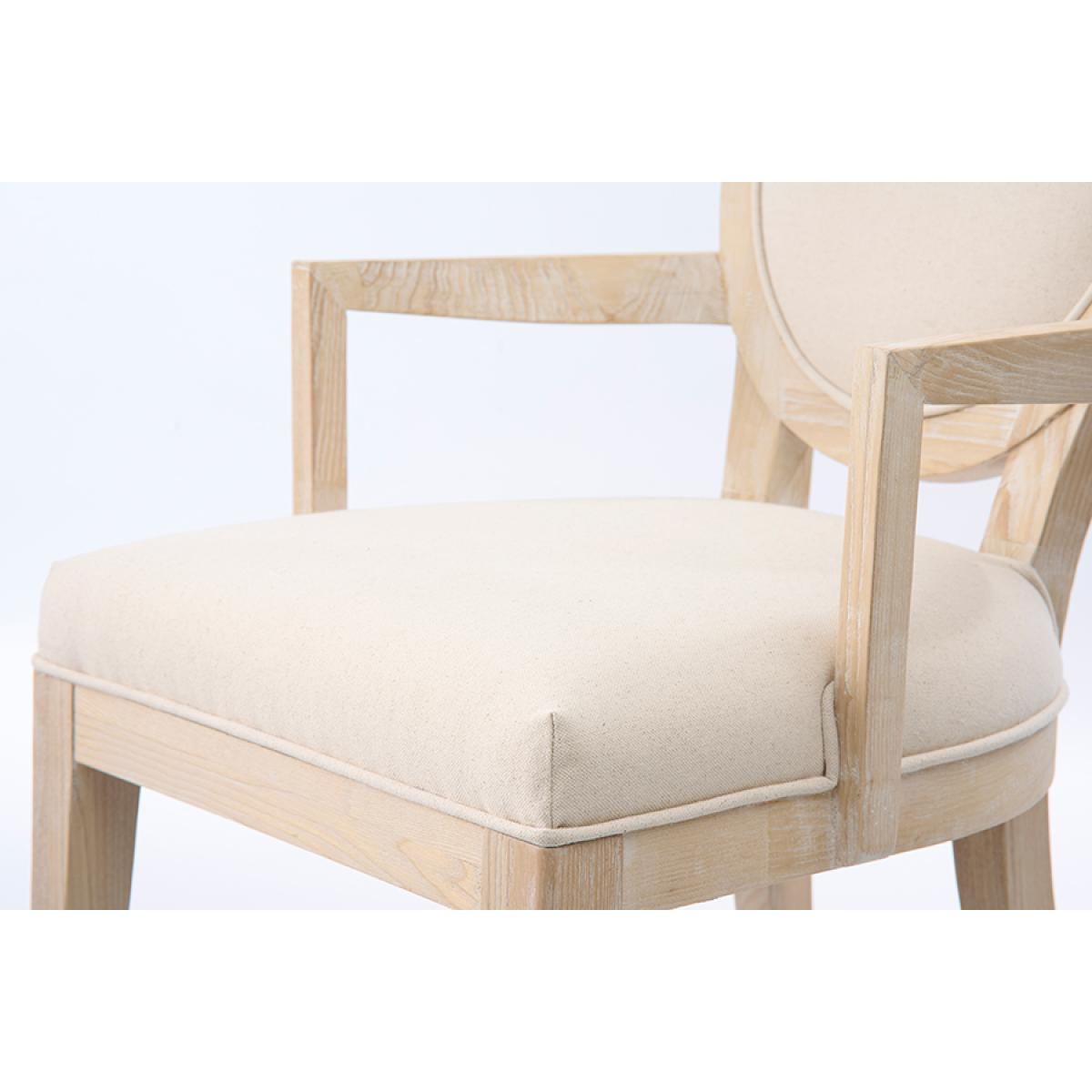 Neoclassical style carver chair with charming rustic appearance. Solid ash wood frame with a distressed and lime-washed finish. Comfortable sprung and padded seat. Oatmeal-coloured linen mix fabric. Supplied fully assembled.