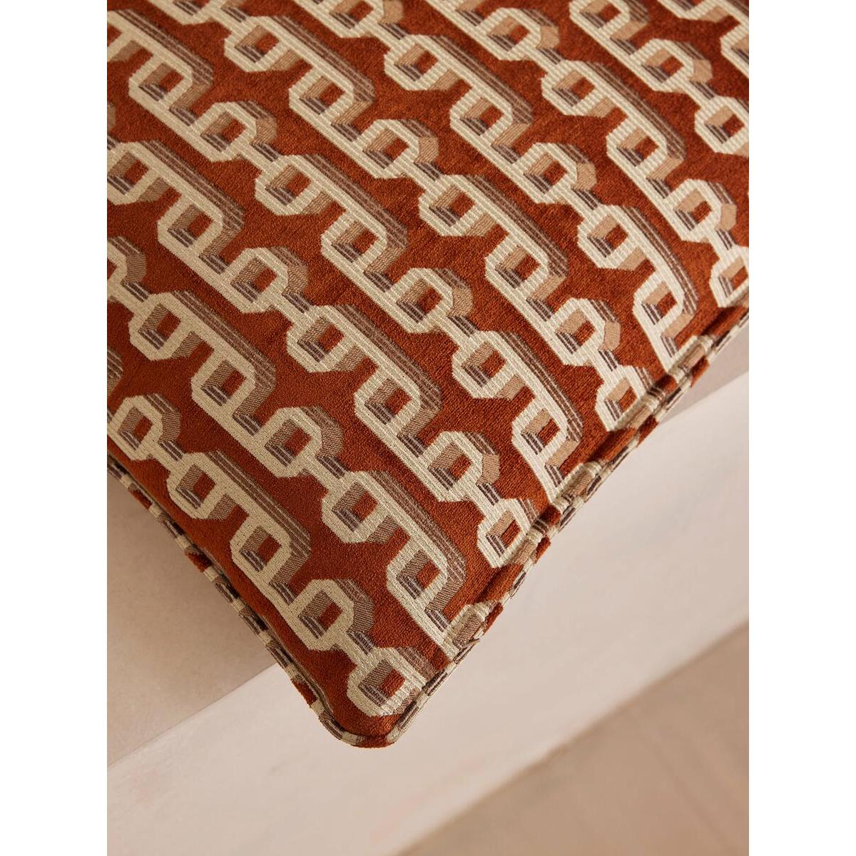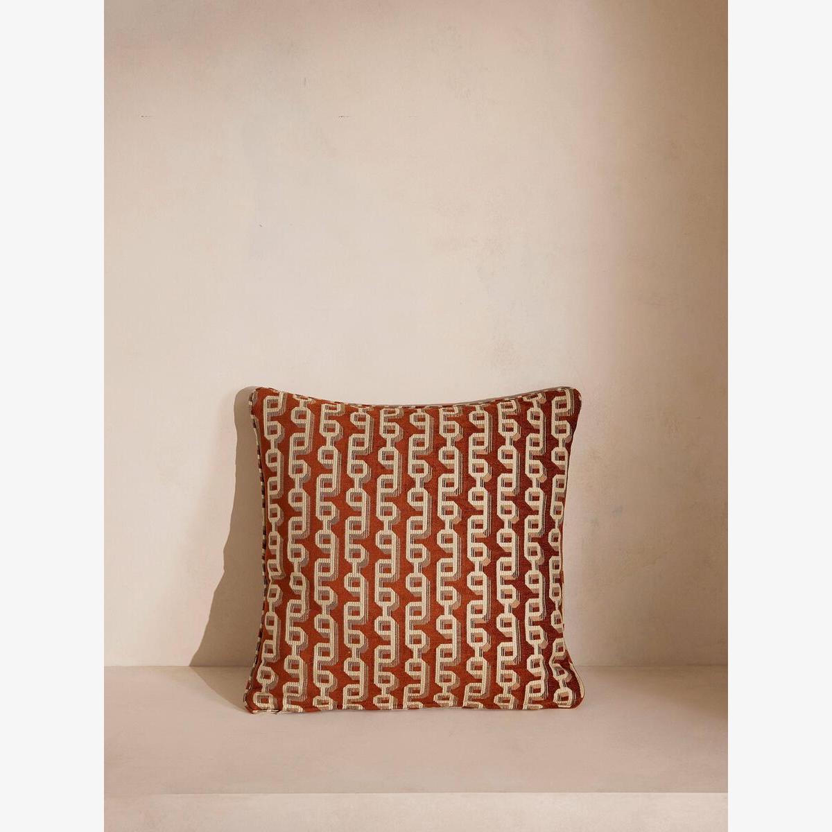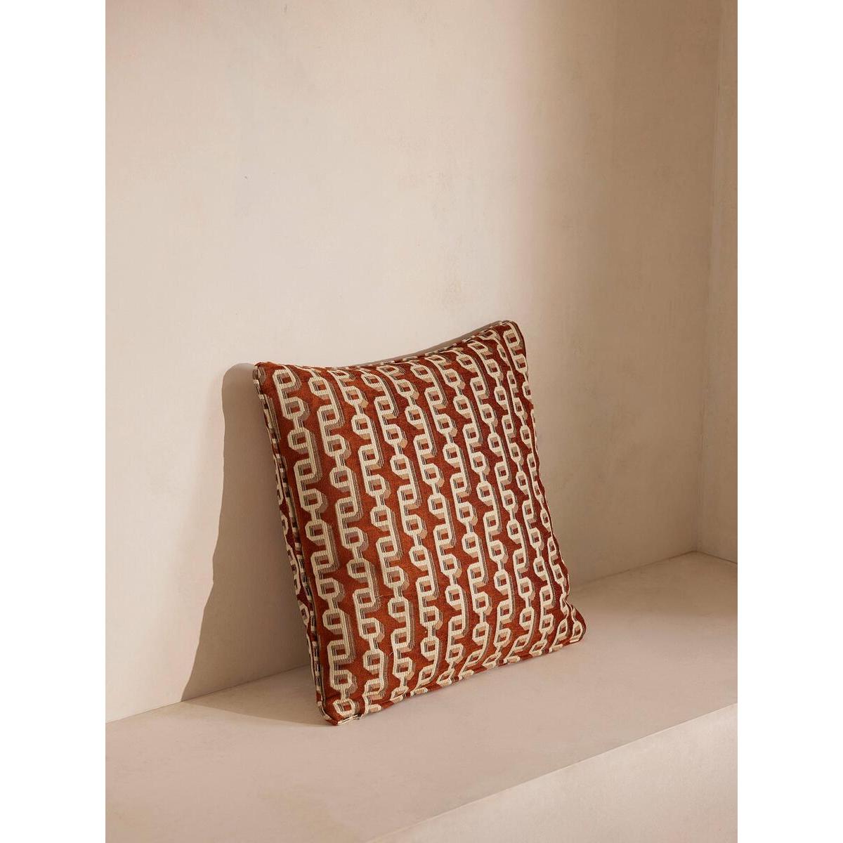 Designed in-house, our Odette cushion features geometric chain links on a rich rust velvet ground, adding warmth and glamour to any setting. Taking inspiration from similar patterns seen in White City House, it's woven in Turkey from a jacquard fabric with self-piping for a clean, refined finish. Woven jacquard cushion Geometric pattern Designed in-house Woven in Turkey Finished in the UK Self-piping Inspired by White City House
