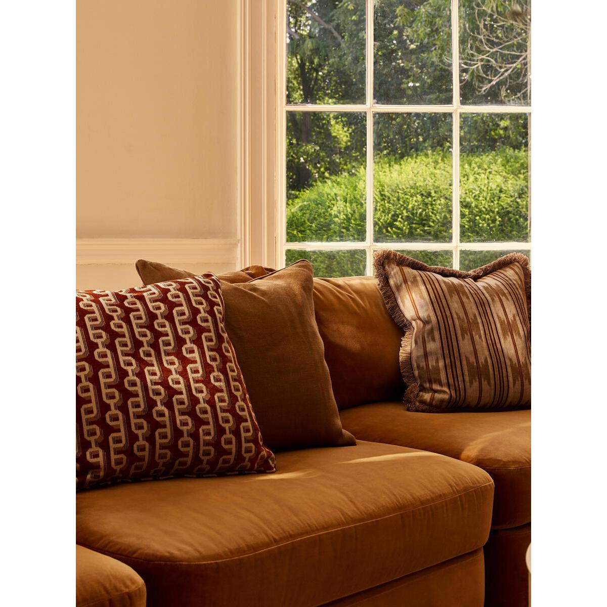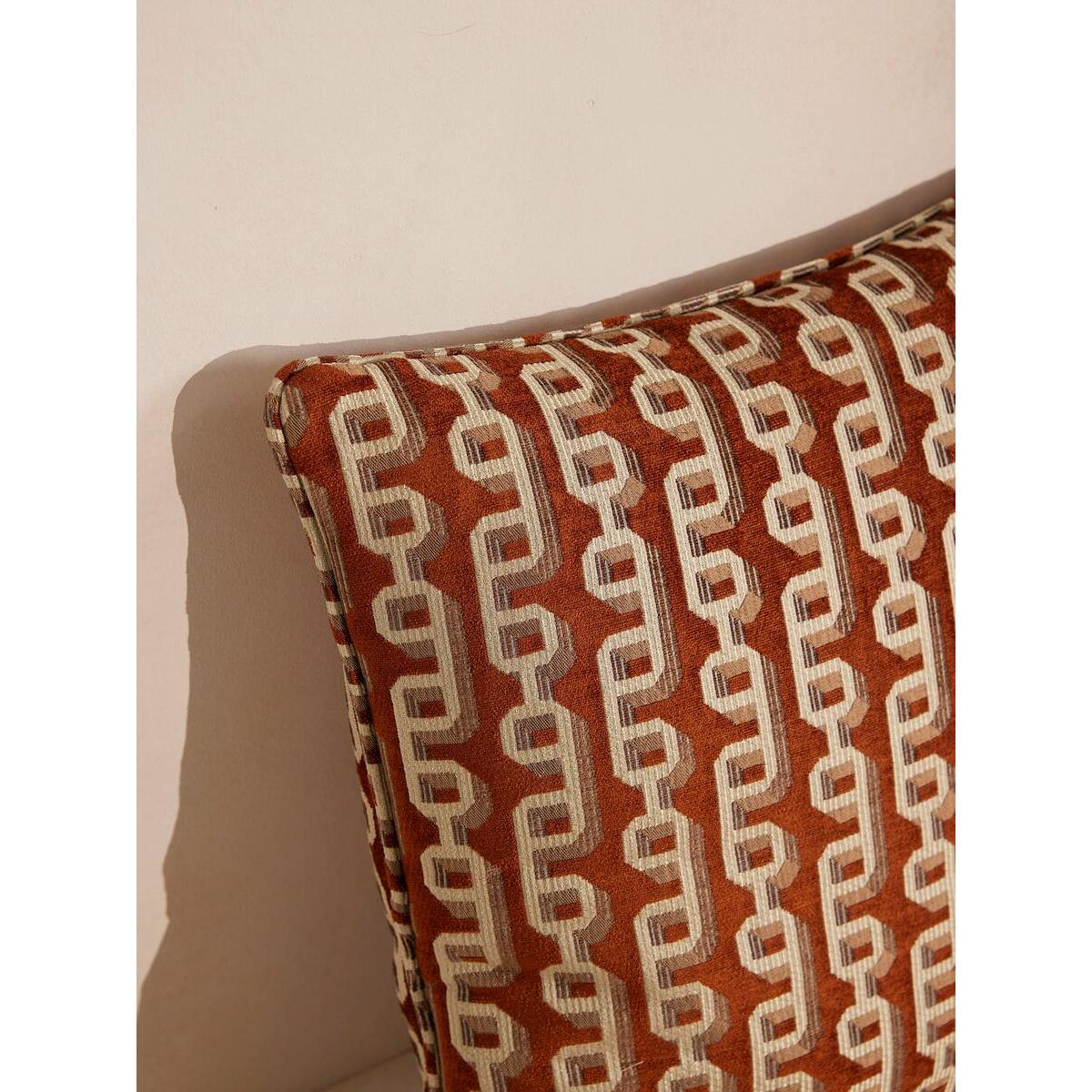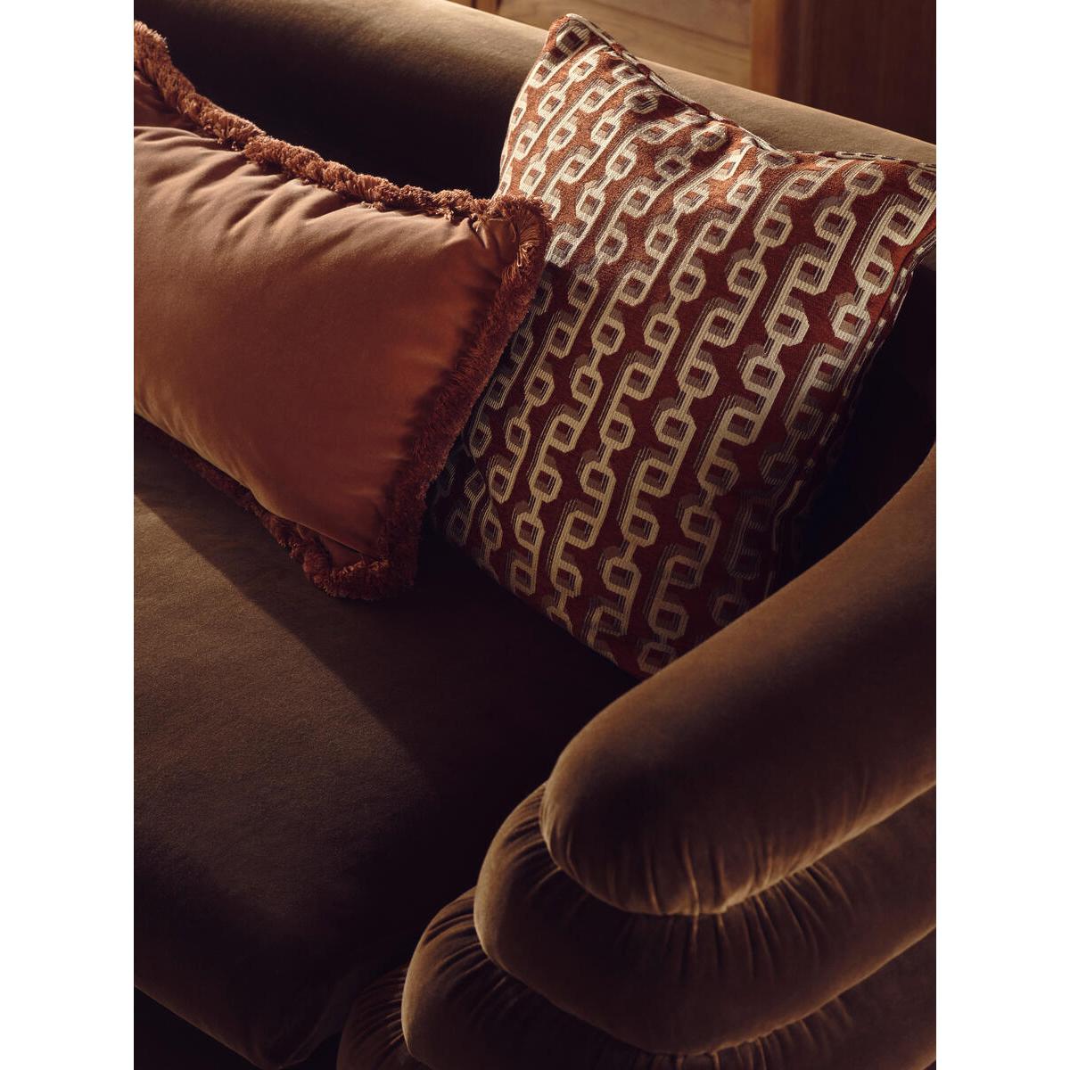 Designed in-house, our Odette cushion features geometric chain links on a rich rust velvet ground, adding warmth and glamour to any setting. Taking inspiration from similar patterns seen in White City House, it's woven in Turkey from a jacquard fabric with self-piping for a clean, refined finish. Woven jacquard cushion Geometric pattern Designed in-house Woven in Turkey Finished in the UK Self-piping Inspired by White City House
