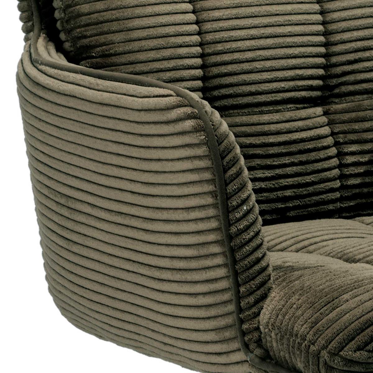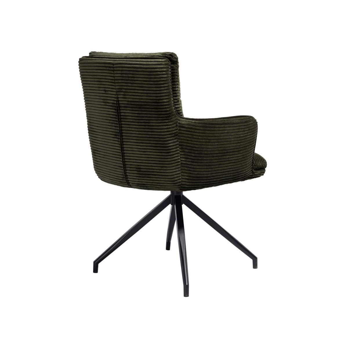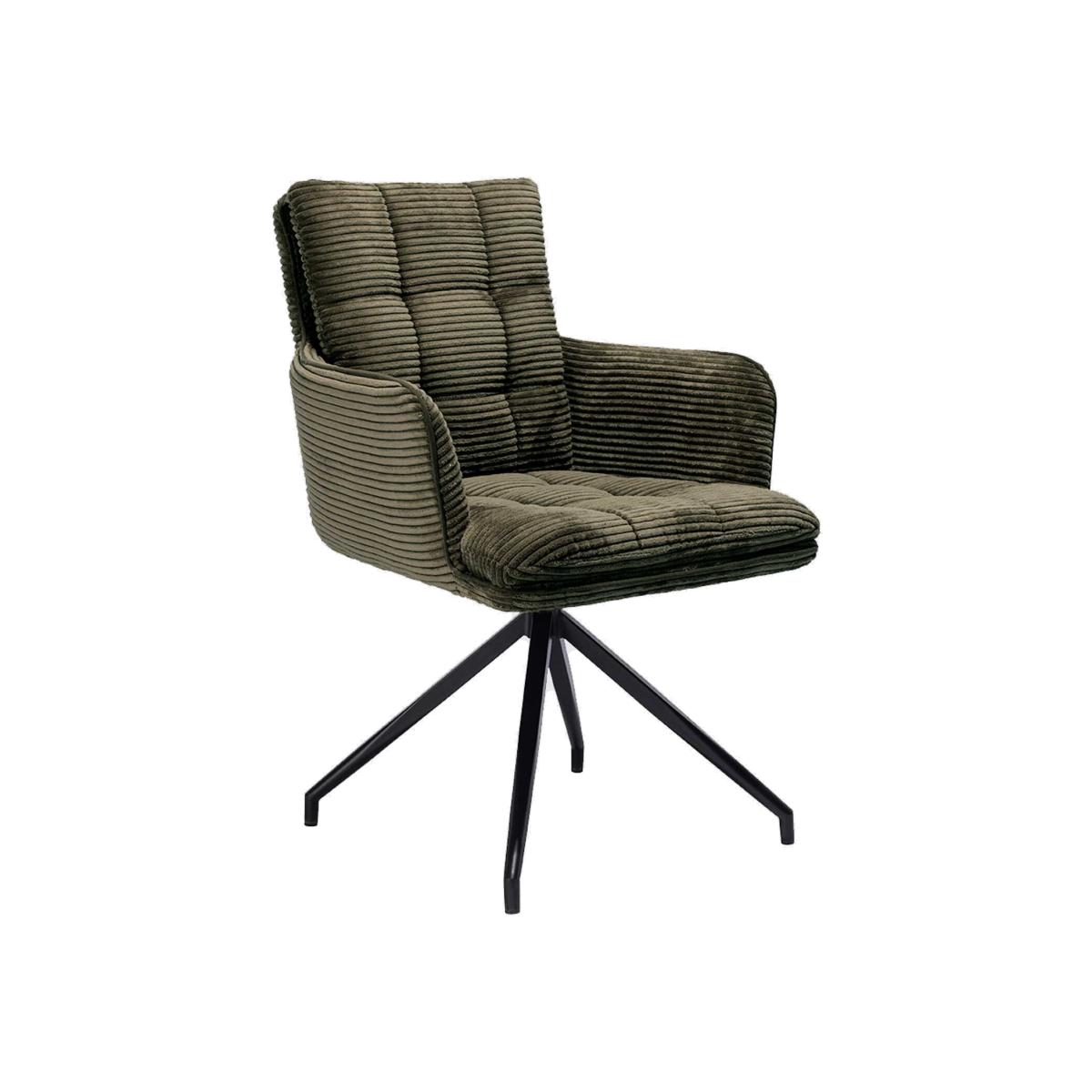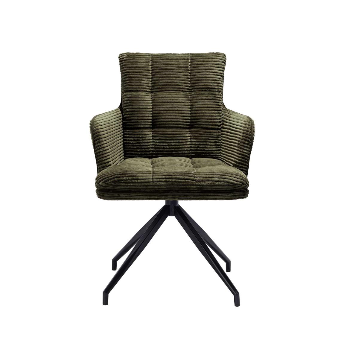 I’m a fan of this green cord-style swivel chair for the way its deep, textural upholstery and slim black legs bring both comfort and definition to a dining or living space. It suits contemporary, mid-century and industrial schemes alike, pairing especially well with warm timber tables or muted stone surfaces. For a cohesive look, balance its rich tone with neutral linens or kilim rugs underfoot, and introduce soft metallic or matte-black accents elsewhere (think candleholders or a slim pendant) to echo the frame.