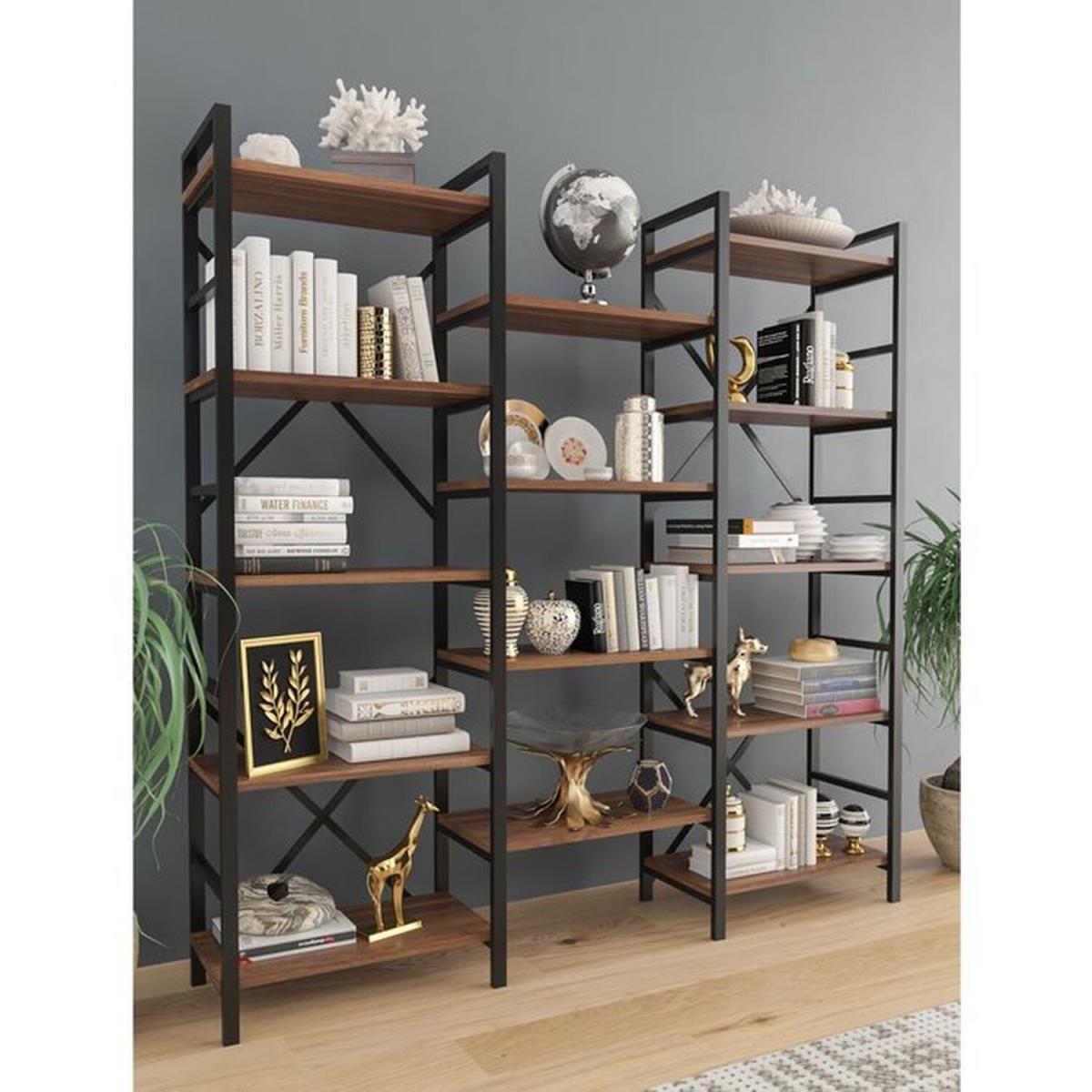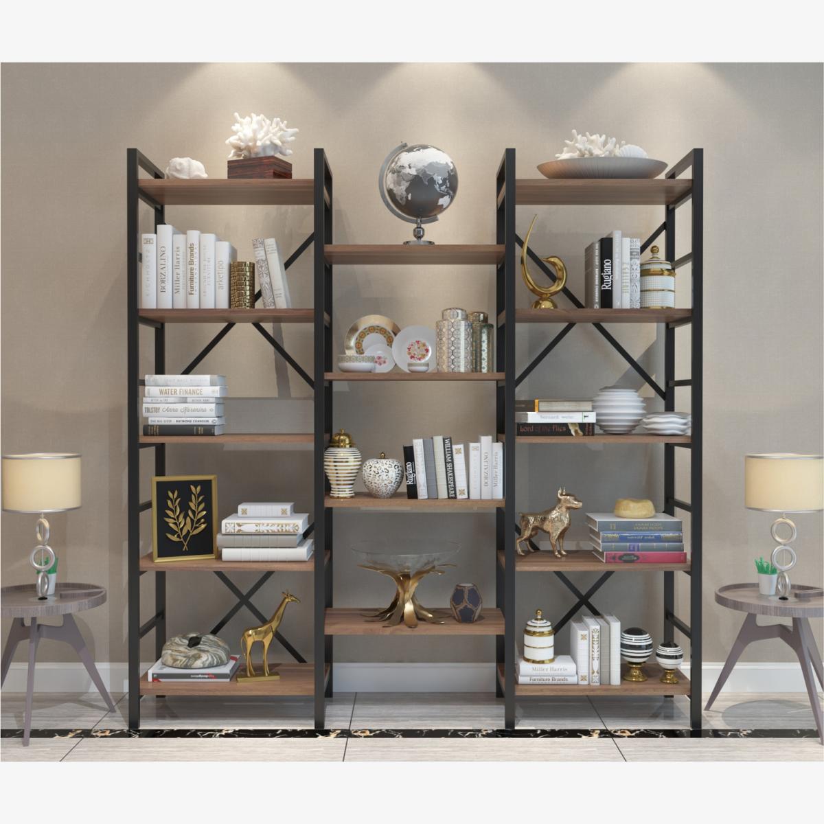 Sure to enhance the look of your living room, bedroom or office, this 5-tier etagere bookcase is both contemporary and functional for your everyday needs. Spacious wood look shelves in walnut are held up by a sturdy black metal frame for a trendy wood feel that goes with any decor in your small home or apartment. Make this the new addition to your living space - It is ready to be your storage and organization solution!