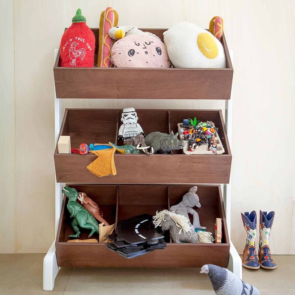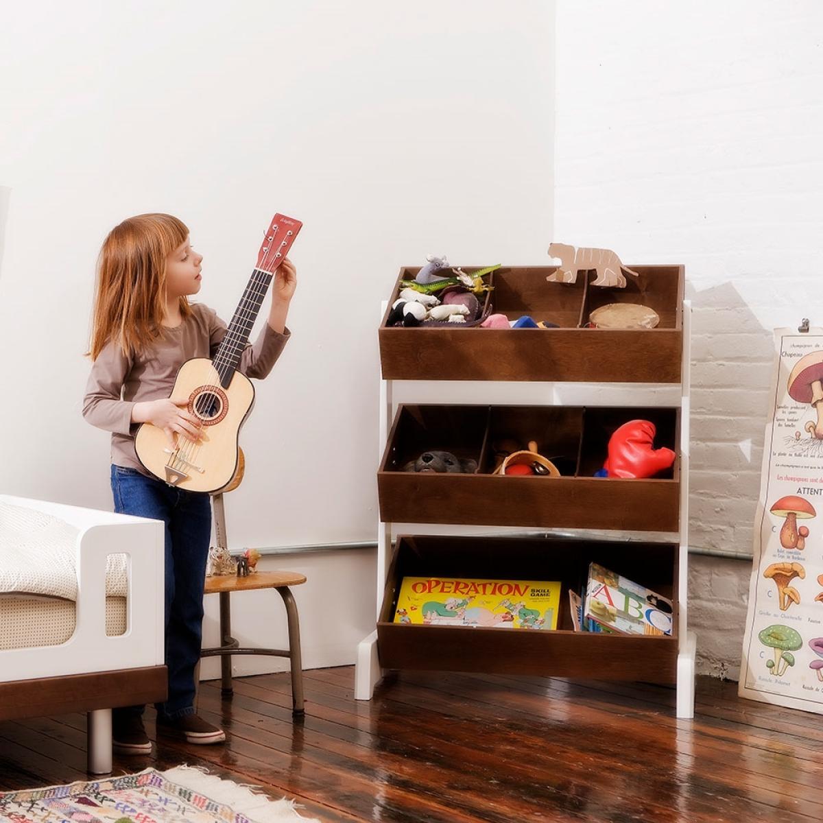 Keep games, toys and teddy bears tidy with the gorgeous Kids Toy Store from Oeuf NYC. Made from high quality birch plywood and eco-MDF, the 3 solid storage boxes offer plenty of room to help keep your kiddies room clutter-free! Including removable box dividers, your little ones can store toys in all shapes and sizes. Separate building blocks into their colours, keep arts and crafts materials organised and even over-sizedplushies can have a home. Designed at the perfect height for your little nippers, the bins can be tilted or positioned flat making tidying away even easier. Perfect in the playroom, bedroom or even the living room, this stylish unit is available in white and birch or white and walnut and is sure to fit seamlessly with existing furniture.