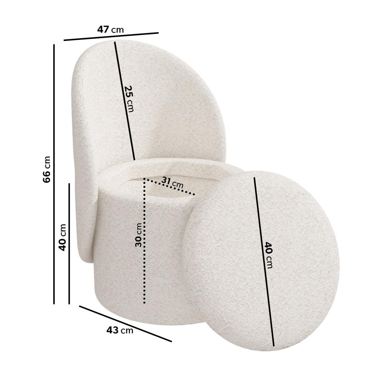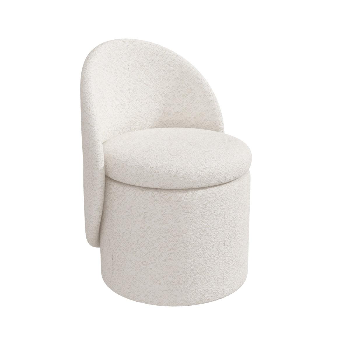 Features we love Round dressing table chair with hidden ottoman storage Beautifully upholstered in an off-white boucle fabric The curved backrest provides comfortable back support Also makes the perfect accent chair in any room Minimal assembly just screw on the legs All about me Add a touch of softness to any bedroom or dressing room with this chic dressing table stool with back support. Sit on the plump seat, apply your make-up comfortably, and use the hidden storage to keep your dressing table and bedroom clutter at bay. Need to know Dimensions: W47 x D43 x H66 cm Seat height: 40cm Internal storage dimensions: 32 x 34cm Colour: Off-white Finish: Upholstery Material: Solid plywood frame and boucle fabric (upholstery) For use: Indoors Assembly required: Minimal Assembly