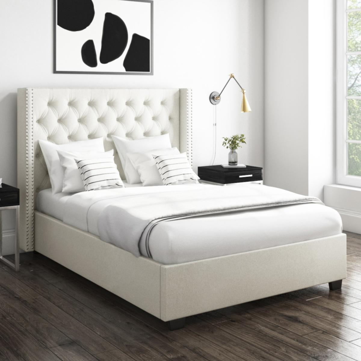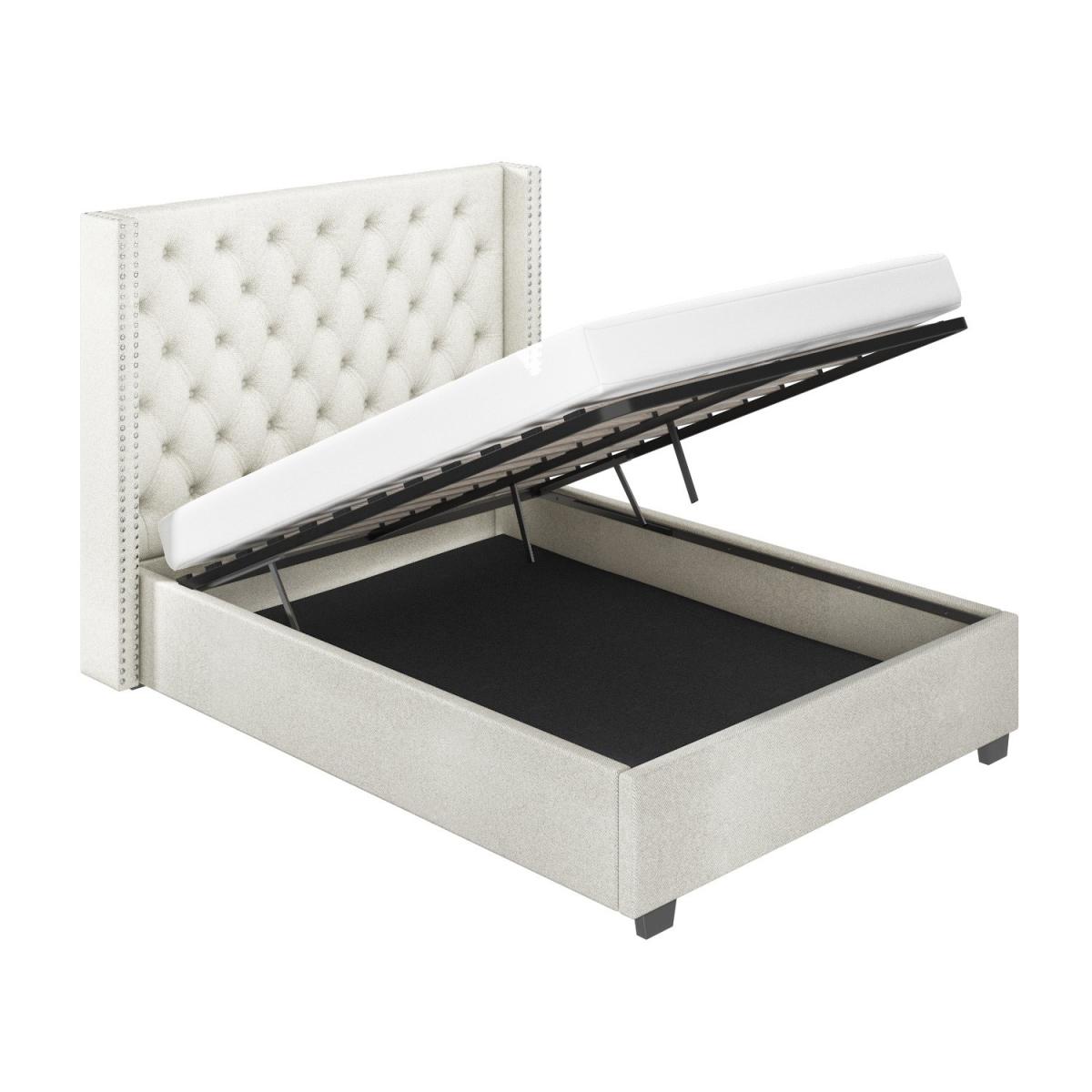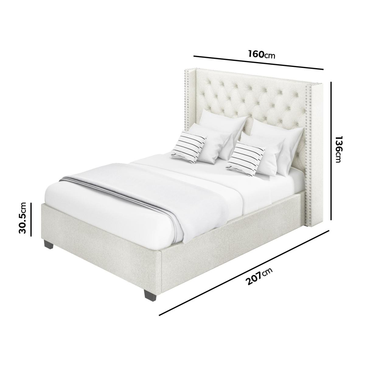 Features we love Front opening storage space with gas lift mechanism. Off white woven finish coordinates with any décor Deep buttoned headboard is perfect for propping up on. Elegantly finished with studded detailing on each wing. The entire space beneath can be used as storage. Solid base helps protect your stored items from dust. Also available in a standard UK king size Need to know. Assembled dimensions. L207 x W160 x H136 cm Packaging dimensions. Box 1 – W151 x D141 x H16 cm Box 2 – W135 x D27 x H17 cm Box 3 – W197 x D33 x H22 cm Product weight. 70kg Storage dimensions. L192 x W137 x H30.5 cm Height from floor to mattress. 35.5cm Bed mattress size. Standard UK double (135 x 190cm / 4ft) Colour. Off white and silver (studs) Material. Multilayer board woven fabric and metal (studs) Finish. Upholstered Bed base. Multilayer board and poplar wood Assembly required. Yes Mattresses included. No.