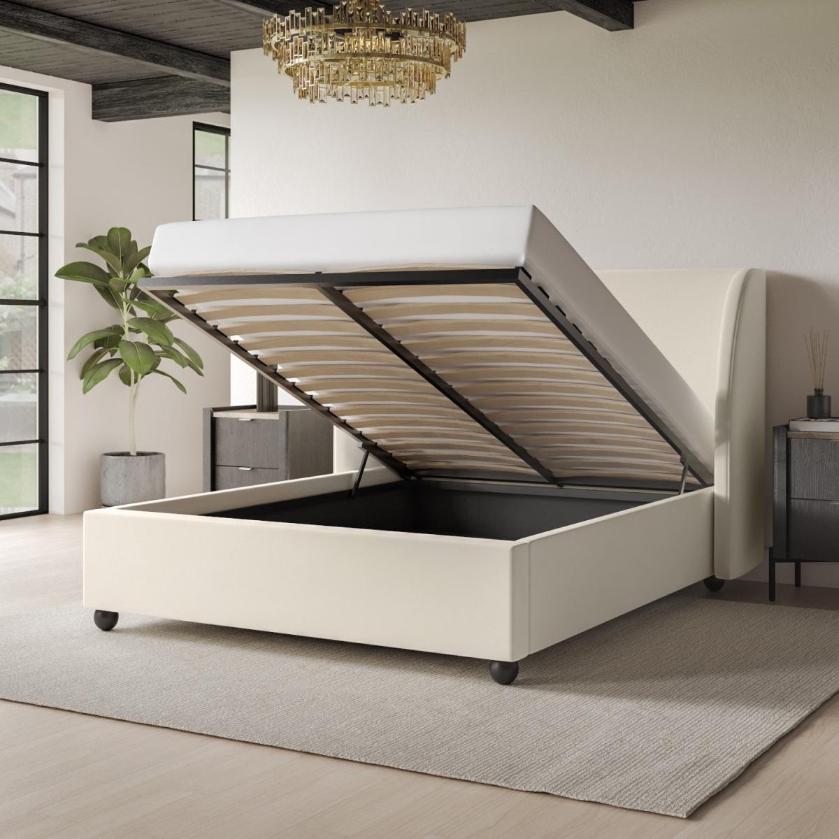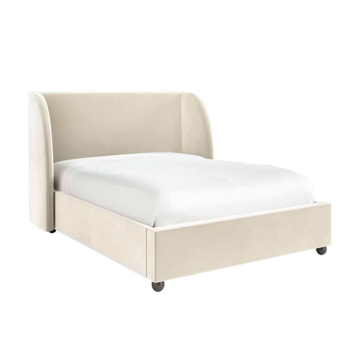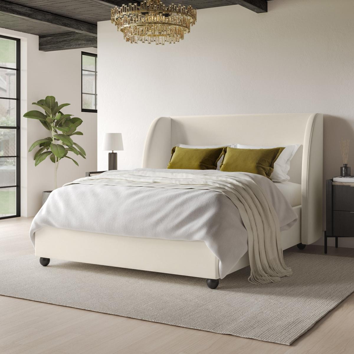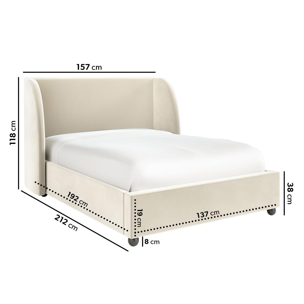 All about me The Bergamo double ottoman bed is the perfect blend of style and functionality for your bedroom. The off-white velvet finish adds a touch of opulence to your space and looks perfect in most decor styles. The deep-winged headboard of the Bergamo provides a cozy and stylish backdrop to your sleep haven. With its black wooden ball feet, it's a statement bed that effortlessly elevates the overall aesthetic of your bedroom. With a discreet storage solution, the gas lift ottoman feature ensures easy access to the generously sized storage compartment beneath the mattress. Say goodbye to clutter as you effortlessly lift and stow away extra bedding, pillows, or seasonal items, maintaining a tidy and organized space. The Bergamo bed is crafted for durability and stability, meaning you can rest easy knowing that it not only looks good, but it will also stand the test of time. Need to know Size: Standard UK double Product Weight: 81kg Dimensions:W157 x D212 x H118 cm Internal Storage Dimensions:W137 x D192 x H19 cm Colour: Off-white Material: Velvet Finish: Upholstered Base: Sprung slatted Storage opening: End lift Storage base: Solid Headboard Filling: Foam Weight Capacity: 300kg Assembly required: Yes Packaging dimensions: Box 1: H28 x W201 x 32. D, Box 2: H17 x W153 x D117, Box 3: H18 x W117 x D59 (cm)