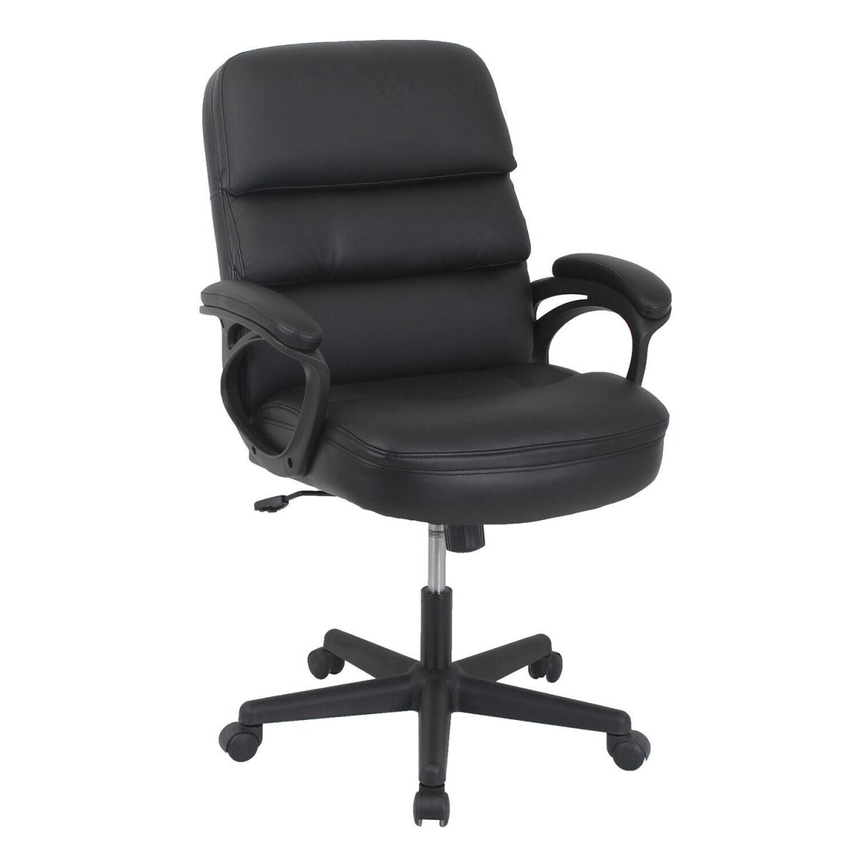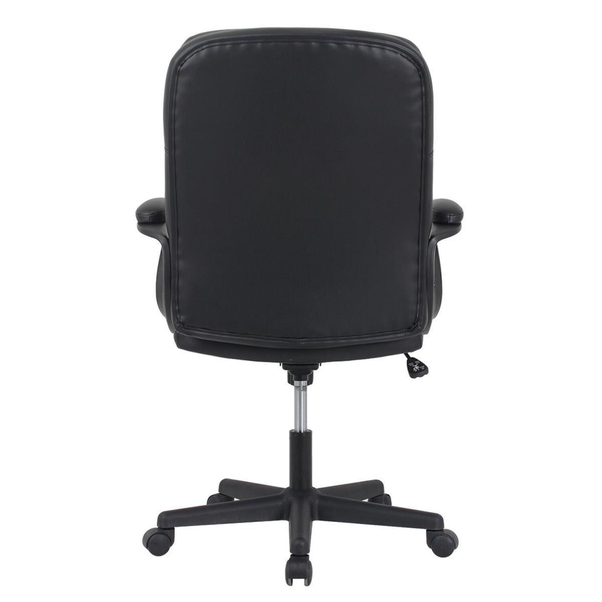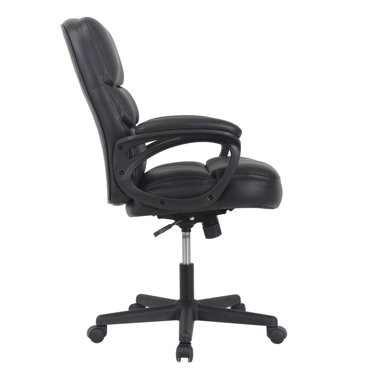 This executive chair will treat you to relaxing sitting, keeping your back perfectly aligned to skyrocket your performance! Style, quality, comfort durability meet in an executive chair that stands out! And it is providing you with a top-standard high-back chair, submitted to rigorous quality testing and quality assurance to ensure the ergonomic office accessory you need. Features. Padded mid-back rolling office chair upholstered in durable polyurethane bonded (faux) leather. Height-adjustable padded seat, and padded armrests perfect for home office, computer desk, guest workstation, or conference room.5-legged base with durable casters for smooth-rolling mobility, 125kg max weight capacity. Assembly instructions are included, and can be assembled in 15 minutes