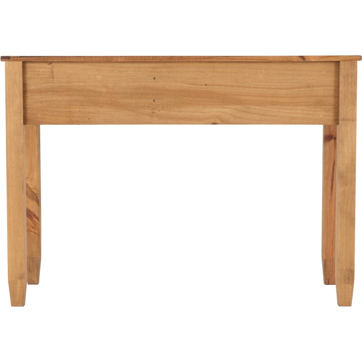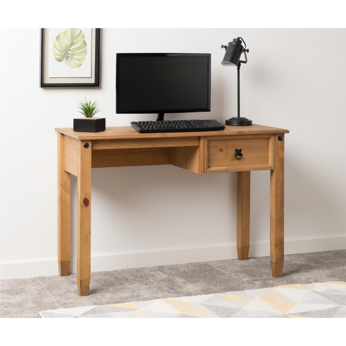 Features we love Neat compact design. Plenty of space for writing or using your laptop Distressed waxed pine finish. Stylish black metal finishing's Assembly required All about me. This desk has a natural warmth and homely look about it with its natural pine construction distressed waxed finish. Touches of black metal hardware enhance the rustic stylish look. The surface top is smooth and spacious making the perfect writing desk or a great place for small computers and laptops. There's even a small drawer to hold your essentials. Constructed from solid pine with solid pine drawer runners and a plywood drawer base. Complete with black metal hardware. Need to know. Dimensions. H75 x W107 x D44.5 cm Drawer dimensions. H15 x W33 x D32 cm Material. Wood and; metal Finish. Solid pine Drawers. 1 Assembly required. yes.