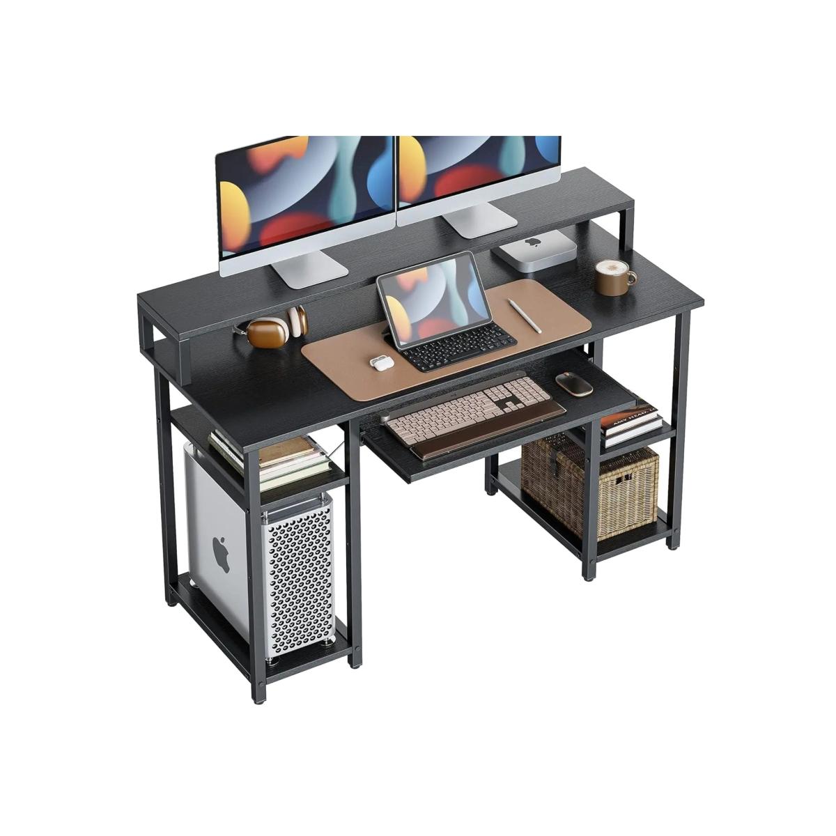 Our Home Office Desk is designed for efficiency and organization, featuring integrated storage shelves that provide ample space for books and office supplies. It includes a convenient keyboard tray to optimize workspace ergonomics and a monitor stand that elevates screens to eye level, promoting better posture. This desk combines functionality with an elegant aesthetic, making it an ideal addition to any home office environment.