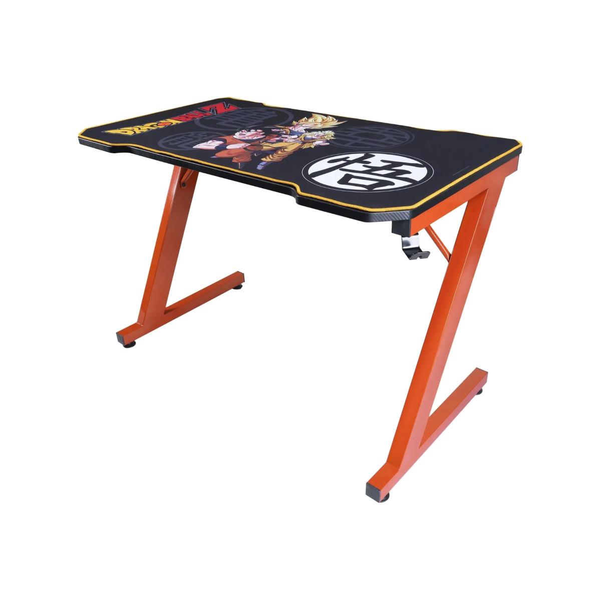 The Gaming Dragon Ball Z Desk is a gaming-inspired desk with a curved shape, bevelled edges, and a carbon finish PVC tray. It can accommodate two screens and features a 3mm thick non-slip Batman printed mouse pad. The desk is built on an ultra-resistant metal frame and can support up to 80 kg. The Dragon Ball Z printed carpet is water-resistant and can function as an XXL mat. The desk is compact, adjustable, and comes with storage accessories like a headset holder and cup holder.