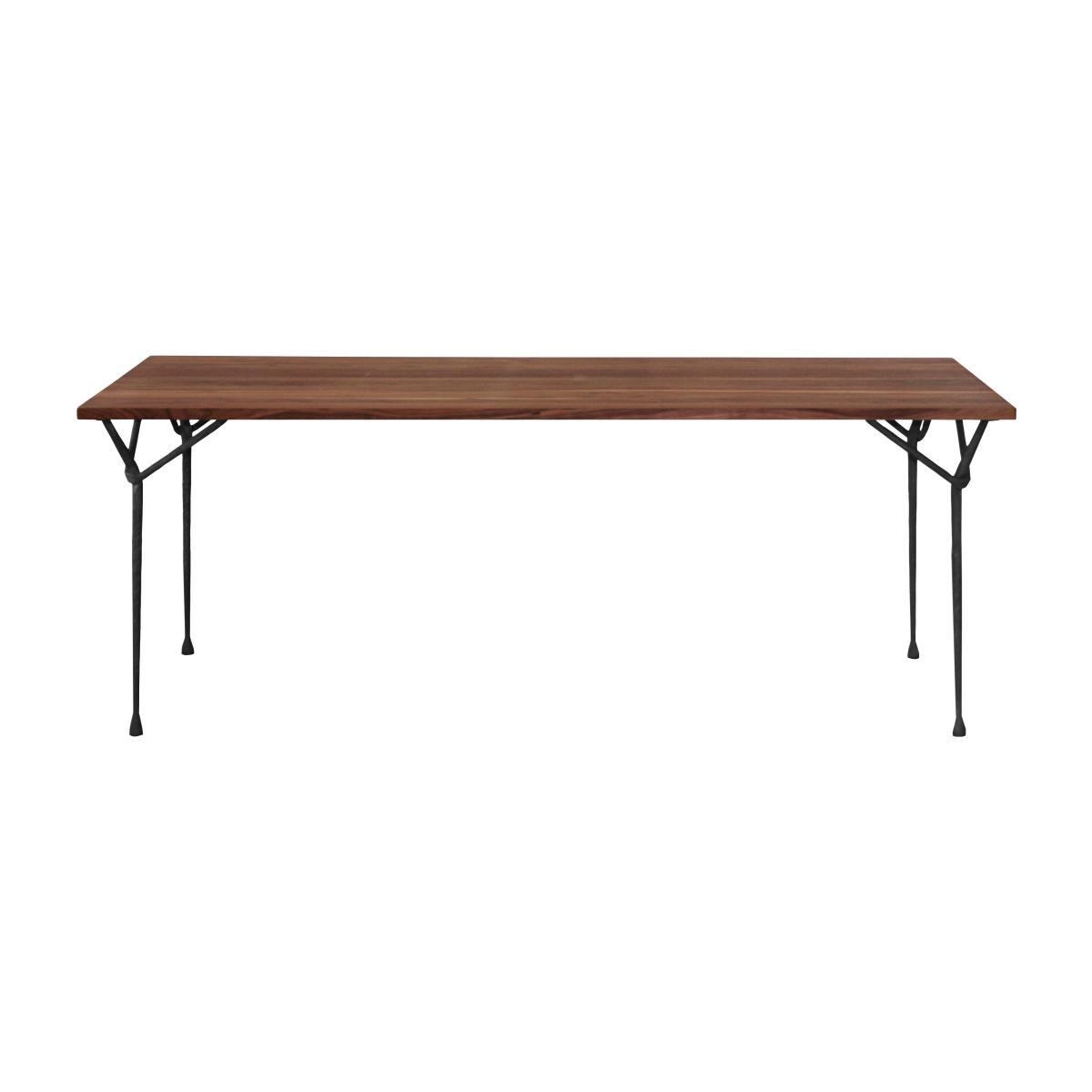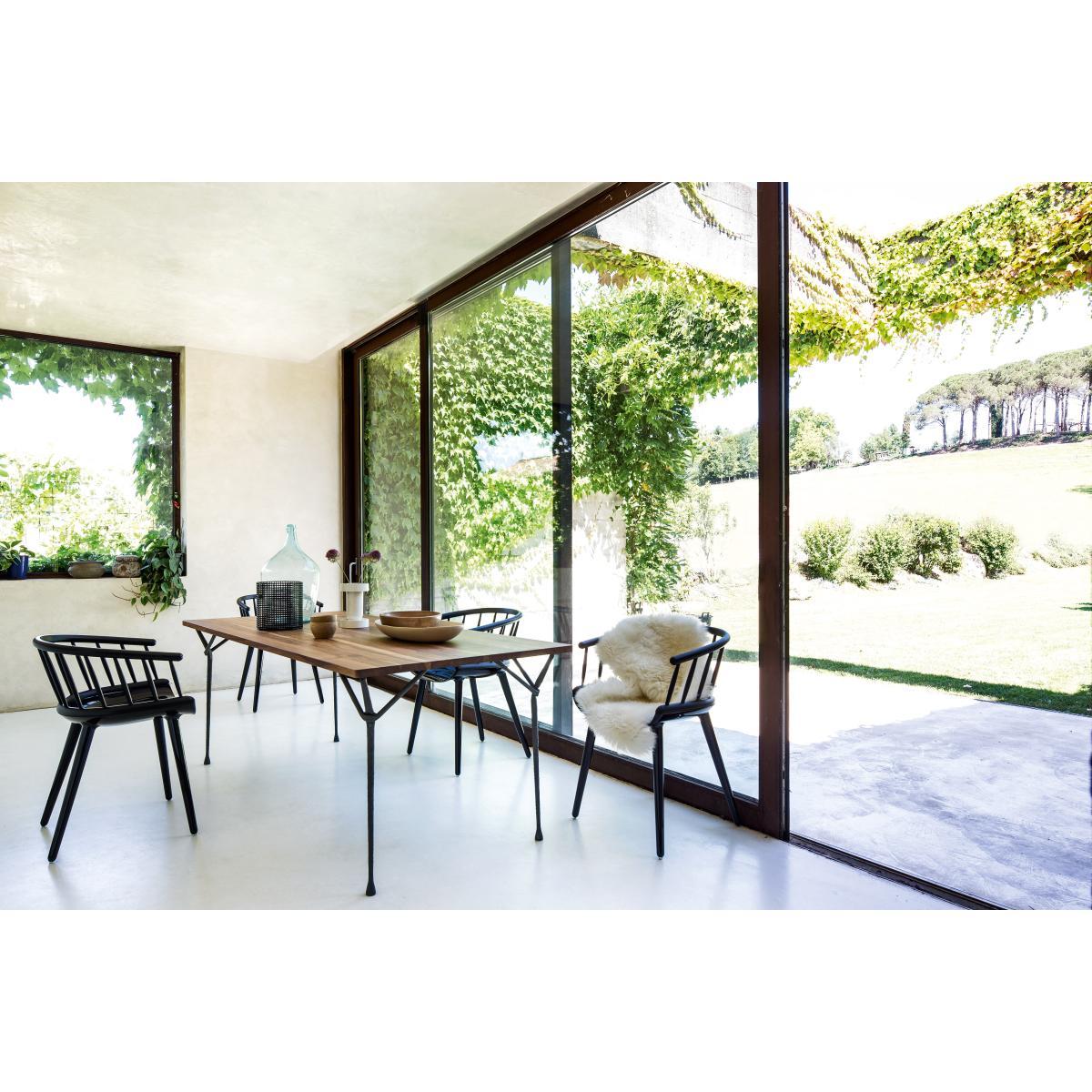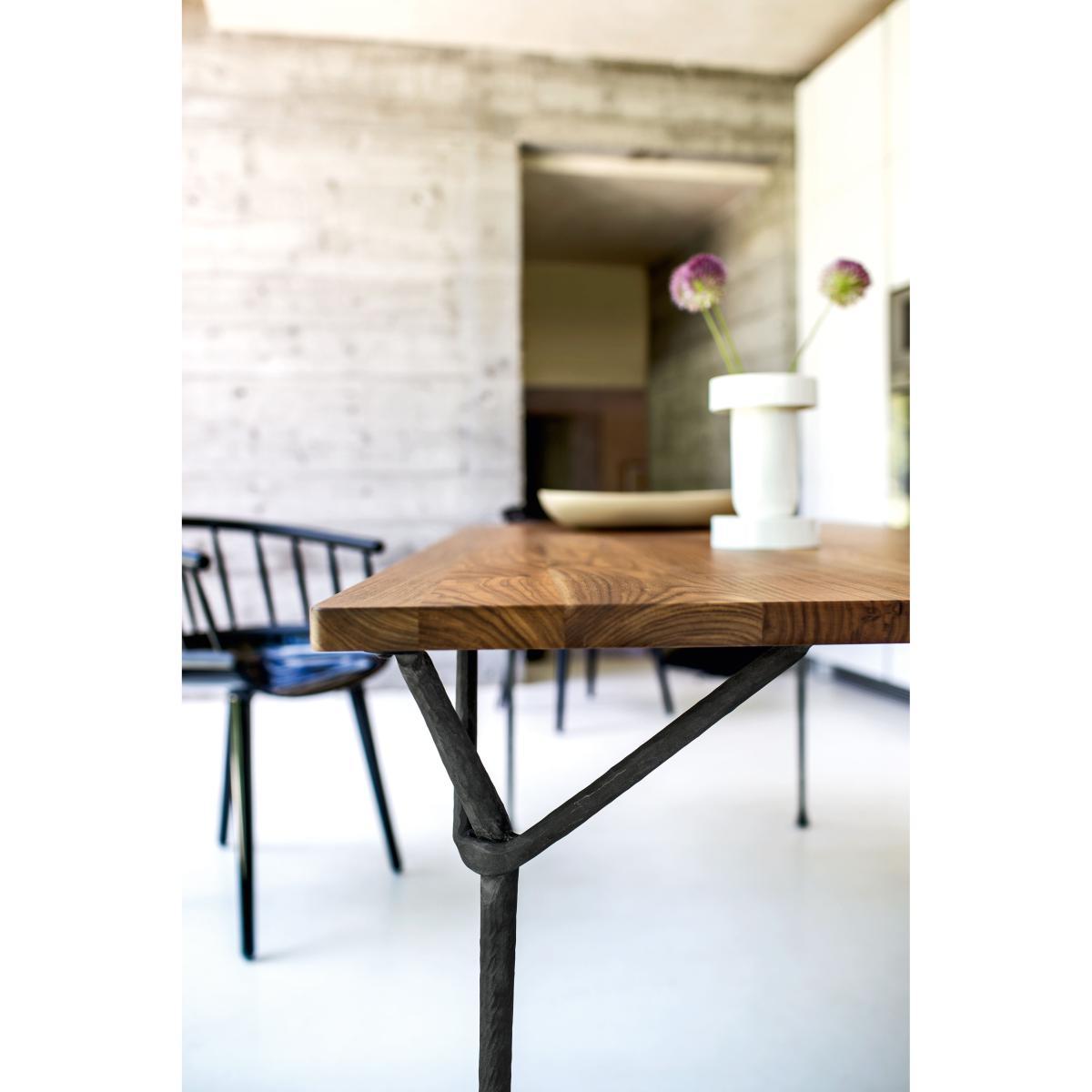 Challenging a contemporary visual language in wrought iron, the bouroullec brothers have developed the ‘officina' collection, a range of tables and low tables with hammered metal structures, and tops in a variety of materials: wood, sheet metal, glass. Presented during salone del mobile 2014, the furniture series for italian furniture company magis utilizes one of the oldest production techniques. ‘we wanted to work with this ancient fabrication process and give it a new visual language,' explain ronan and erwan bouroullec. ‘the result is a system of legs with a newly made geometric shape to hold up tabletops of different size and nature – steel, wood, glass. As structural elements, they can create furniture of extreme sophistication, refinement and harmony,' they add. ‘the surface of wrought iron is alive and imperfect, which lends the objects a special vibration. By reflecting the random, mechanical traces of the tools that gave them shape, these pieces bring a breath of fresh air to the industrial scheme.