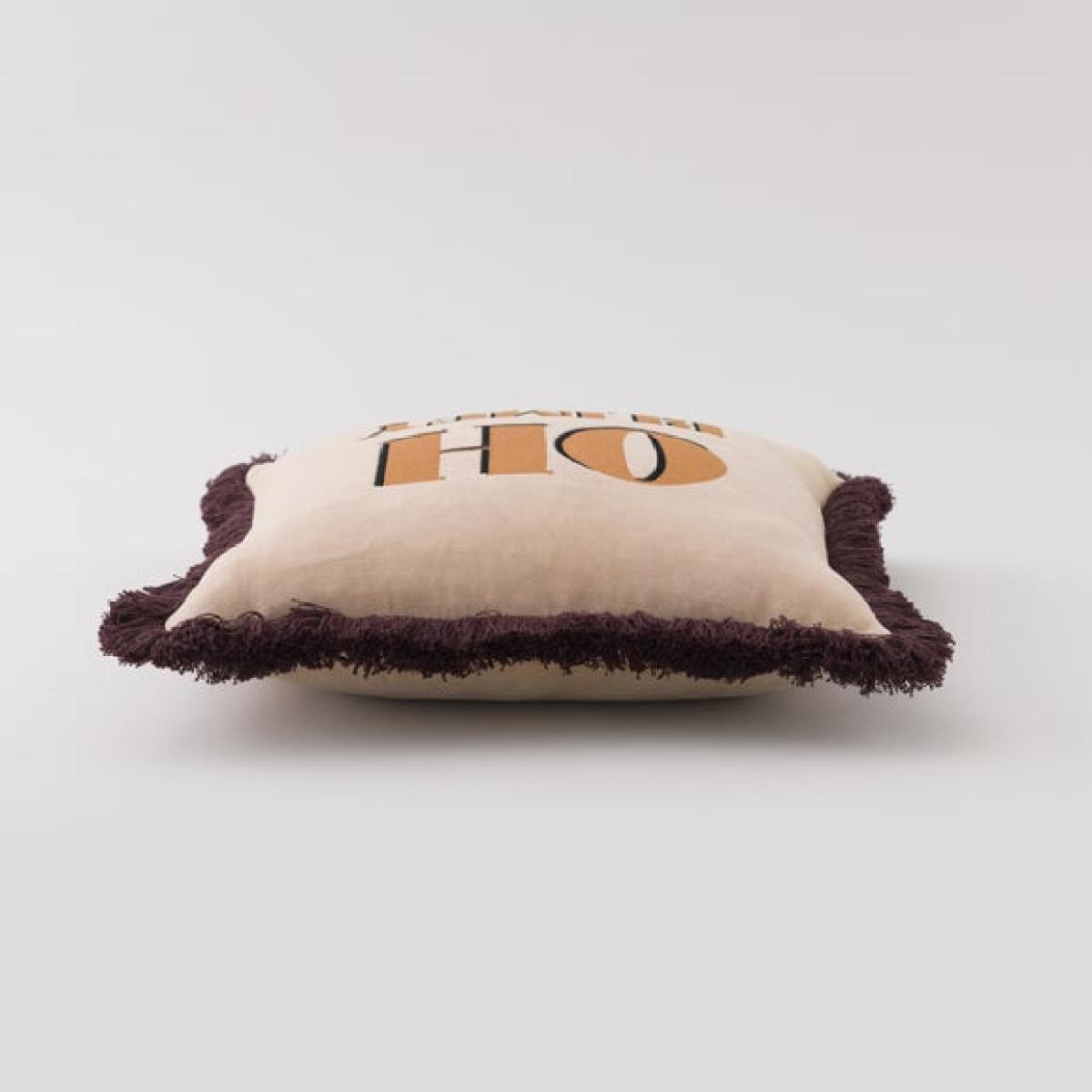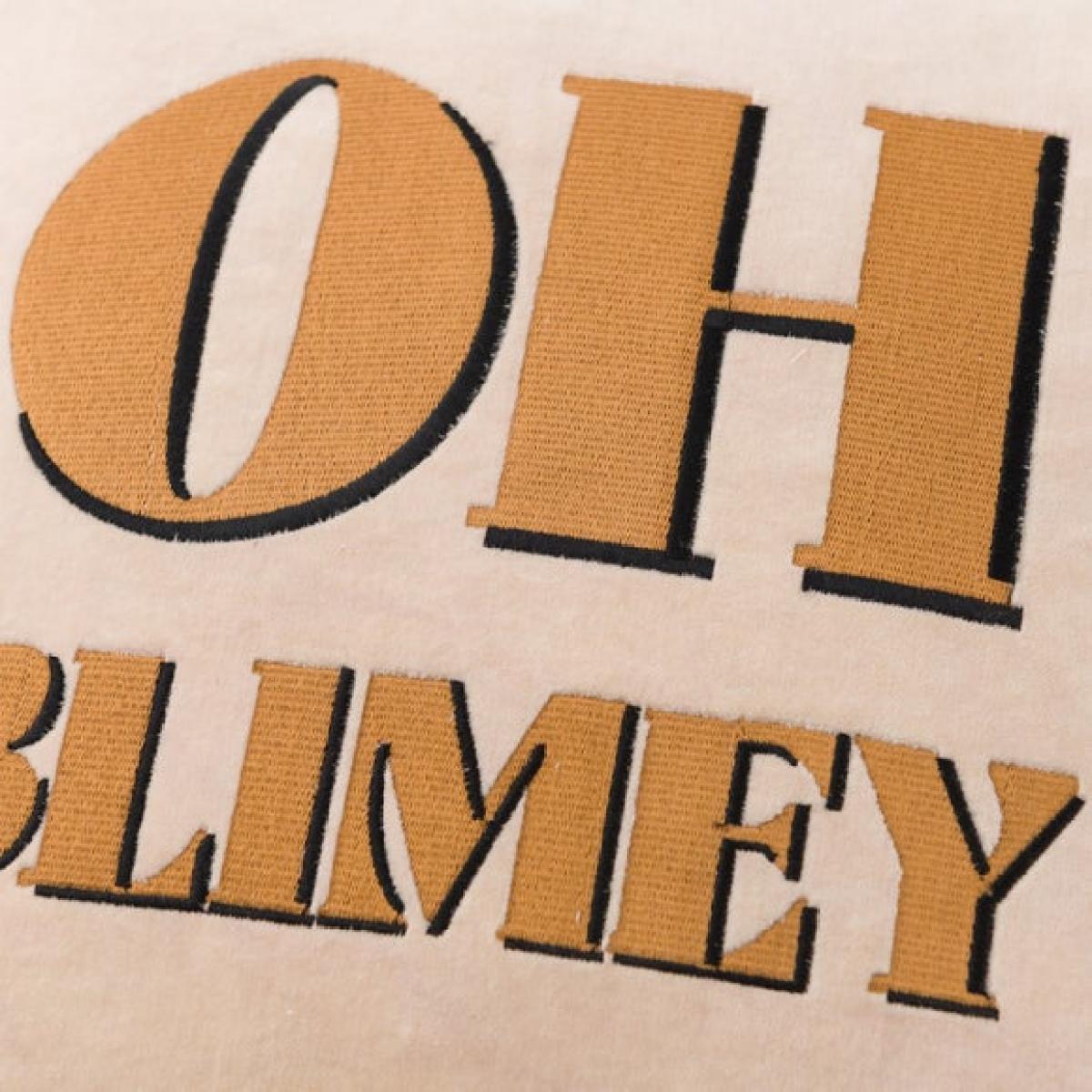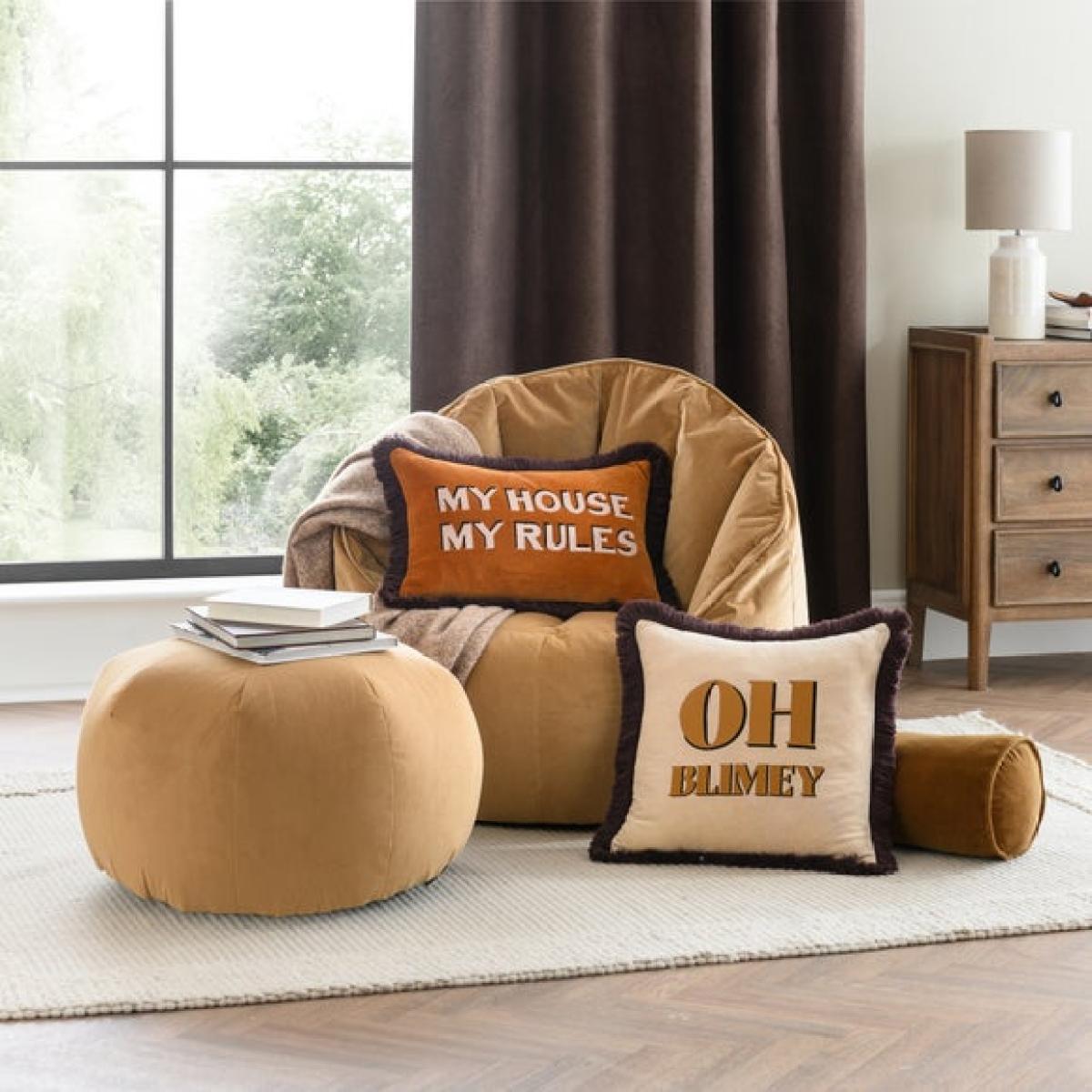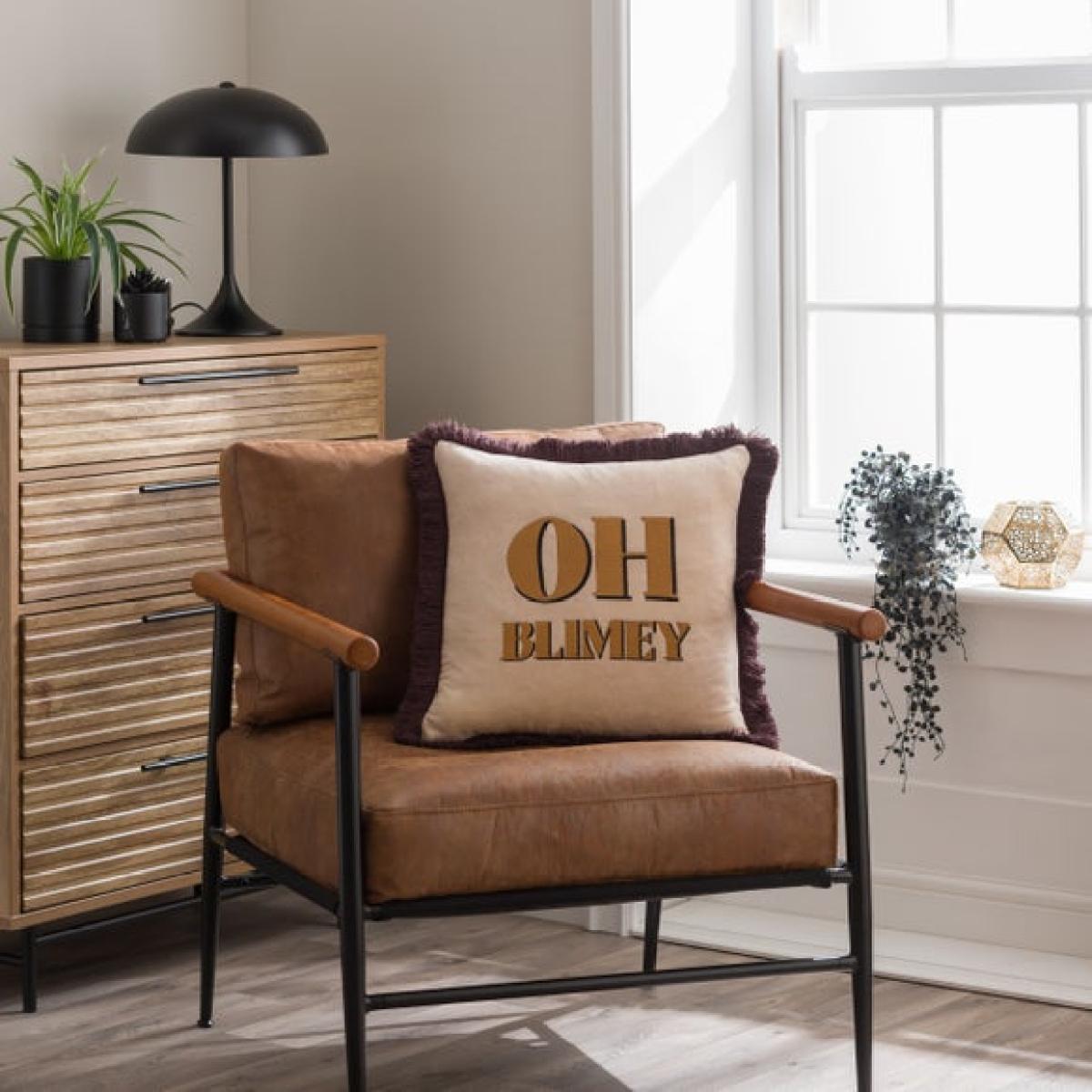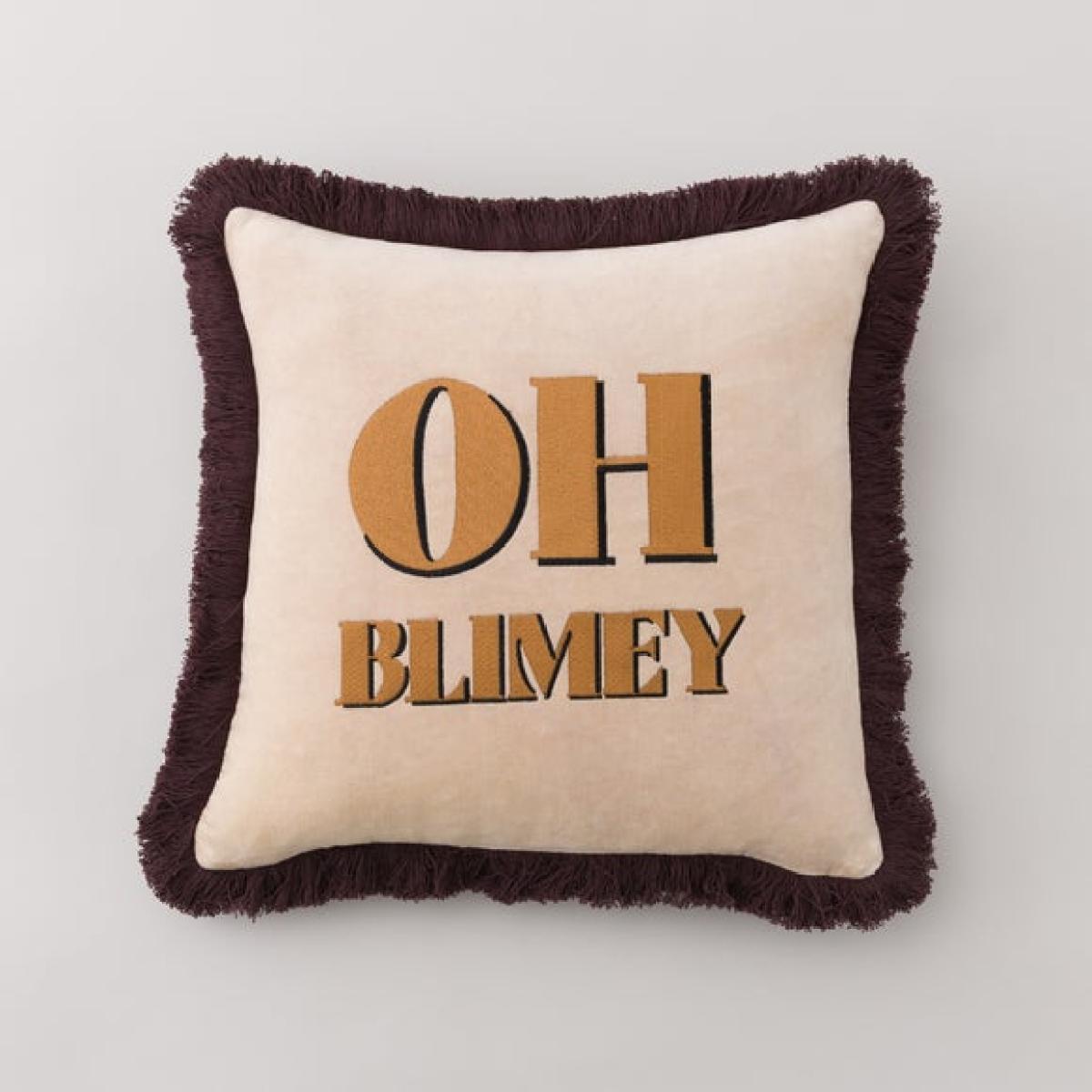 * Soft and luxurious, 100% cotton velvet cover * Embroidery and fringe detailing * Polyester fibre filling * Zip fastening * Machine washable Add a dash of fun and flair to your interiors with the Oh Blimey Cushion. Made from rich 100% cotton velvet, this square cushion is adorned with a bold embroidered slogan and finished with a thick, textured fringe for a playful twist. The soft polyester fibre filling offers everyday comfort, while the zip fastening and machine washable cover ensure easy care. Whether on your bed, armchair, or sofa, this cushion brings a humorous and light-hearted touch to your home. Team it with the "My House My Rules" cushion for an entertaining cushion combo.
