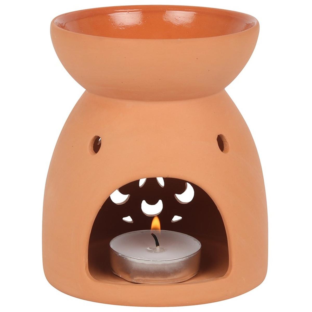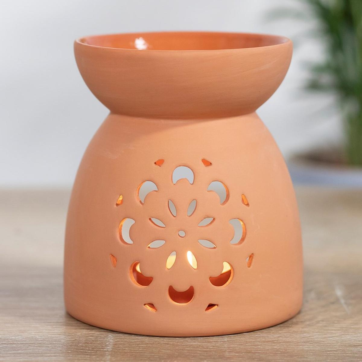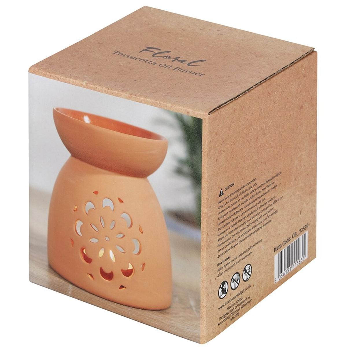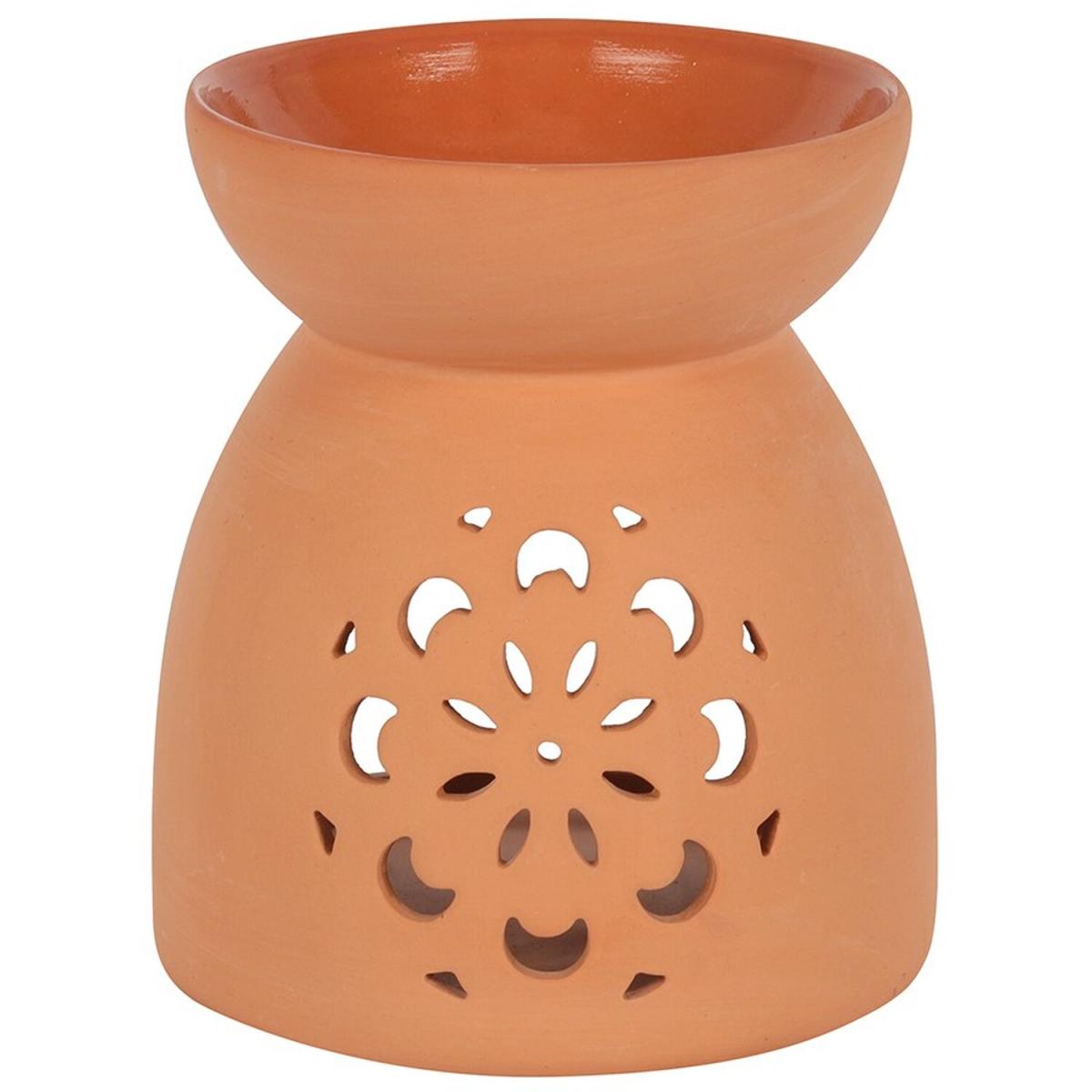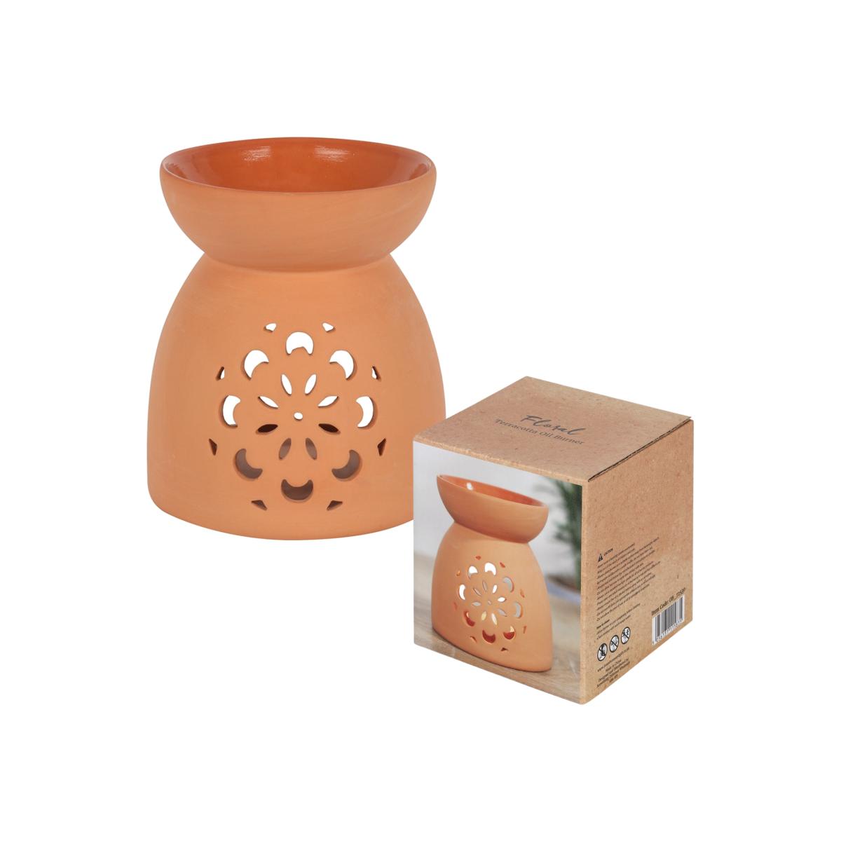 A delicate flower cut out is beautifully showcased with a terracotta-effect finish on this contemporary oil burner and wax warmer. Makes a great gift and home decor piece ideal for melting wax and/or oils to provide aromas around the home.
