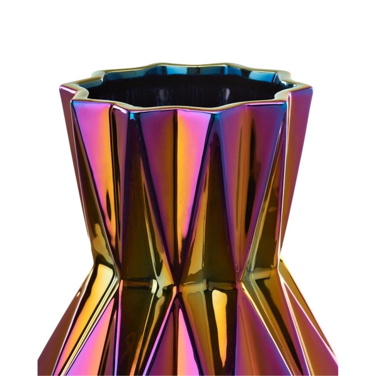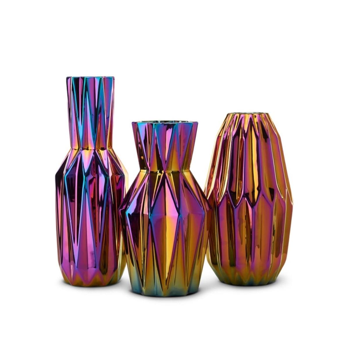 I’m really taken with the “fold” vase for its sharp geometry and oil-slick glaze - it feels both modern and playful. It works especially well in contemporary or eclectic interiors, where its iridescence can pop against matt walls or industrial-style shelving. For styling, keep foliage simple - a few long green stems or dried grasses will temper the gloss - and consider grouping it with neutral ceramics or books on a console or windowsill to create a balanced focal point.