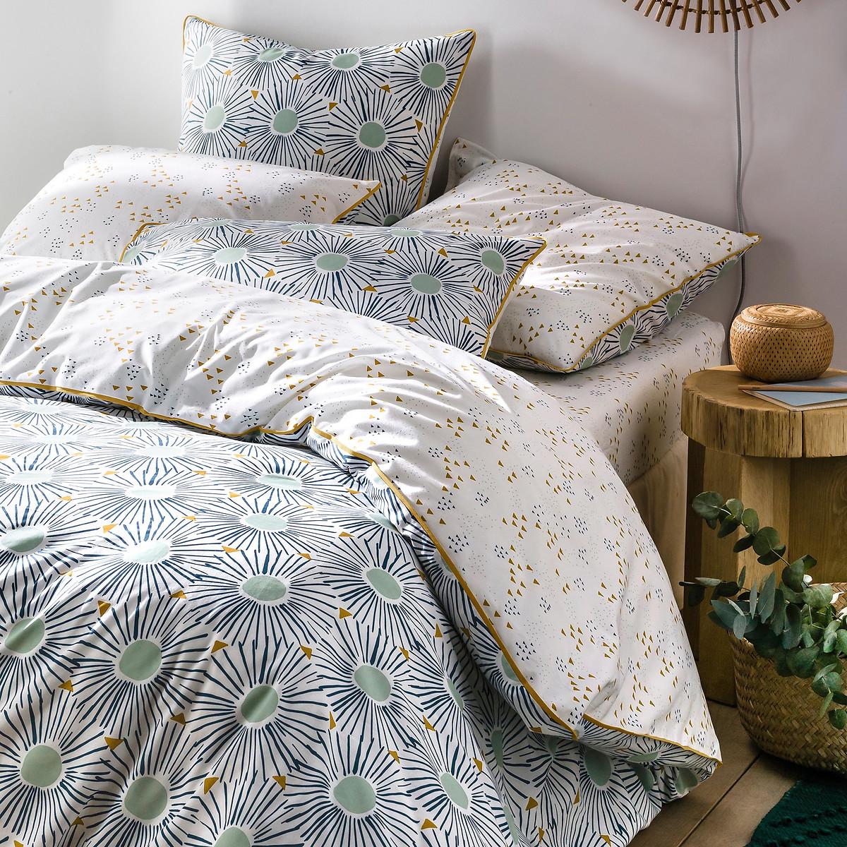 Create a soothing atmosphere in the bedroom with this pure cotton reversible Oja duvet cover. Its fantastic floral-inspired starburst print in soft colours contrasts beautifully with the yellow gold piped edging, for total style harmony and a blissful night's sleep. Cotton is part of our daily lives. We love it for its suppleness and softness. Easy Care, it is ideal for the beds of young and old alike!Product Details • 100% cotton • 144 thread count • Straight buttoned hem • Different fantasy prints on each side, contrasting piping finish. Care Advice • Machine washable at 60°C • By washing your laundry at 40°C instead of 60°C, you limit energy consumption. Dimensions • 140 x 200cm: Single • 200 x 200cm: Double • 240 x 220cm: King • 260 x 240cm: King. Pillowcases sold separately. • OEKO-TEX® Standard 100. Standard 100 certification by OEKO-TEX® tests textile products for harmful substances via an independent, international label.