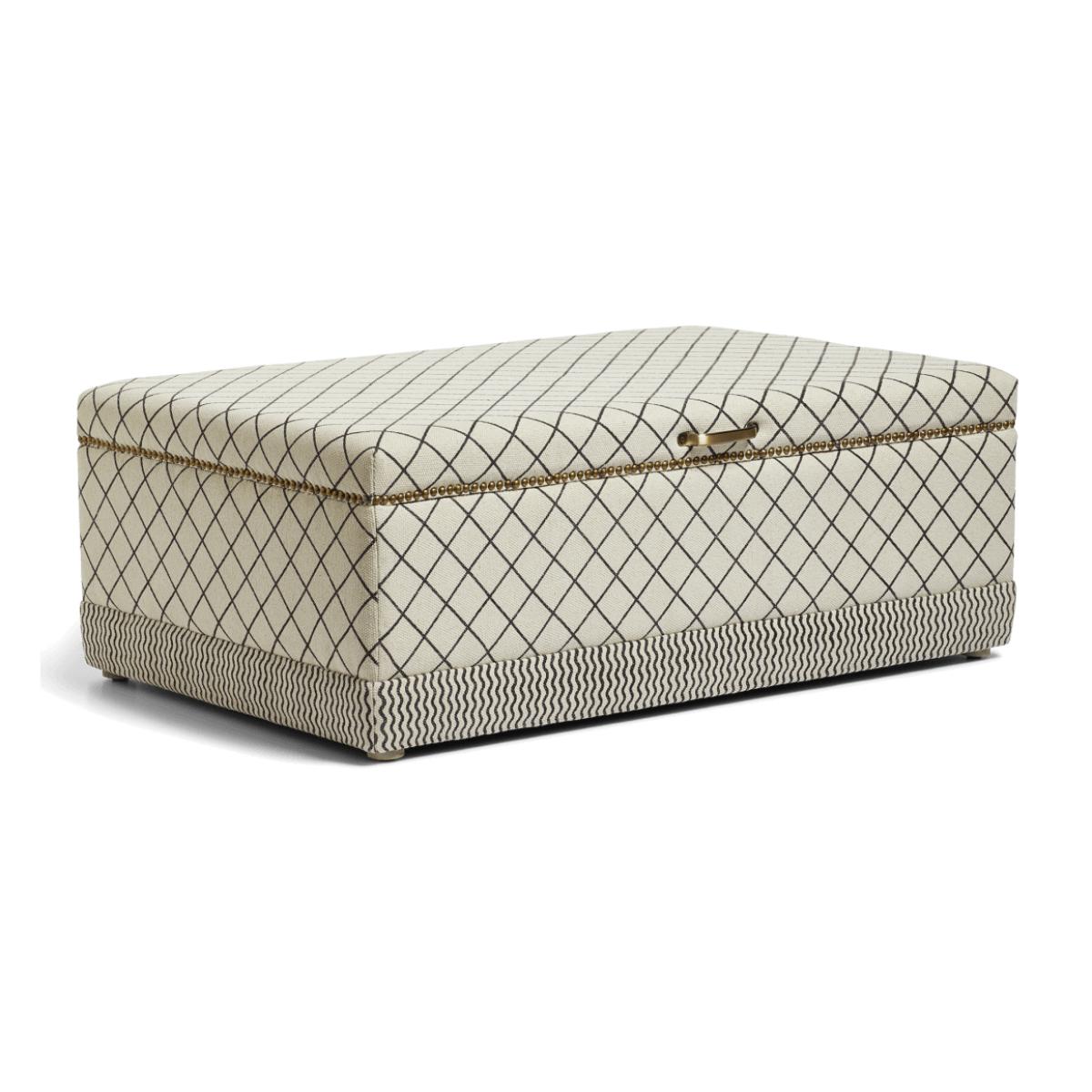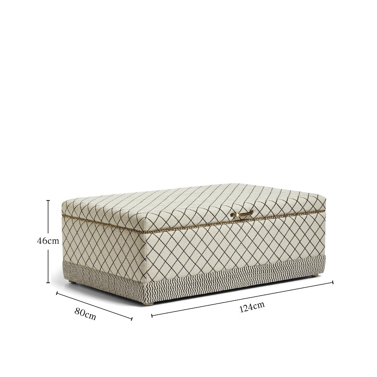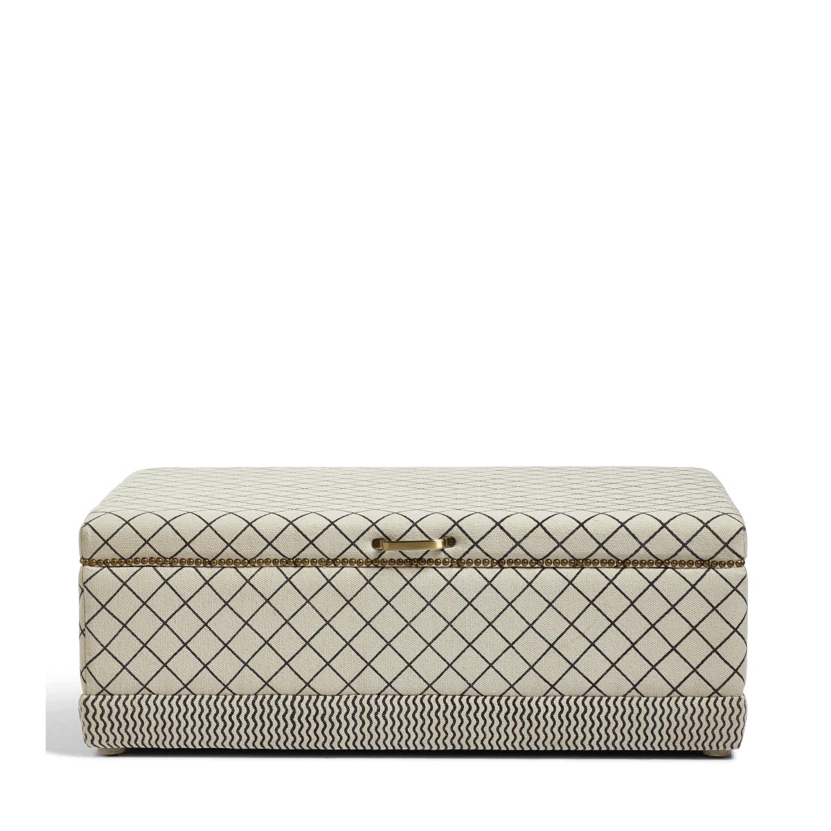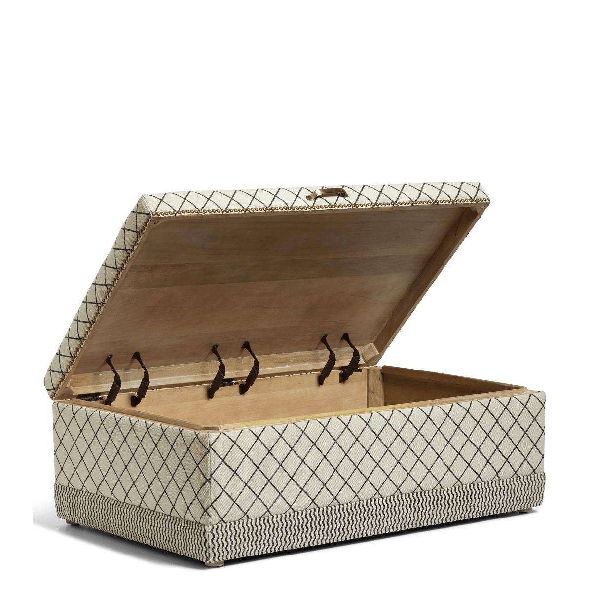 Pleasingly simple in pattern, the Agnes is also exceedingly practical in design. Its diamond print is complemented by a wavy stripe at its base which adds dimension and lends it its name – the village of St Agnes is a popular surfing spot on the north coast of Cornwall. Made from mango wood and upholstered in a printed cotton dhurrie, Agnes can be used as an extra surface, a seat or as storage. Its lid opens on brass hinges that match the decorative studs and handles, and will stay open when lifted.