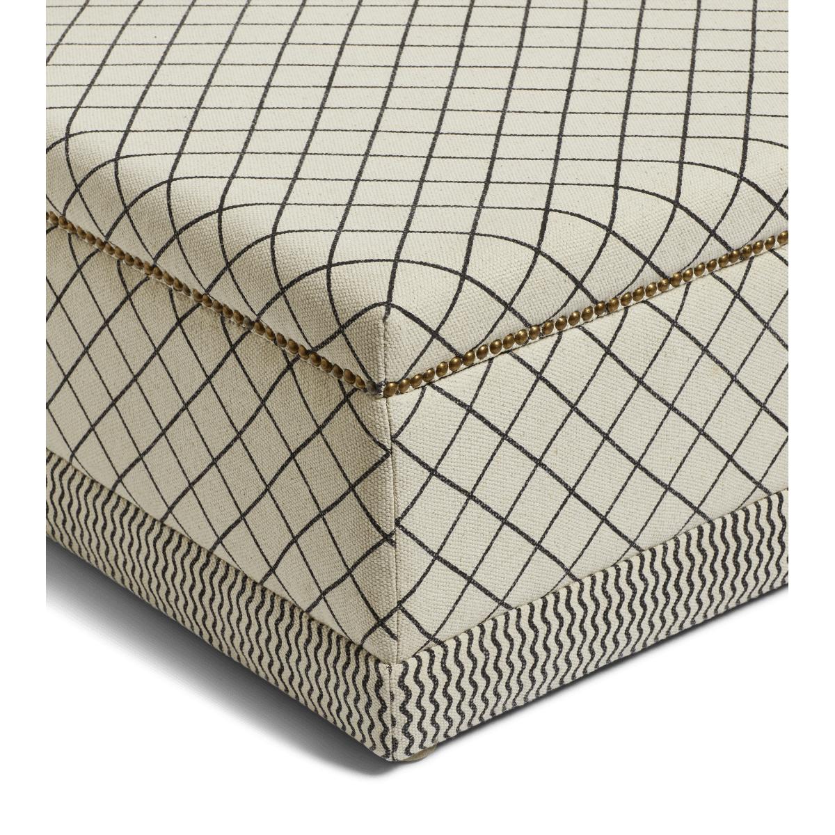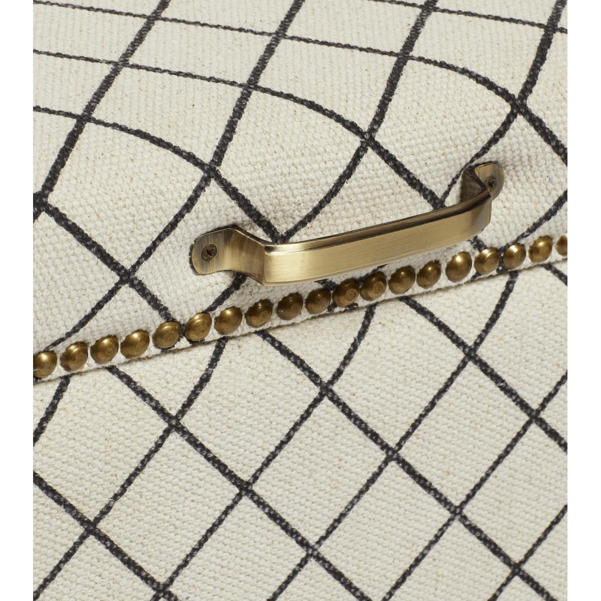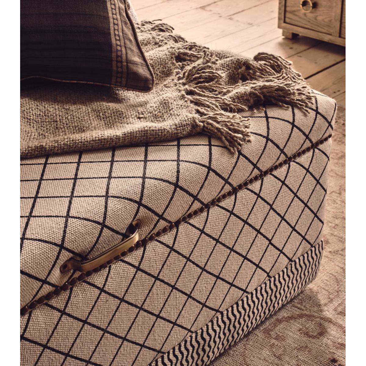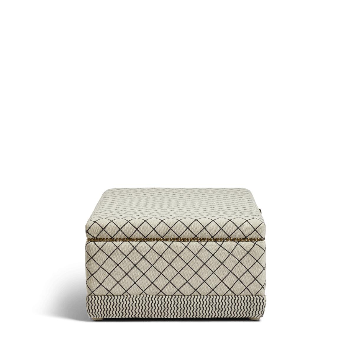Pleasingly simple in pattern, the Agnes is also exceedingly practical in design. Its diamond print is complemented by a wavy stripe at its base which adds dimension and lends it its name – the village of St Agnes is a popular surfing spot on the north coast of Cornwall. Made from mango wood and upholstered in a printed cotton dhurrie, Agnes can be used as an extra surface, a seat or as storage. Its lid opens on brass hinges that match the decorative studs and handles, and will stay open when lifted.
