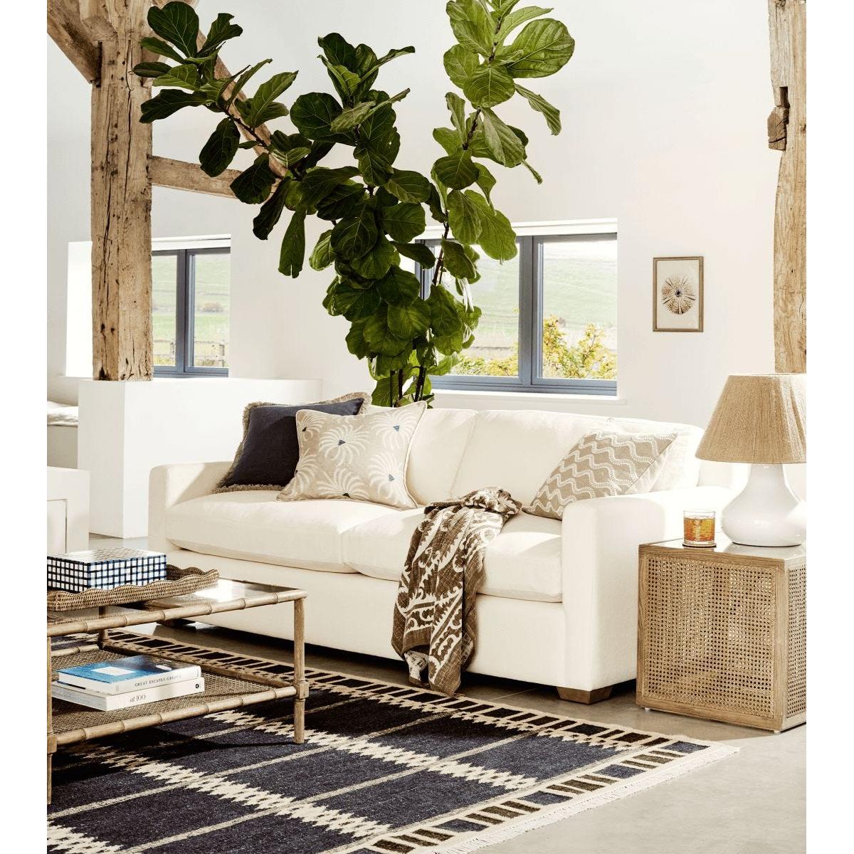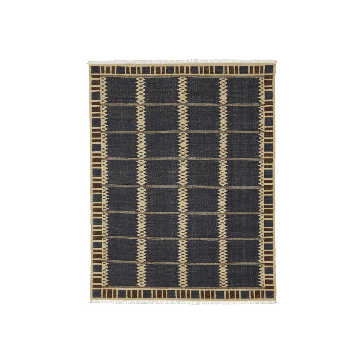 The Alarik's blue pattern was designed in celebration of the beautiful textiles of Barbro Nilsson. To make each rug, yarn is first turned by hand on a wheel, dipping it into a vat of dye that gives it its colour, then it is hung to dry in the sun, giving every single thread individual characteristics. Neutral-coloured yarn is then pulled tight vertically on a loom and different coloured threads are intricately woven horizontally into a pattern by hand. This type of kilim weave requires a huge amount of skill, passed down through families from generation to generation, and is an intricate, artisanal process that results in each rug being utterly unique. Kilims have been used for millennia to bring warmth, decoration and communication through their colourful symbolic motifs, differing from other styles of rug due to their flat, tapestry-like texture.