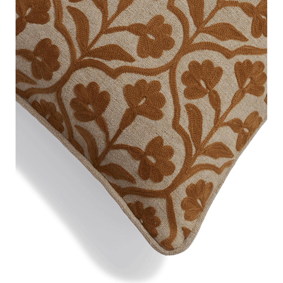 The intricate embroidery of our Allamanda Cushion Cover is completed using a special technique called ‘Aari’, which utilises a hooked needle for more delicate designs. The natural-dyed cotton base is tumbled with stones for a muted appearance before being topped with the complementary rust-toned floral pattern.
