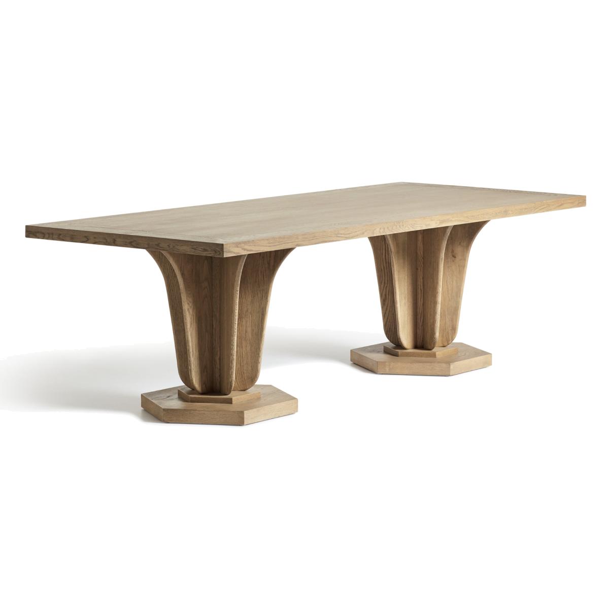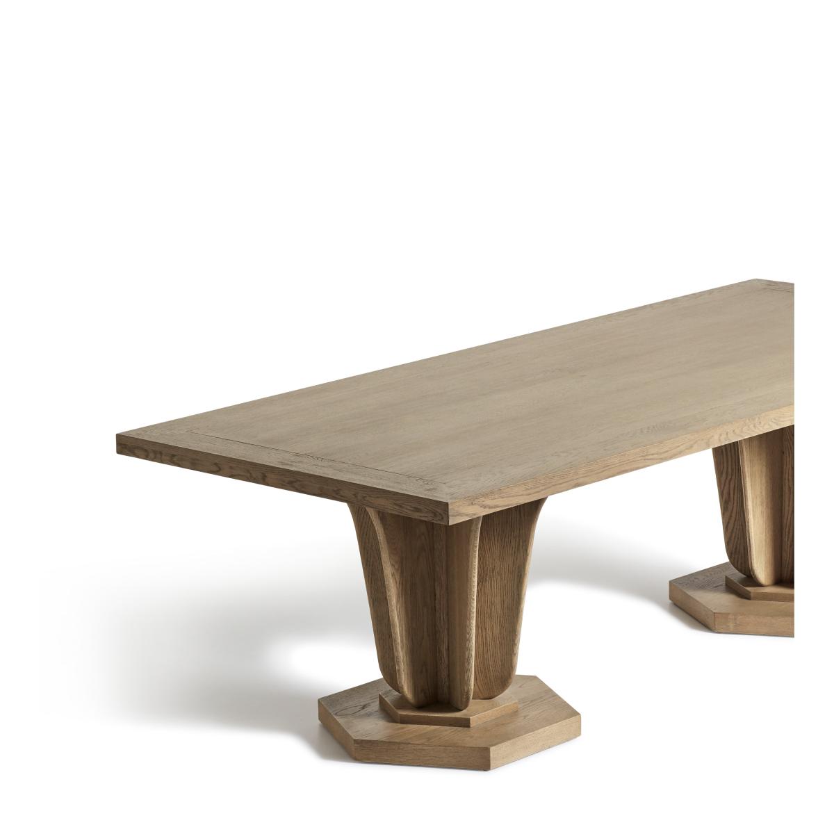 Our Allegro Dining Table features a base that flares upwards and outwards comparably to a gramophone, which lent it its musical name. This is the middle size of our three rectangular versions, though it is also available in two round variations. Round tables create a more intimate experience while the linear version is a more traditional choice. All the tops feature an indentation that frames the edge, drawing attention to the character in the textured grain of the oak. This version comes in a light Weathered Oak, but it is also available in a warm Burnt Oak finish.