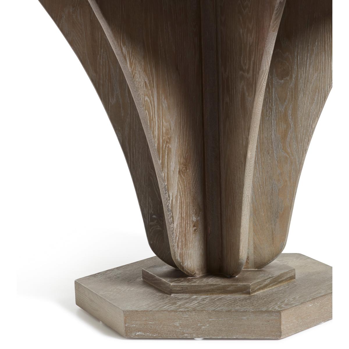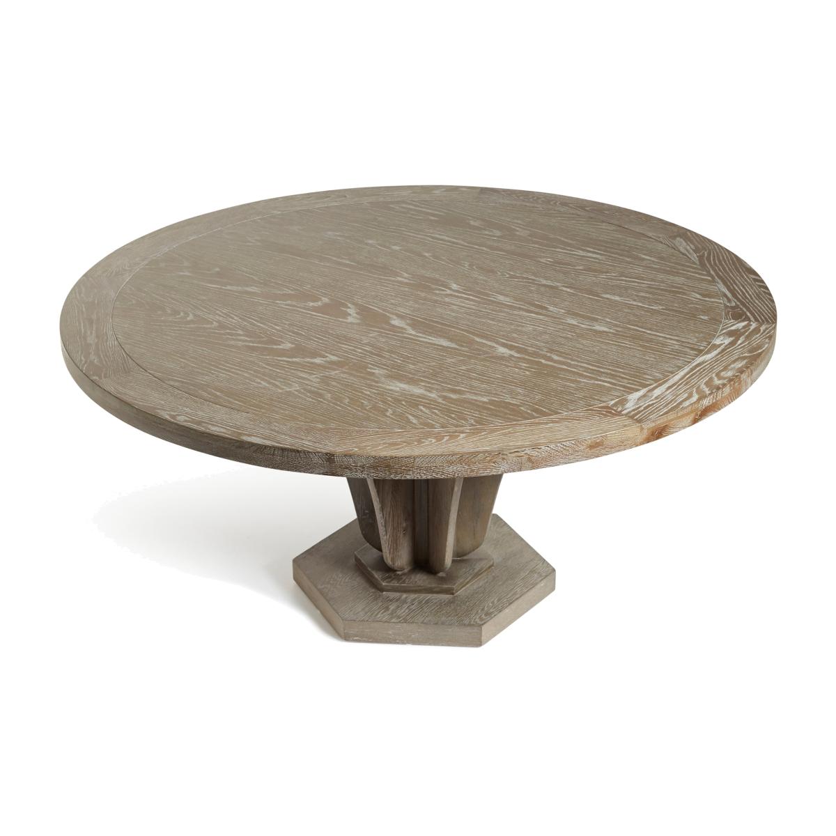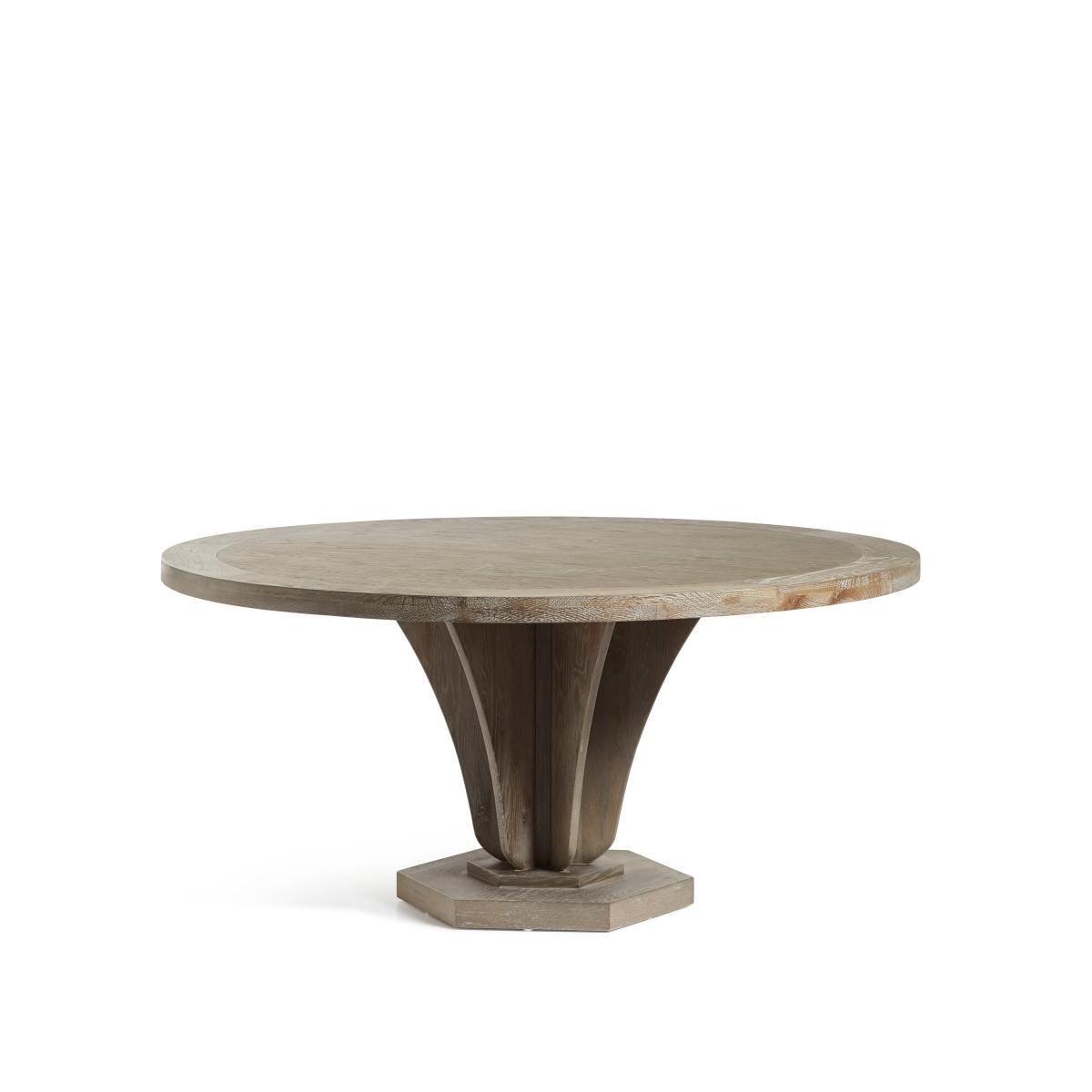 Our Allegro Dining Table features a base that flares upwards and outwards comparably to a gramophone, which lent it its musical name. This is the larger of our two round versions, though it is also available in three rectangular variations. Round tables create a more intimate experience while the linear version is more traditional. All the tops feature an indentation that frames the edge, drawing attention to the character in the textured grain of the oak. This version comes in a warm Burnt Oak, but it is also available in a paler Weathered Oak finish.