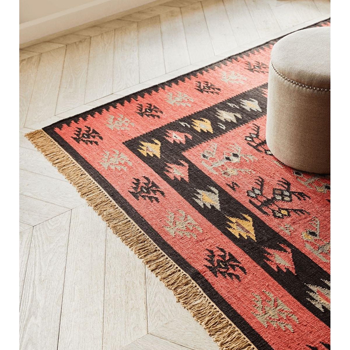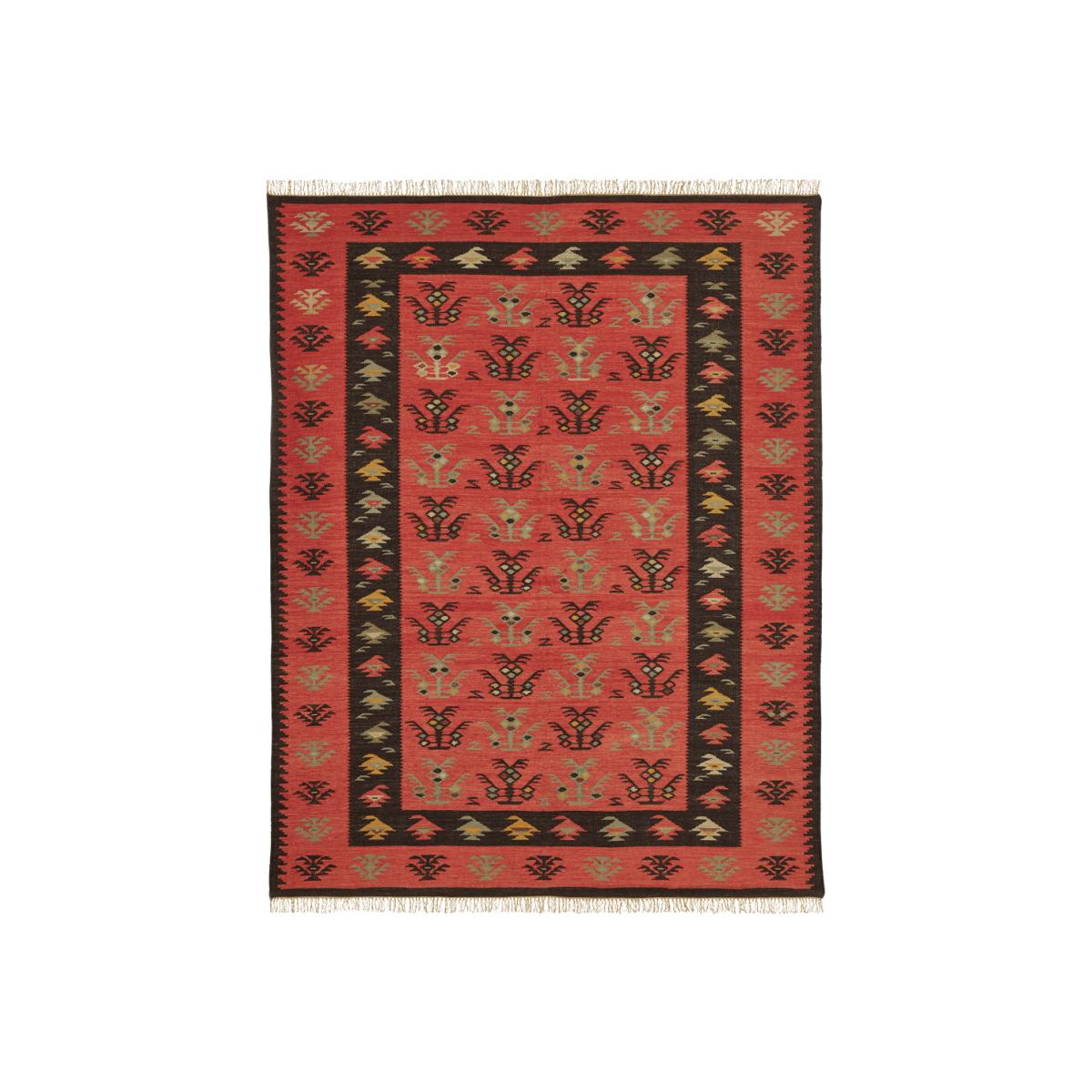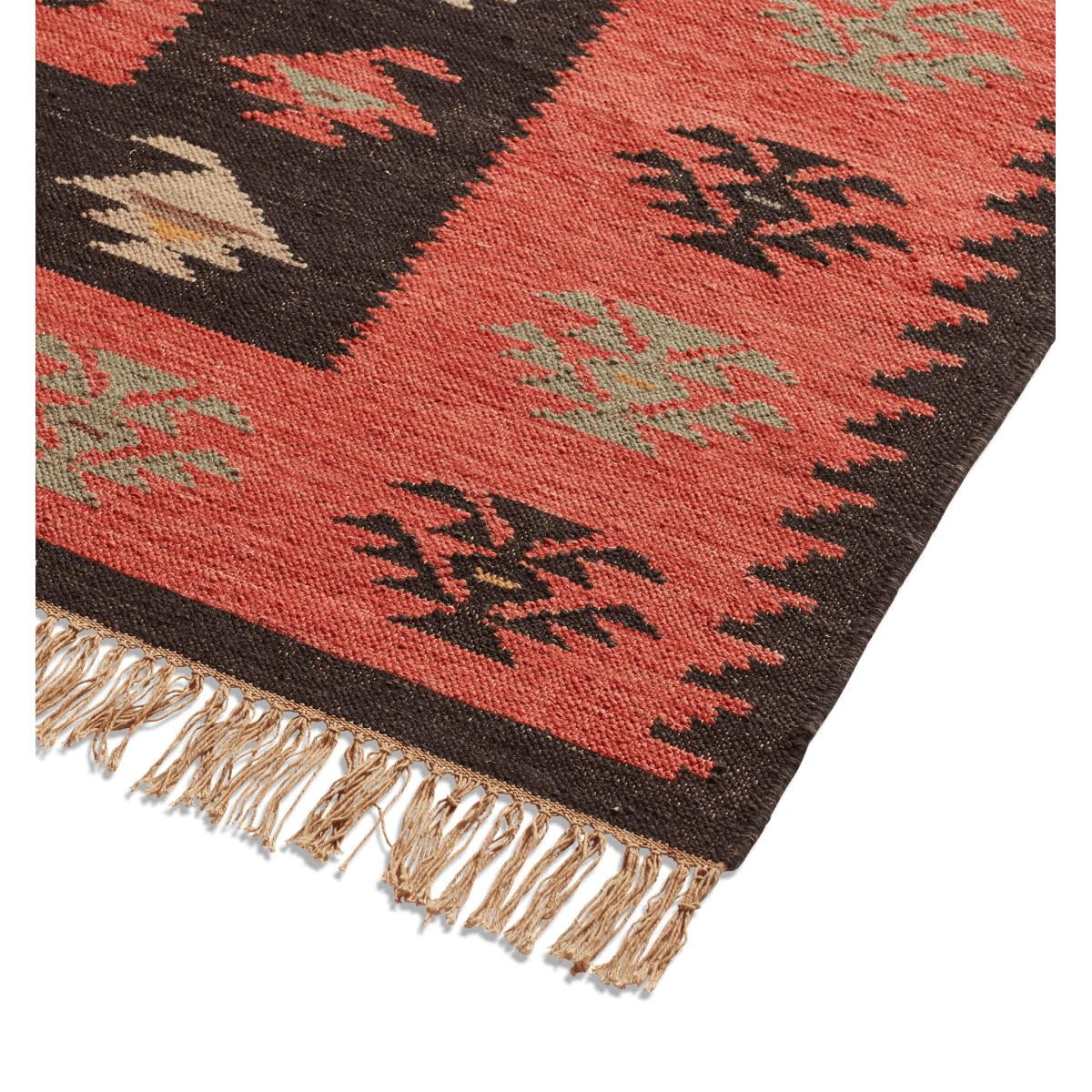 The name Amarya – meaning ‘unfading flower’ – was brought to mind by the bright and bold colours of this rug, along with its abstract floral motifs. The design is handwoven on an authentic and traditional Kilim loom, just like the designs that have inspired it, and features rich reds, pale blues and bright golds, framed by a concentric border and a neutral fringe. The origins of kilims range from Balkan regions through to Northern Africa, which is what makes them complementary to so many design styles. Kilims differ from knotted rugs as they are interwoven from variously coloured wefts (horizontal yarns) and warps (vertical yarns) to create a flatwoven tapestry rug with no pile. They often have stepped, diagonal patterns which are formed through their distinct weaving technique in which the yarn turns around the warp where the colour changes, rather than running across the full width of the piece.