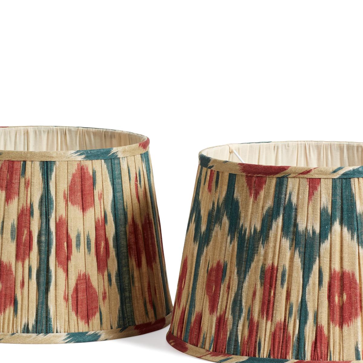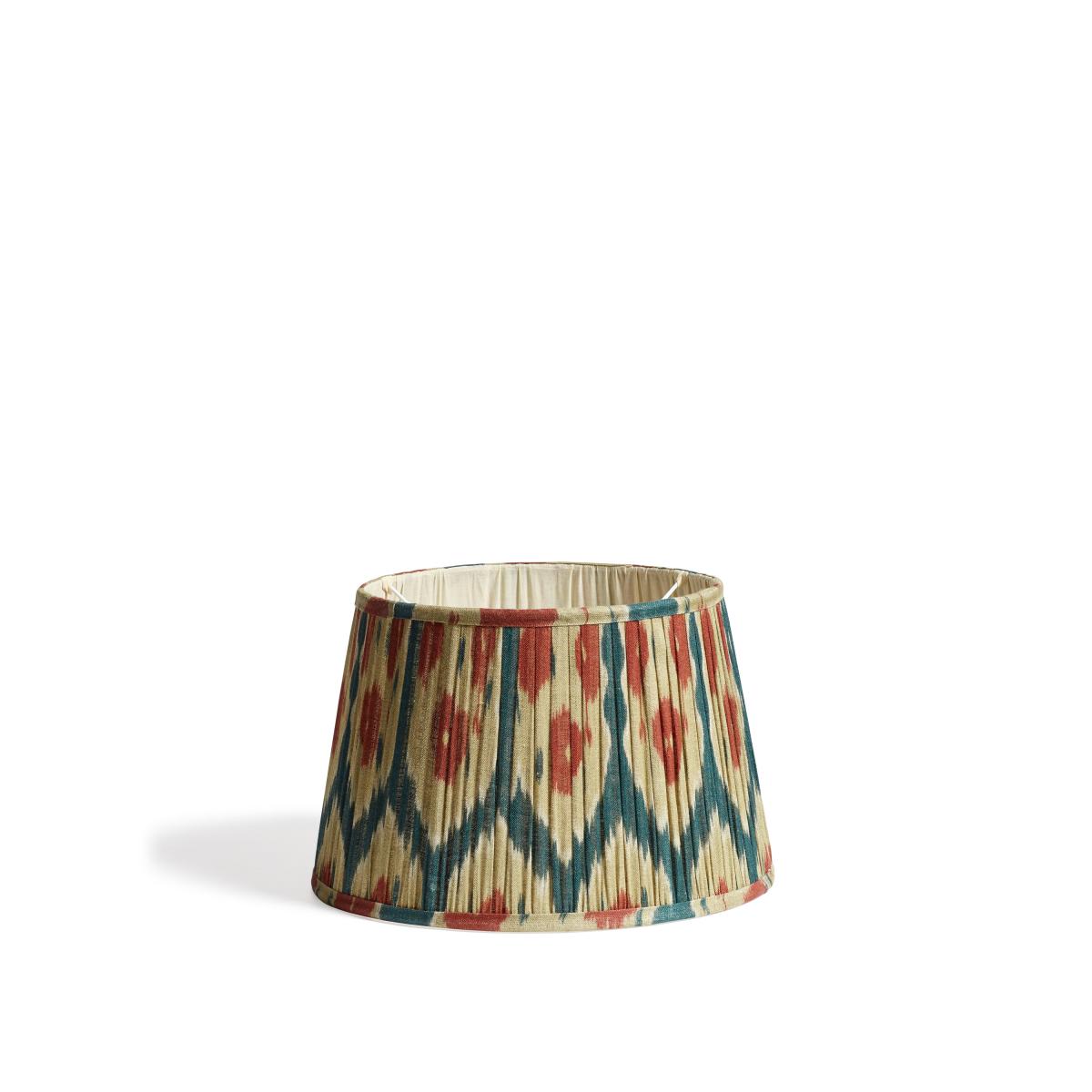 Our pretty pleated Amisha Lampshade is handmade from linen, wrapped around an iron frame. The linen is lined with cream cotton which gives the light a warm glow when switched on. Printed in blue and gold.