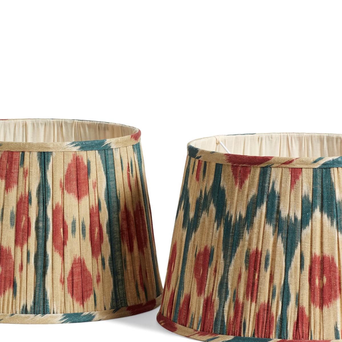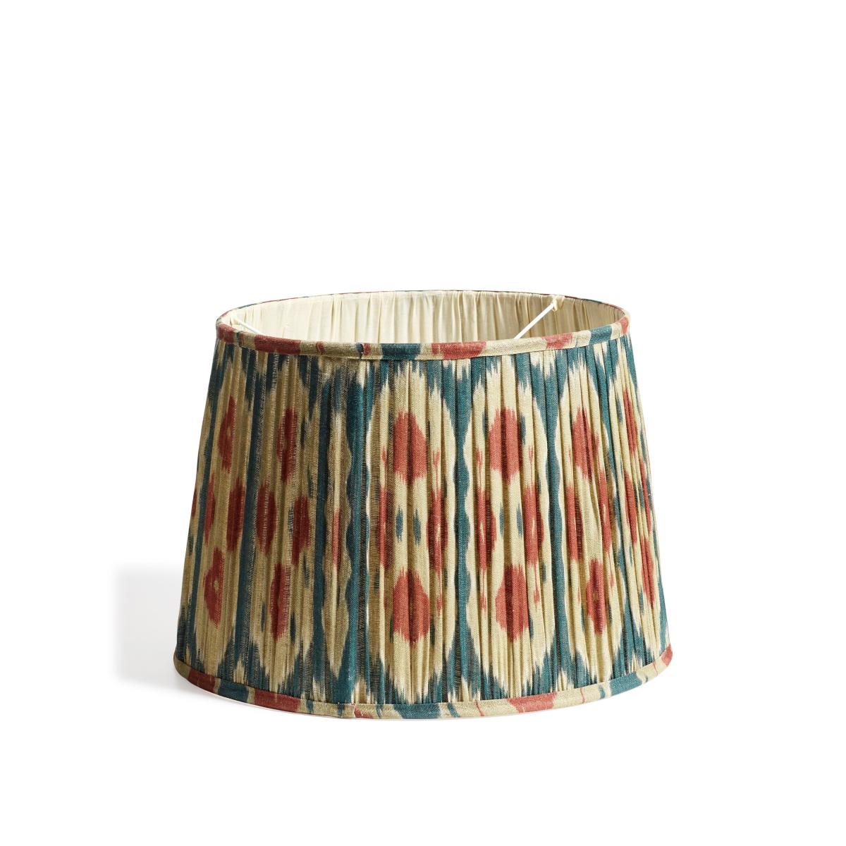 Our pretty pleated Amisha Lampshade is handmade from linen, wrapped around an iron frame. The linen is lined with cream cotton which gives the light a warm glow when switched on. Printed in blue and gold.