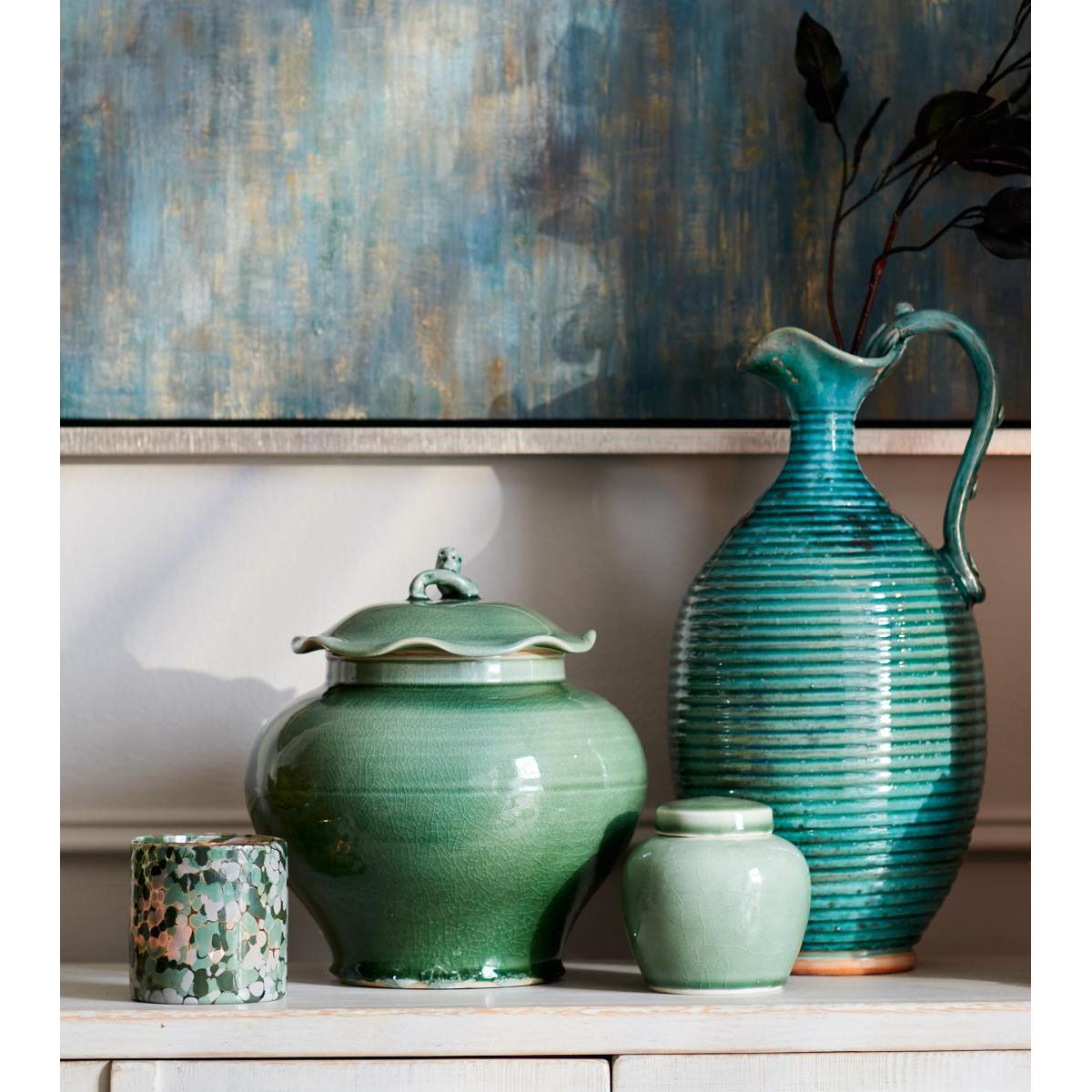 I love this green lidded pot for its versatility and clean lines, making it a great addition to both modern and classic interiors. Its jade hue adds a pop of colour without overpowering a space, and the glazed finish gives it a sophisticated touch. It works particularly well in neutral schemes, serving as a subtle focal point on shelves or side tables. For styling tips, consider pairing it with natural textures like wood or rattan, and use it to contain small plants, dried arrangements, or even as a decorative storage piece. Its compact size makes it ideal for desks, consoles, or bathroom shelves, bringing a polished yet practical finish to various spaces.