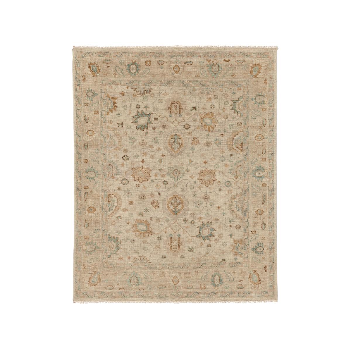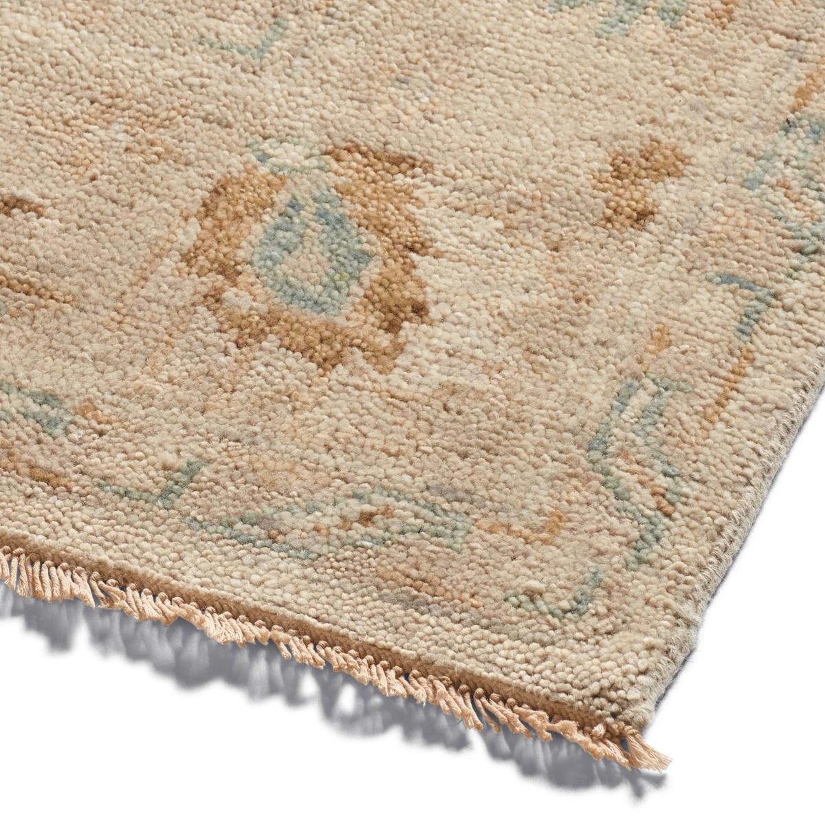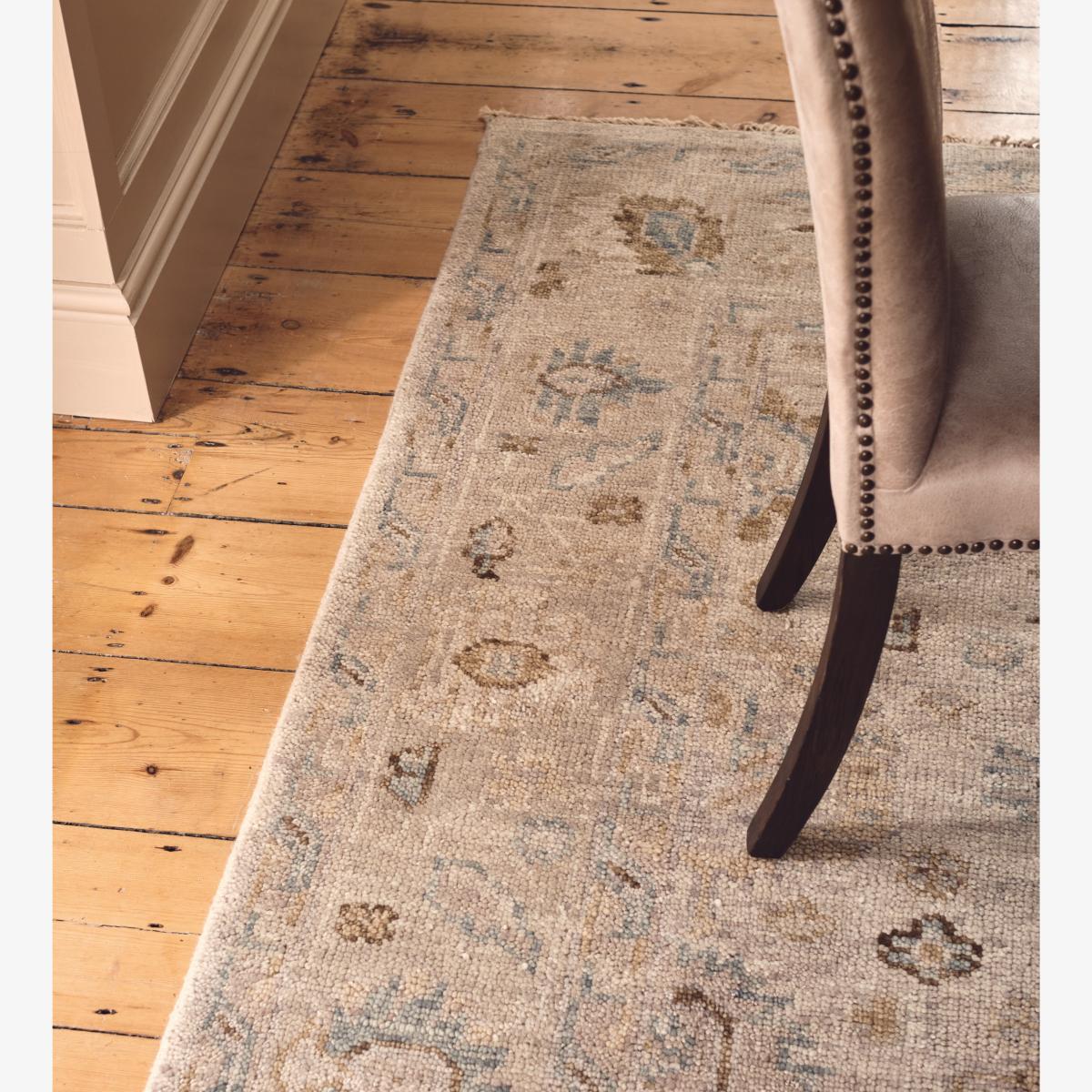 Our Anoushka Rug has a design inspired by traditional Persian rugs with its floral motifs and framing border. The pattern is hand knotted by skilled artisans using a New Zealand wool blend that is first hand spun into yarn and hand dyed. Once woven, the rug is hand washed for an antique effect. Due to this artisanal process, there will be individual characteristics and slight colour variation from piece to piece, adding to their charm.