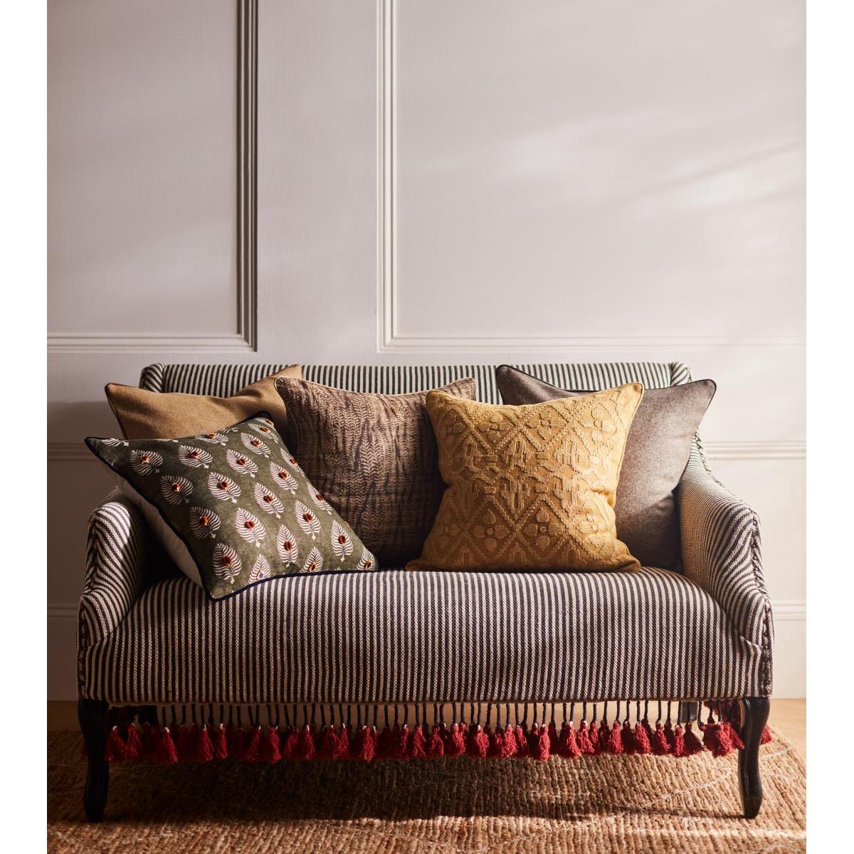 The Apricia will bring a sunny disposition to your interiors with its Ochre yellow hue and chunky cord embroidery. The linen is initially dyed a solid colour, then given a mineral wash that lends it varying rich bronze tones. As a result of this artisanal process, each cushion cover will have individual characteristics which add to their charm.