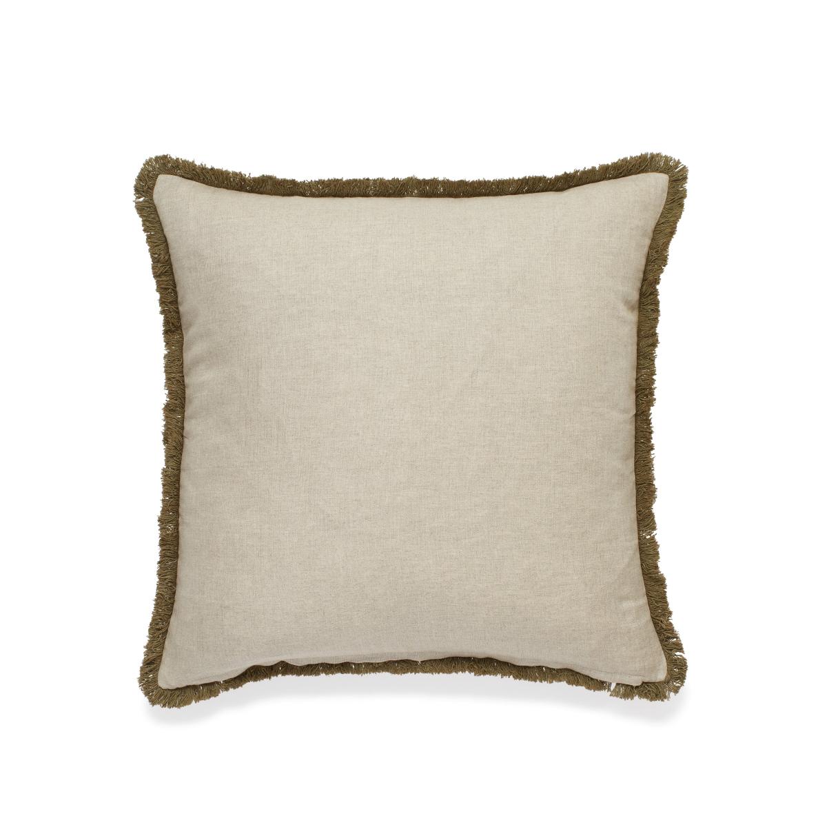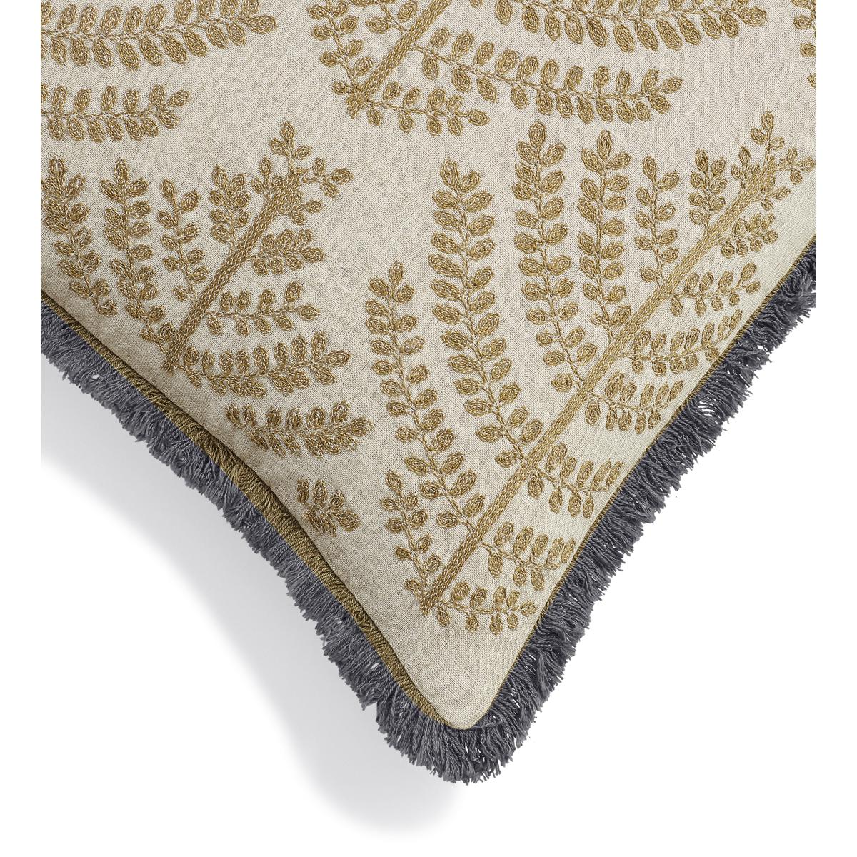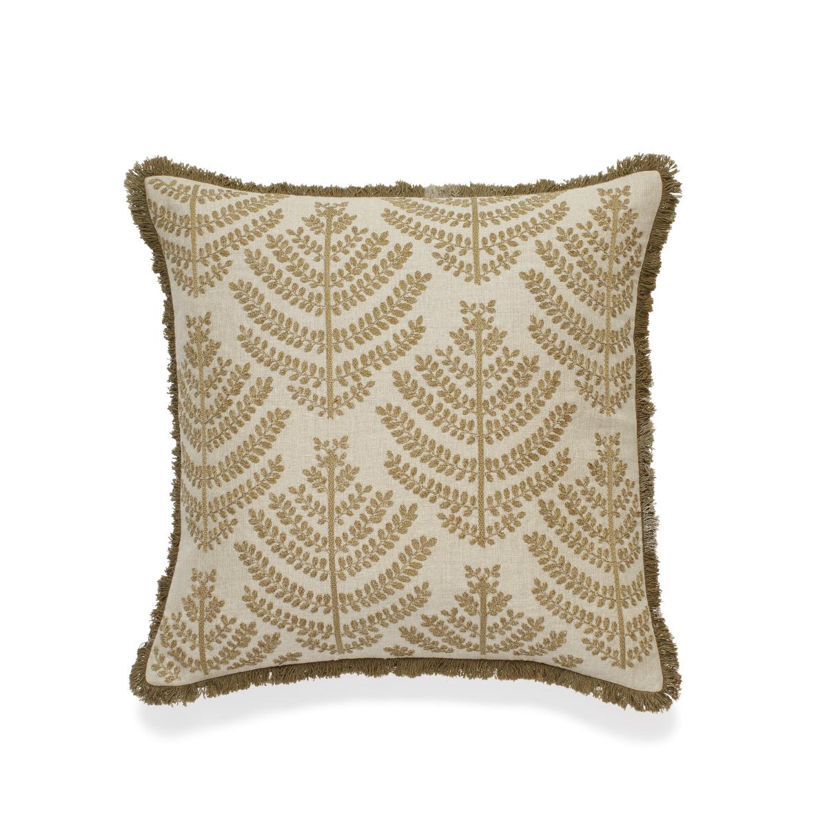 Our Arber Cushion Cover features a pretty repeating embroidery pattern of a leafy branch. The green yarn is secured on the linen base with careful white stitches and matched with a muted green fringe that surrounds the cushion.