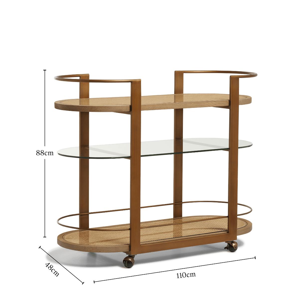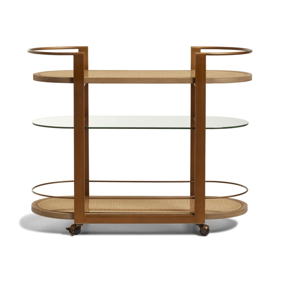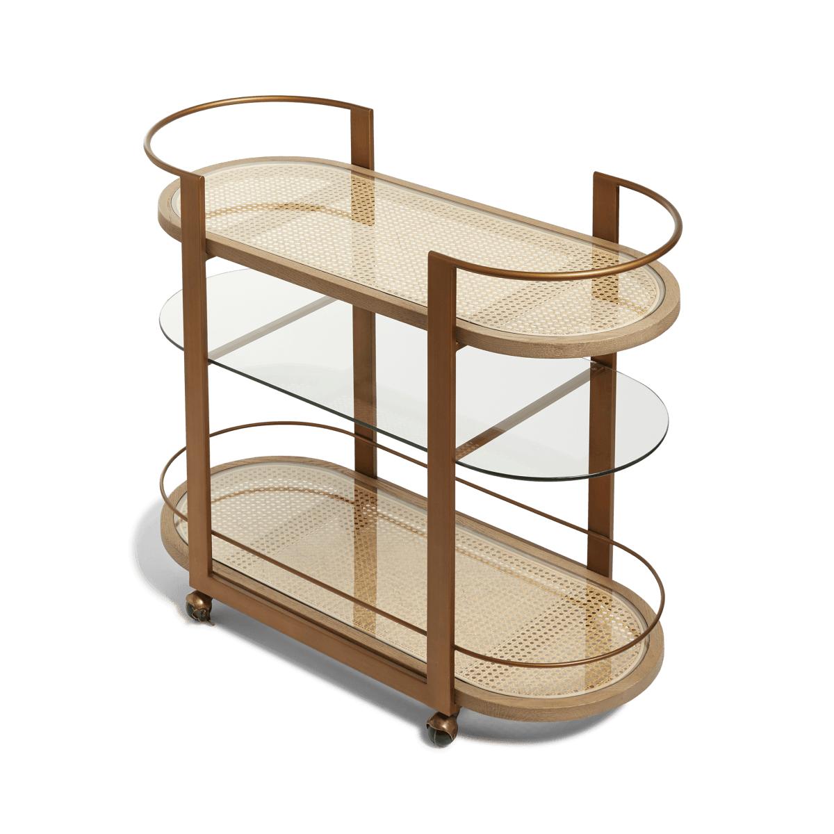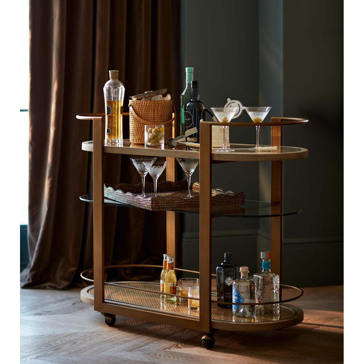 Answering the call for drinks trolleys with style is the oak and cane Arnold. It features a curved 1920s-style design, which is complemented by said natural materials and a bronze-painted finish. Glass panels sit atop the cane shelves so that you can focus less on spills, more on crafting and enjoying your drinks. It sits on castors, meaning you can wheel your creations wherever you please.